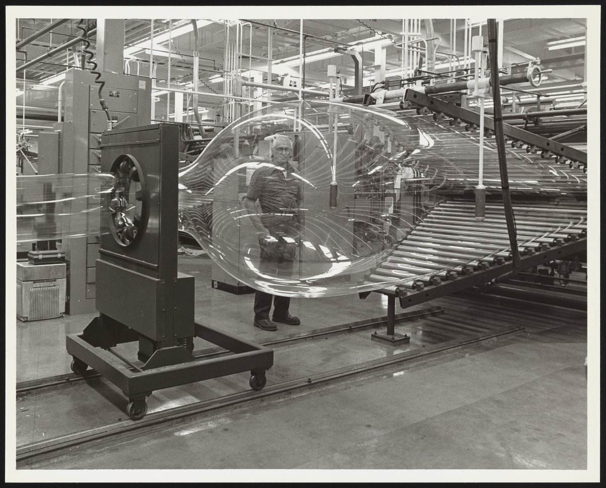 General view of employee Louis Vallaincourt observing the extrusion of a saran bubble from a rolling machine at the Dow Chemical Company plant in Midland, Michigan. During production, saran film passed through a series of rollers, which deflated the bubbles and prepared the film for winding on rolls. Initially developed for the U.S. Army to wrap arms and equipment for transport during World War II, saran plastic was subsequently developed and marketed as Saran Wrap for household use.