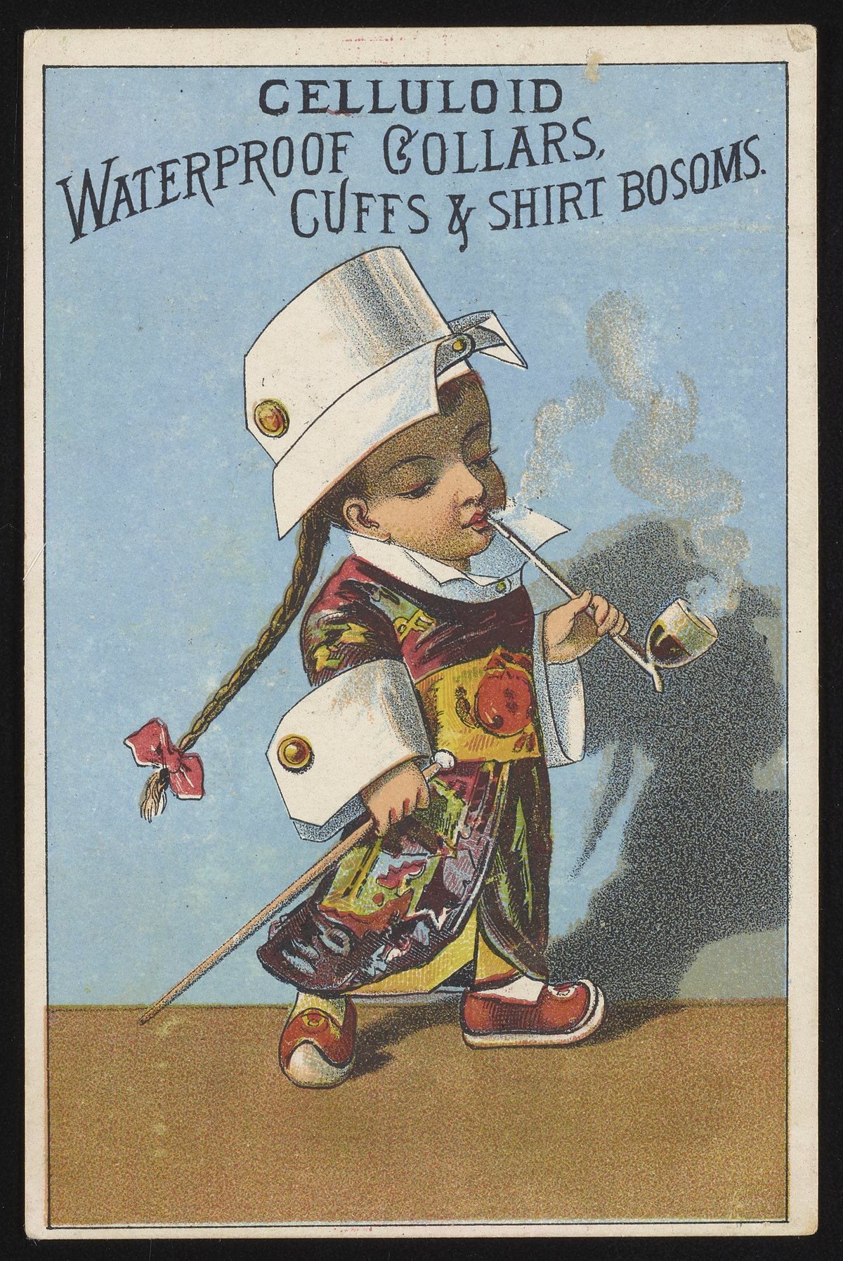 Trade card for waterproof celluloid collars, cuffs, and shirt bosoms featuring a racially stereotyped depiction of an Asian boy smoking an opium pipe. A celluloid cuff and collar adorn the boy's exaggerated Asian-style clothing. The verso of the card is blank.