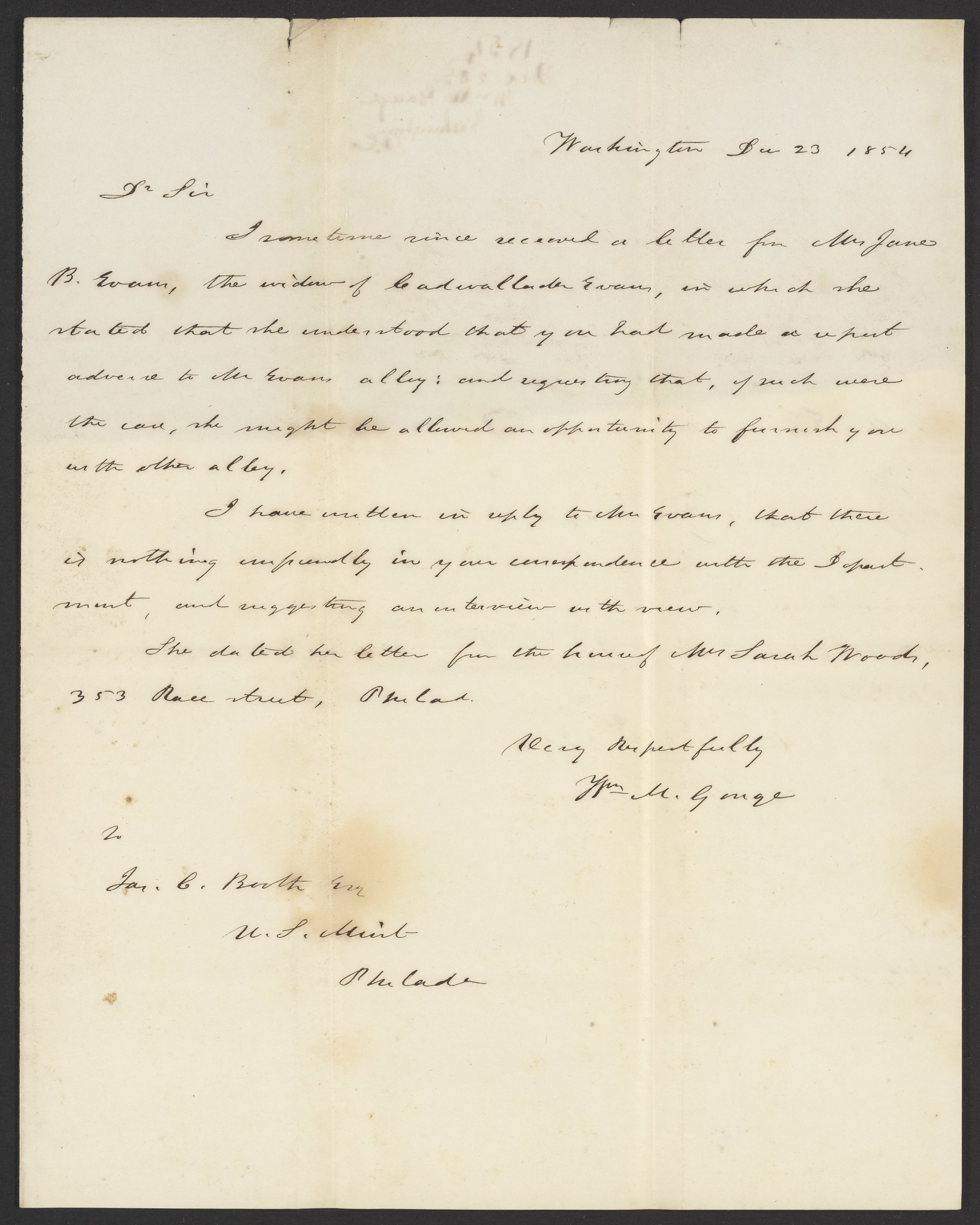 “Letter from W.M. Gouge to James Curtis Booth, December 23, 1854,” December 23, 1854. Papers of James Curtis Booth, Box 1, Folder 6. Science History Institute. Philadelphia. https://digital.sciencehistory.org/works/8ffeity.