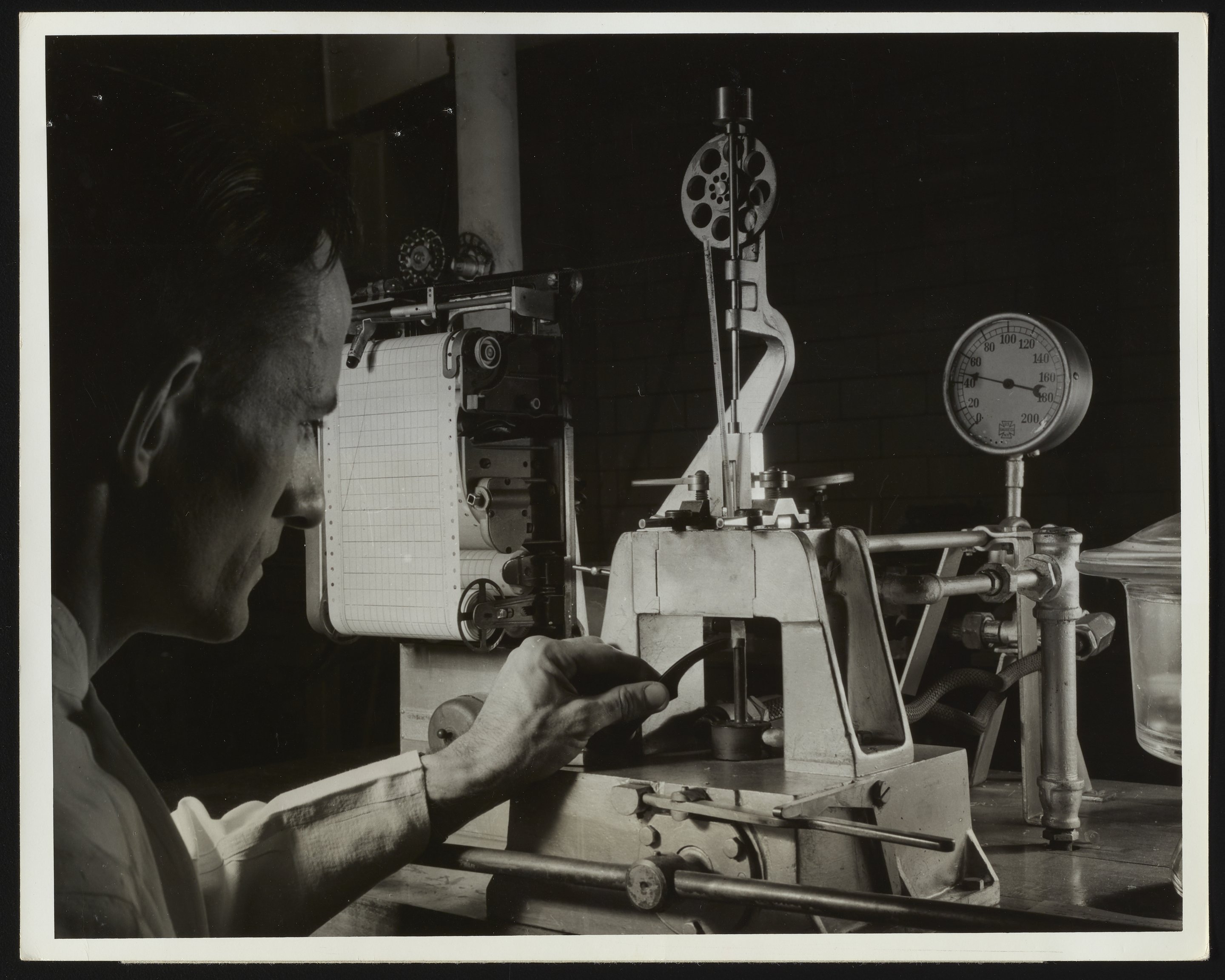 Hercules Incorporated. “V.F. Kurowsky Operating Flow Measuring Device at Hercules Parlin Plant,” January 1949. Photographs from the Records & Ephemera of Hercules Incorporated, Box 2, Folder 25. Science History Institute. Philadelphia. https://digital.sciencehistory.org/works/8g84mm97j.