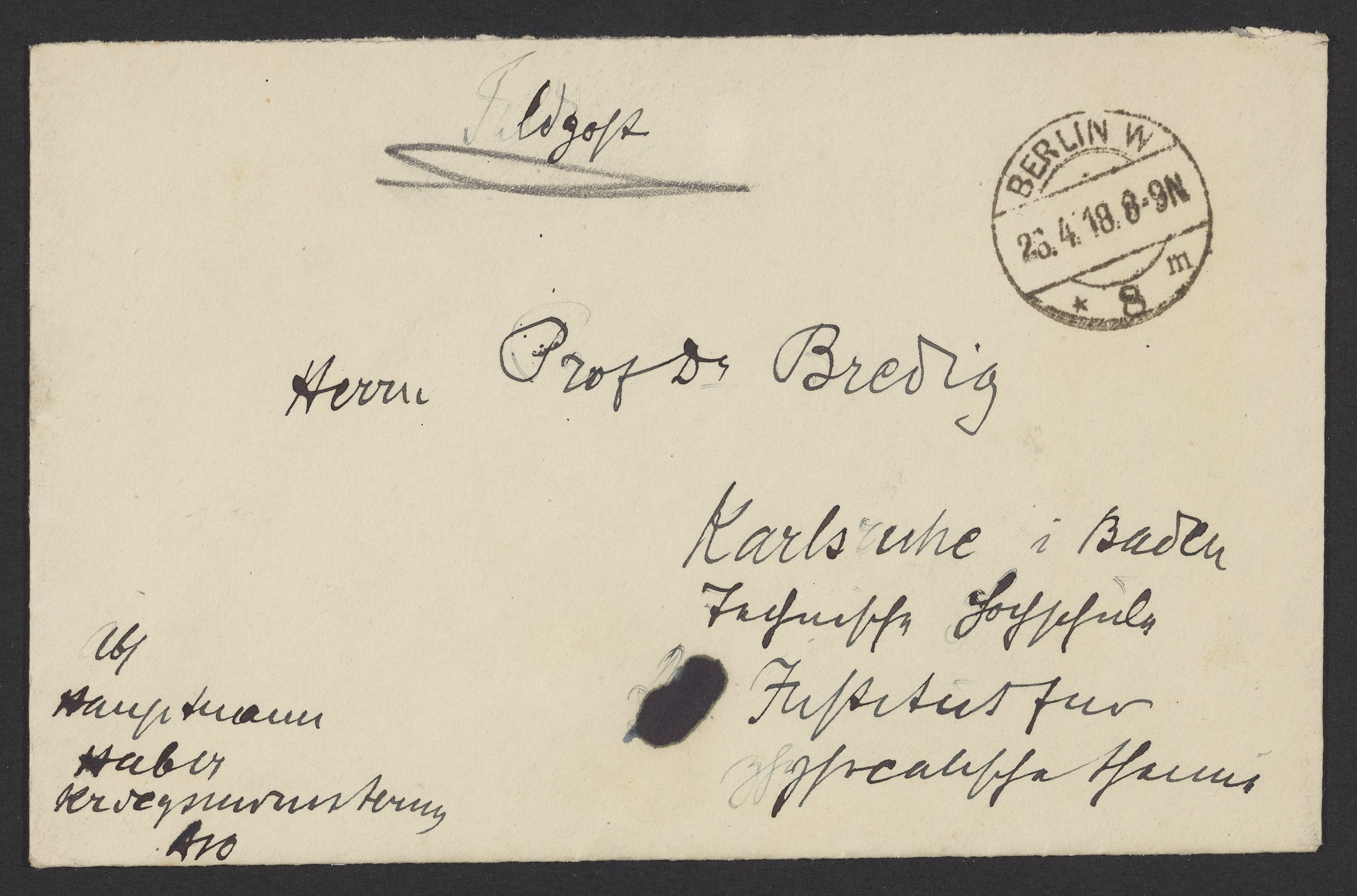 Small JPG1200 x 793px — 135 KBLarge JPG2880 x 1903px — 749 KBFull-sized JPG3750 x 2478px — 1.2 MBOriginal fileTIFF — 3750 x 2478px — 26.6 MBEnvelope belonging to a letter from the German chemist and Nobel Prize winner, Fritz Haber (1868-1934), which is addressed to his friend and colleague, Georg Bredig (1868-1944). At the time, Haber was serving as a captain in the Germany army during the First World War.