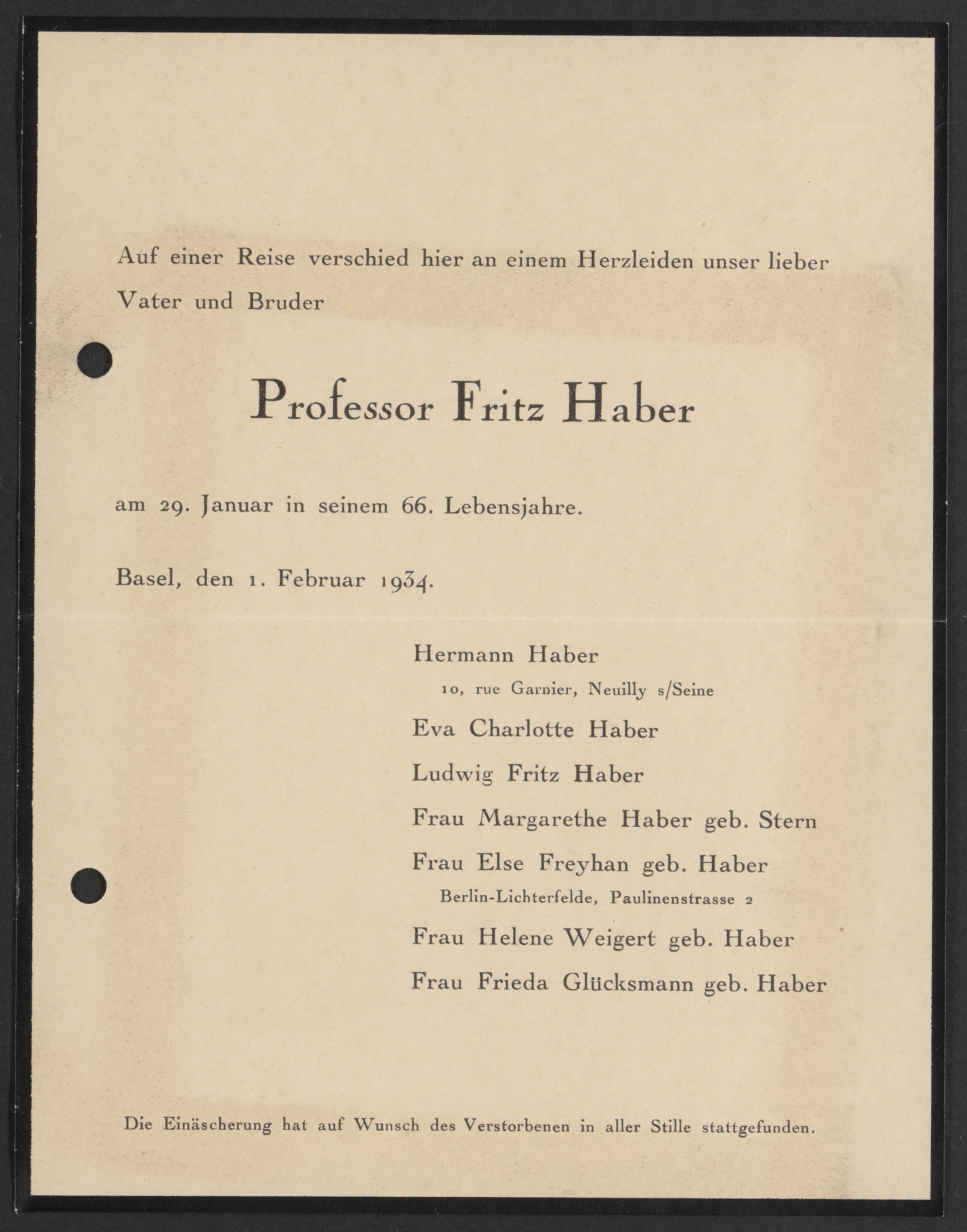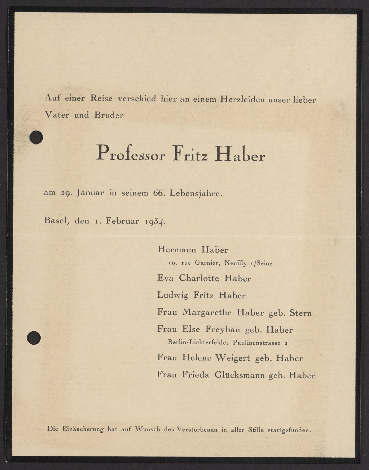 Fritz Haber's funeral card