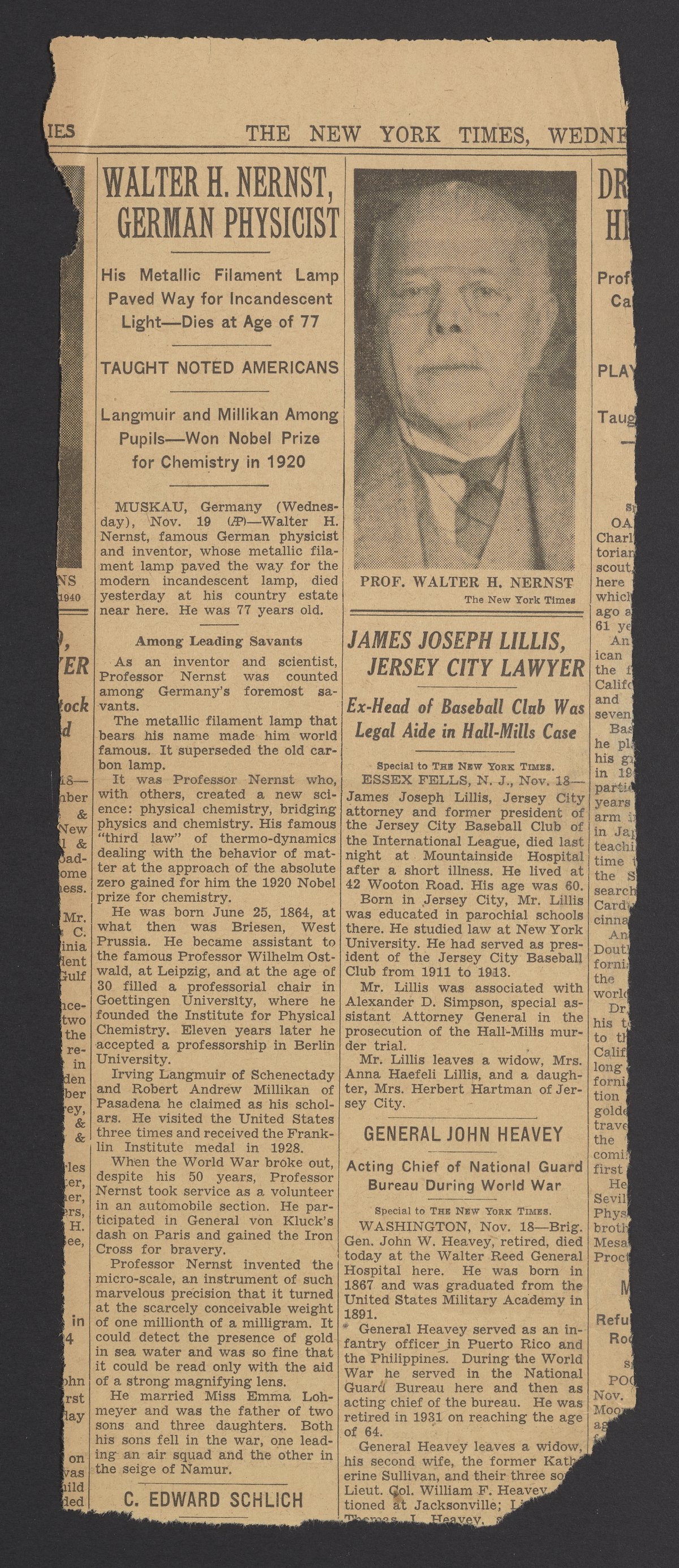 Small JPG1200 x 2771px — 863 KBLarge JPG2880 x 6651px — 4.4 MBFull-sized JPG3314 x 7653px — 5.6 MBOriginal fileTIFF — 3314 x 7653px — 72.6 MBObituary for Walter H. Nernst (1864-1941) from the New York Times.