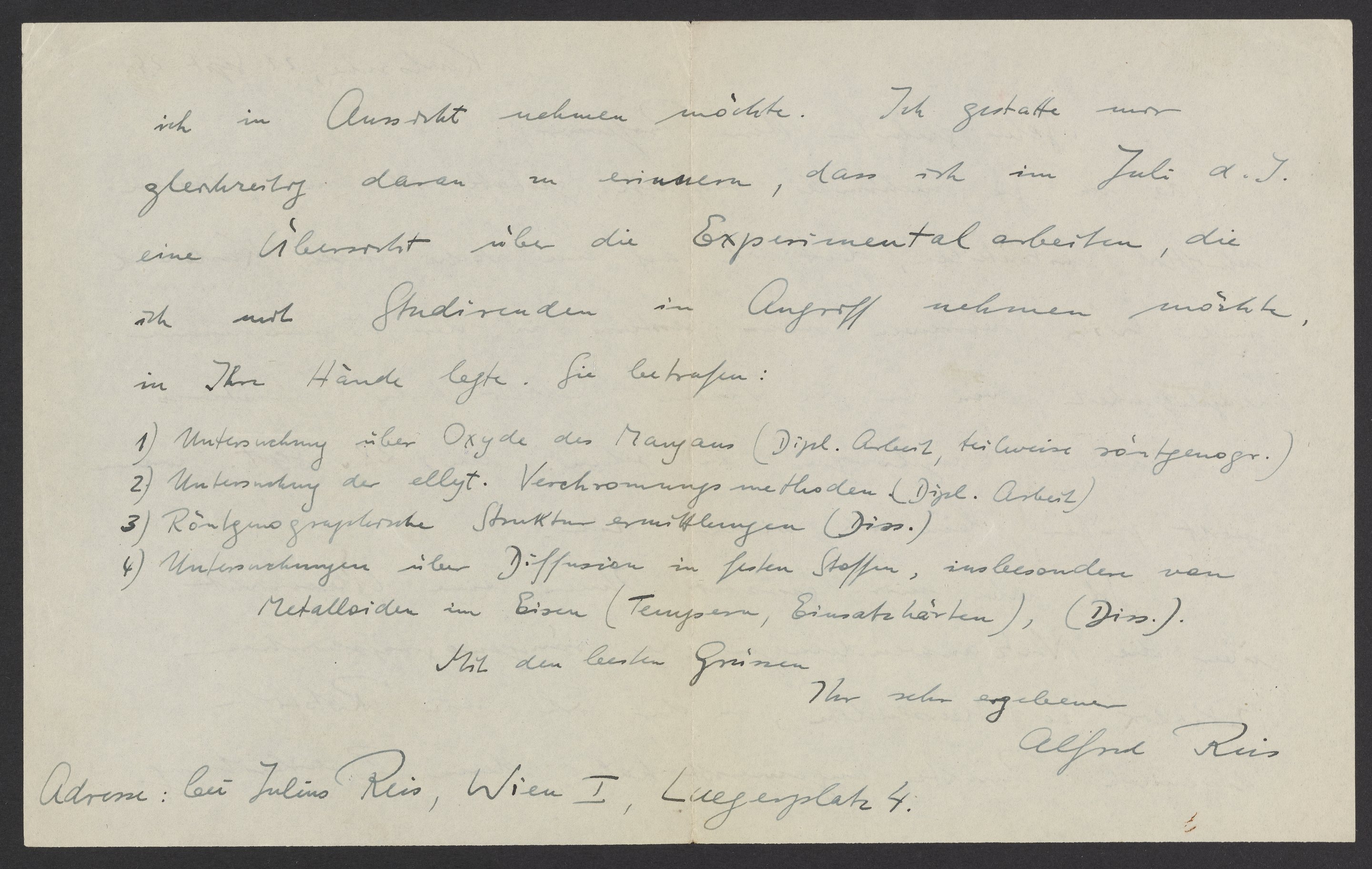 ich in Aussicht nehmen möchte. Ich gestatte mir gleichzeitig, daran zu erinnern, dass ich im Juli d.J. eine Übersicht über die Experimentalarbeiten, die ich mit Studierenden in Angriff nehmen möchte, in Ihre Hände legte. Sie betrafen: