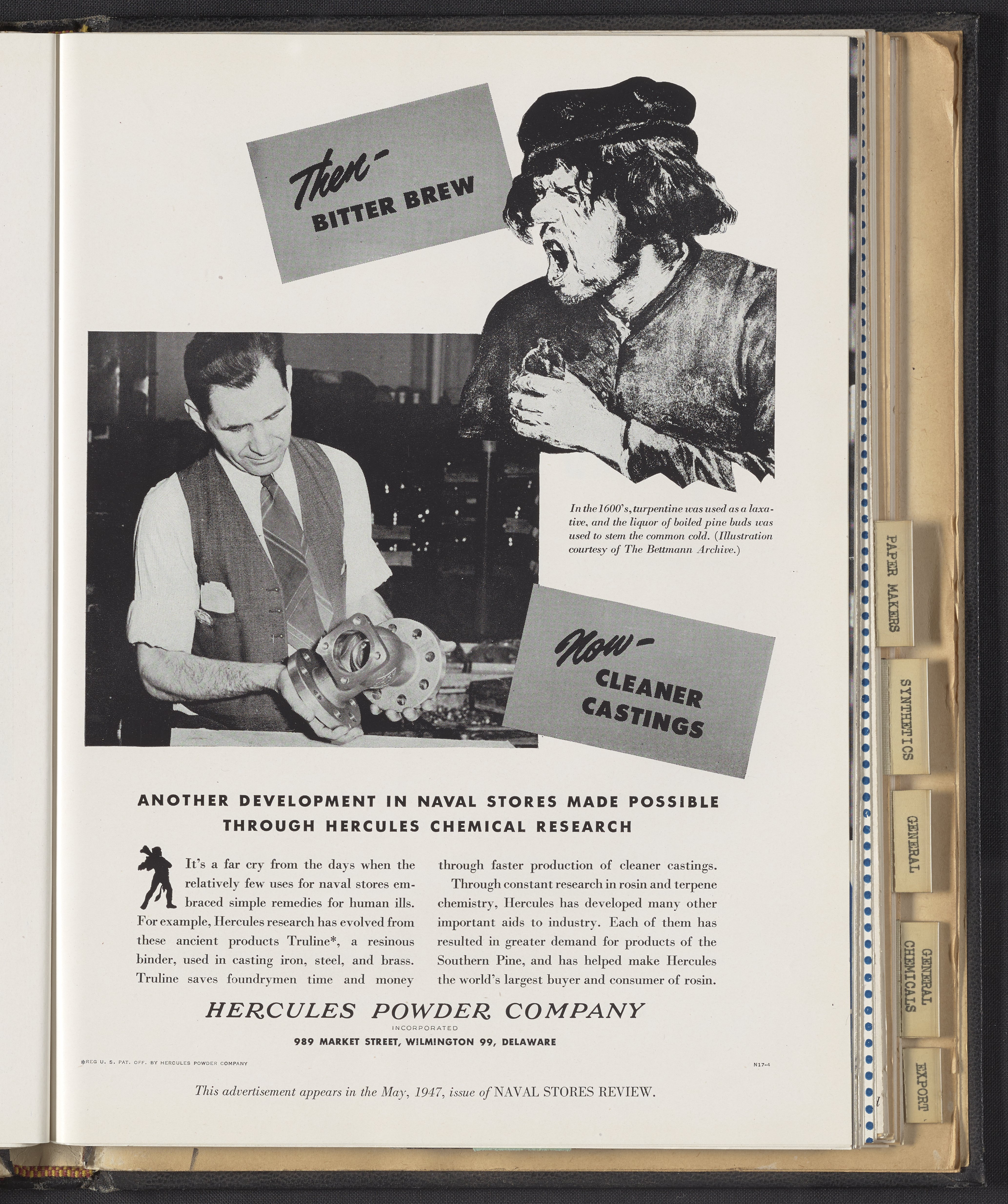 Hercules Incorporated. “Then, Bitter Brew...Now, Cleaner Castings.” 1947 Hercules Advertisements, 1947. Records of Hercules Incorporated, Volume 1947. Science History Institute. Philadelphia. https://digital.sciencehistory.org/works/8k71nj083.
