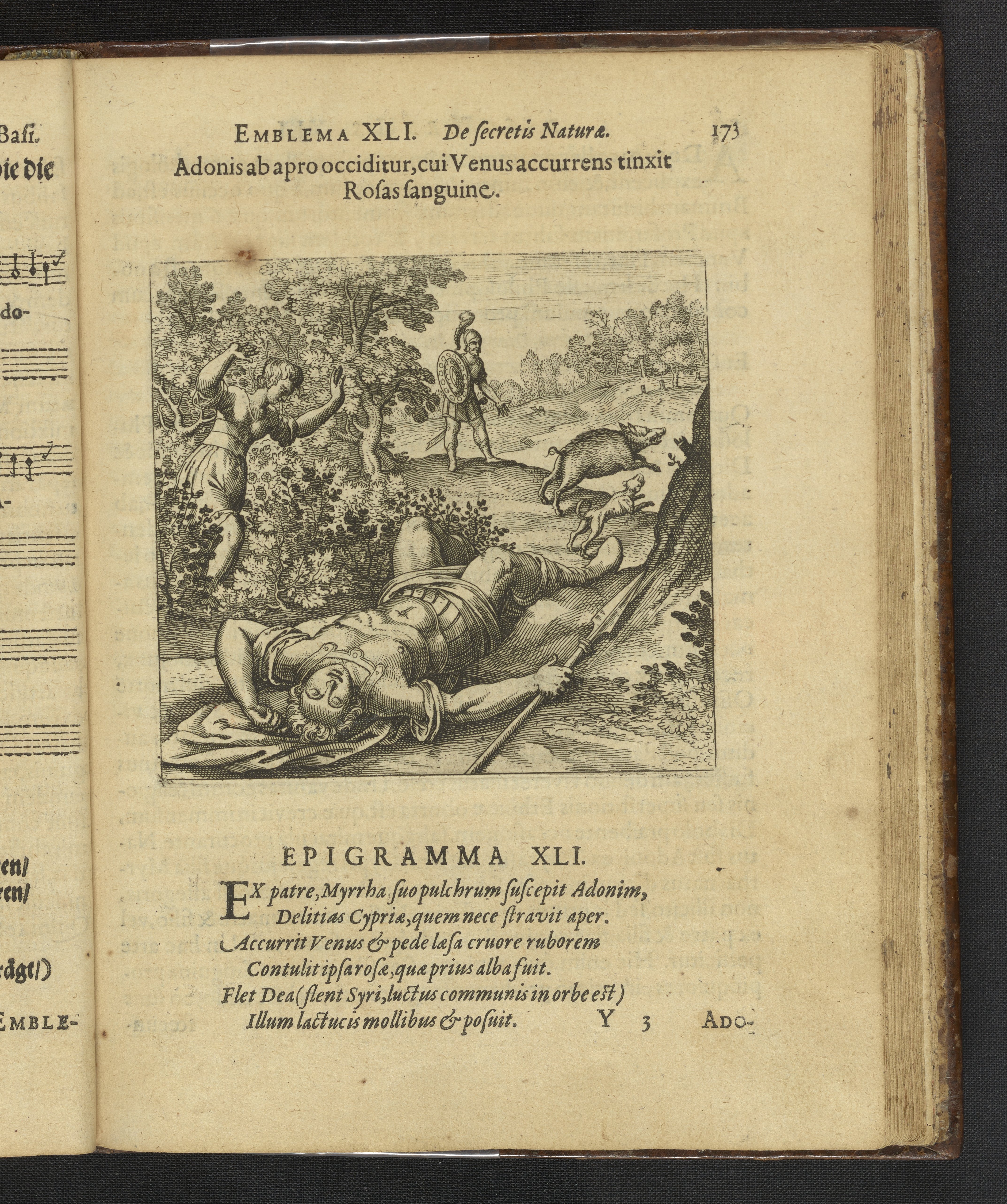 Emblema XLI. Adonis ab apro occiditur, cui Venus accurrens tinxit Rosas sanguine.