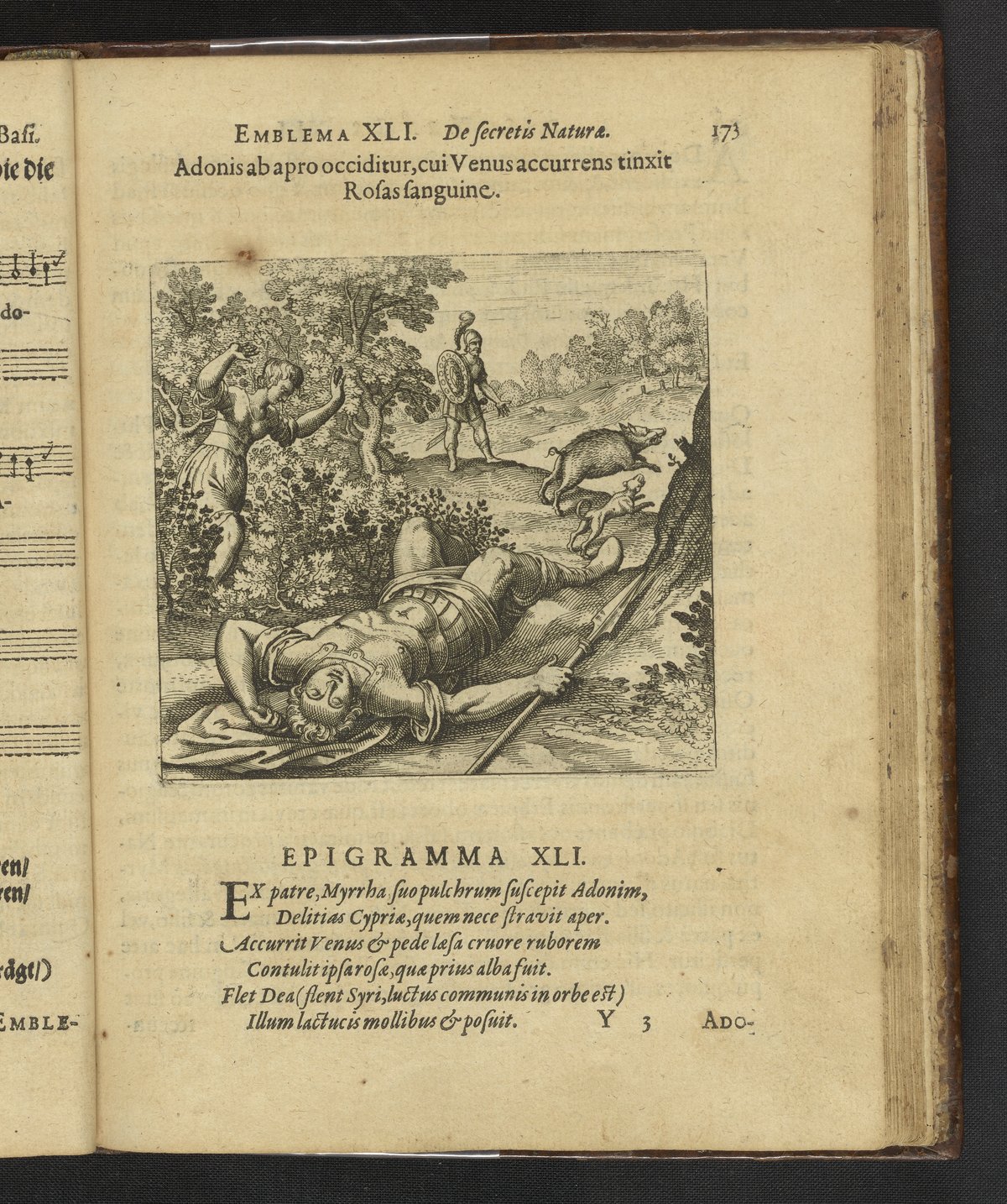 Emblem 41. Adonis is slain by a boar, and as Venus comes running she colors the Roses with her blood.