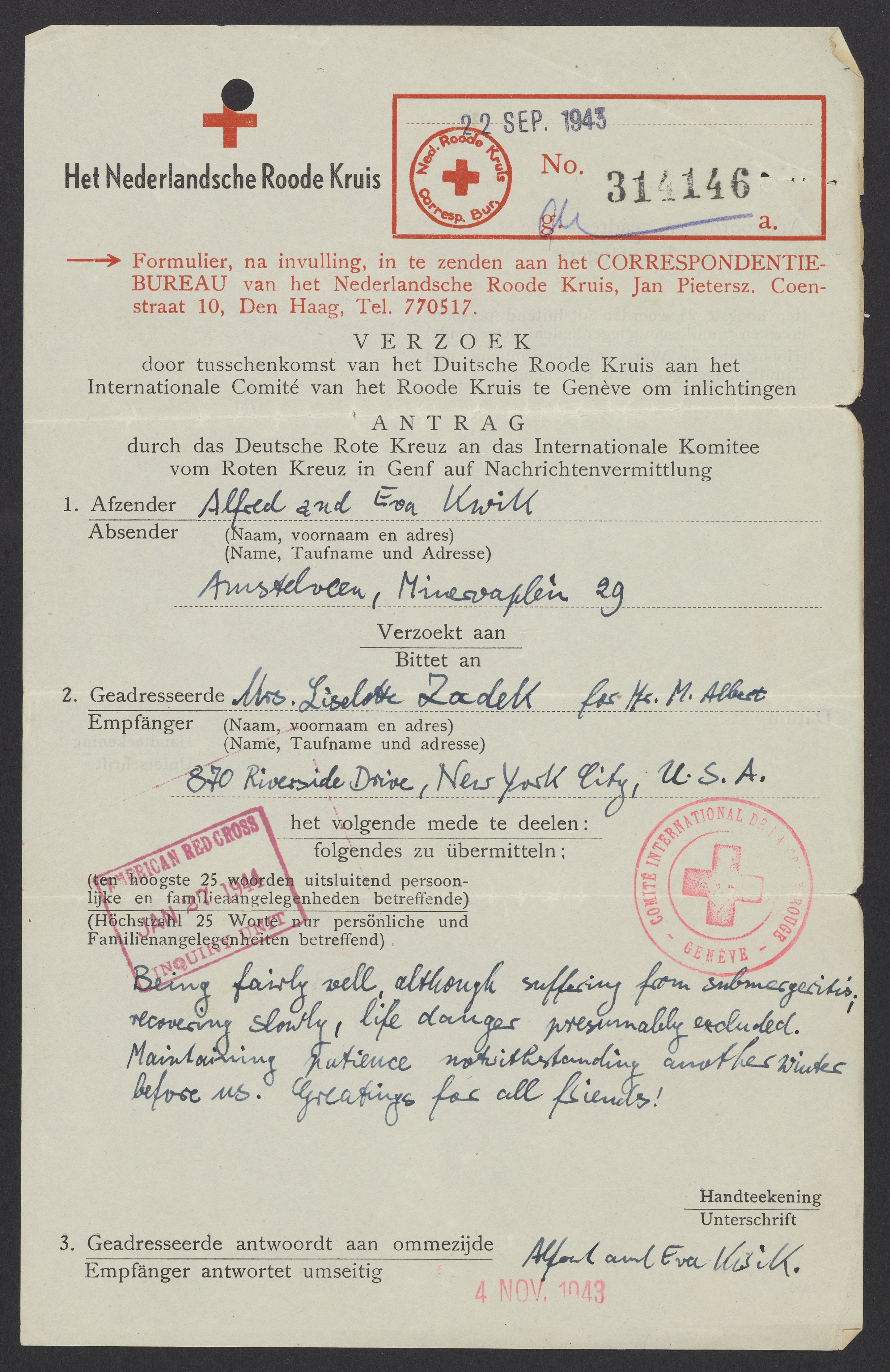 In this letter, the Schnells tell Zadek that they are ill with “submergeritis” but on the road to recovery. “Submergeritis” may be a code word for their dread of being in hiding through another winter. The Schells' mentions of health and recovery in their letters may be a cipher for conveying their safety or status in hiding. While the message is dated September 22, 1943, it was not received until January 27, 1944.