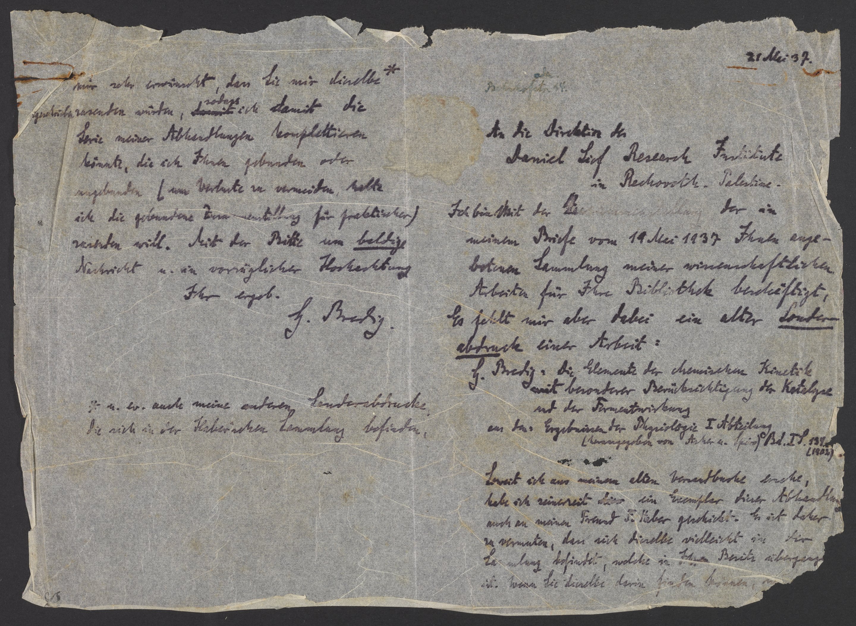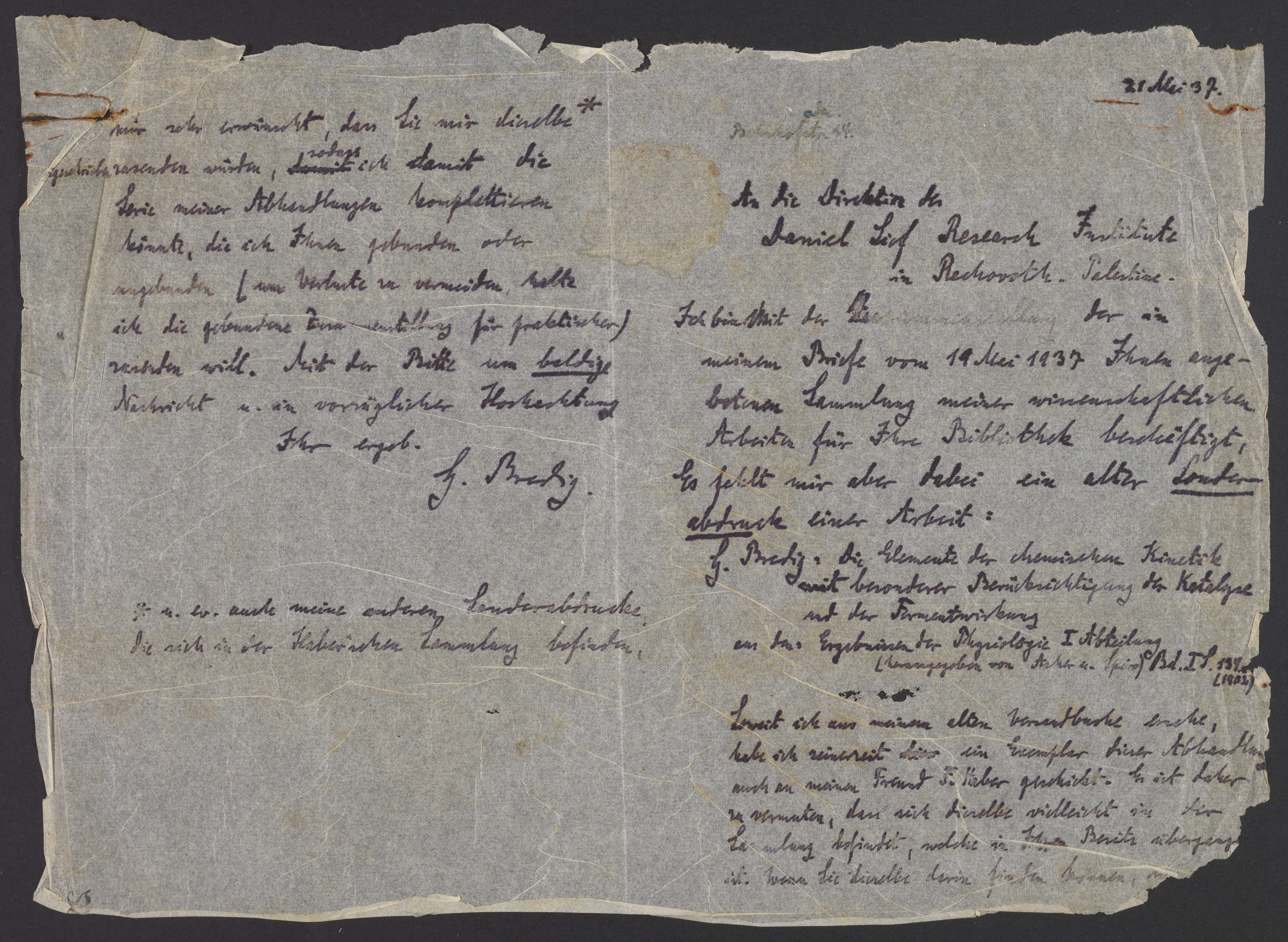 Bredig, Georg. “Letter from Georg Bredig to the Daniel Sieff Research Institute,” May 21, 1937. Papers of Georg and Max Bredig, Box 1, Folder 27. Science History Institute. Philadelphia. https://digital.sciencehistory.org/works/8lnkpjd.