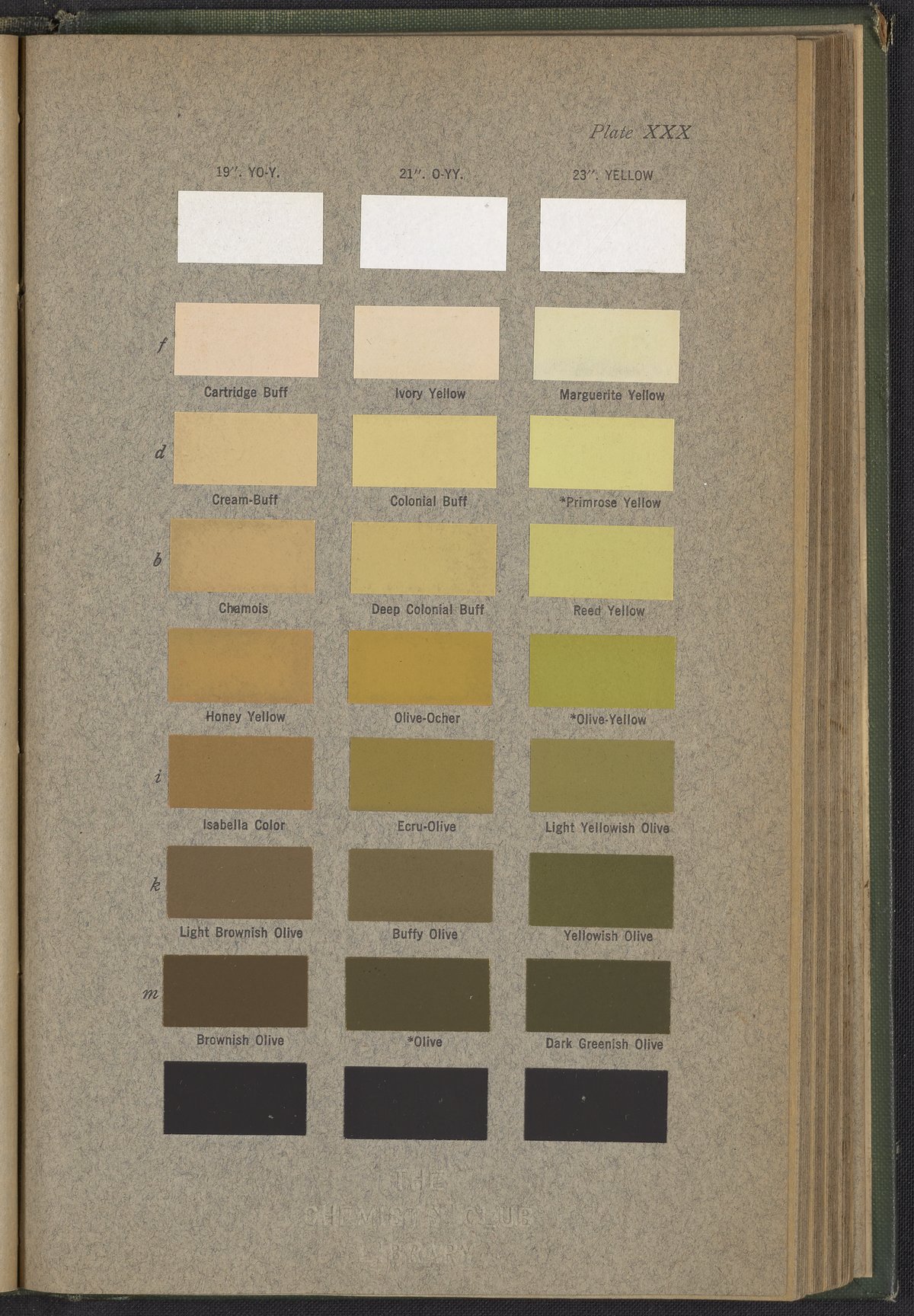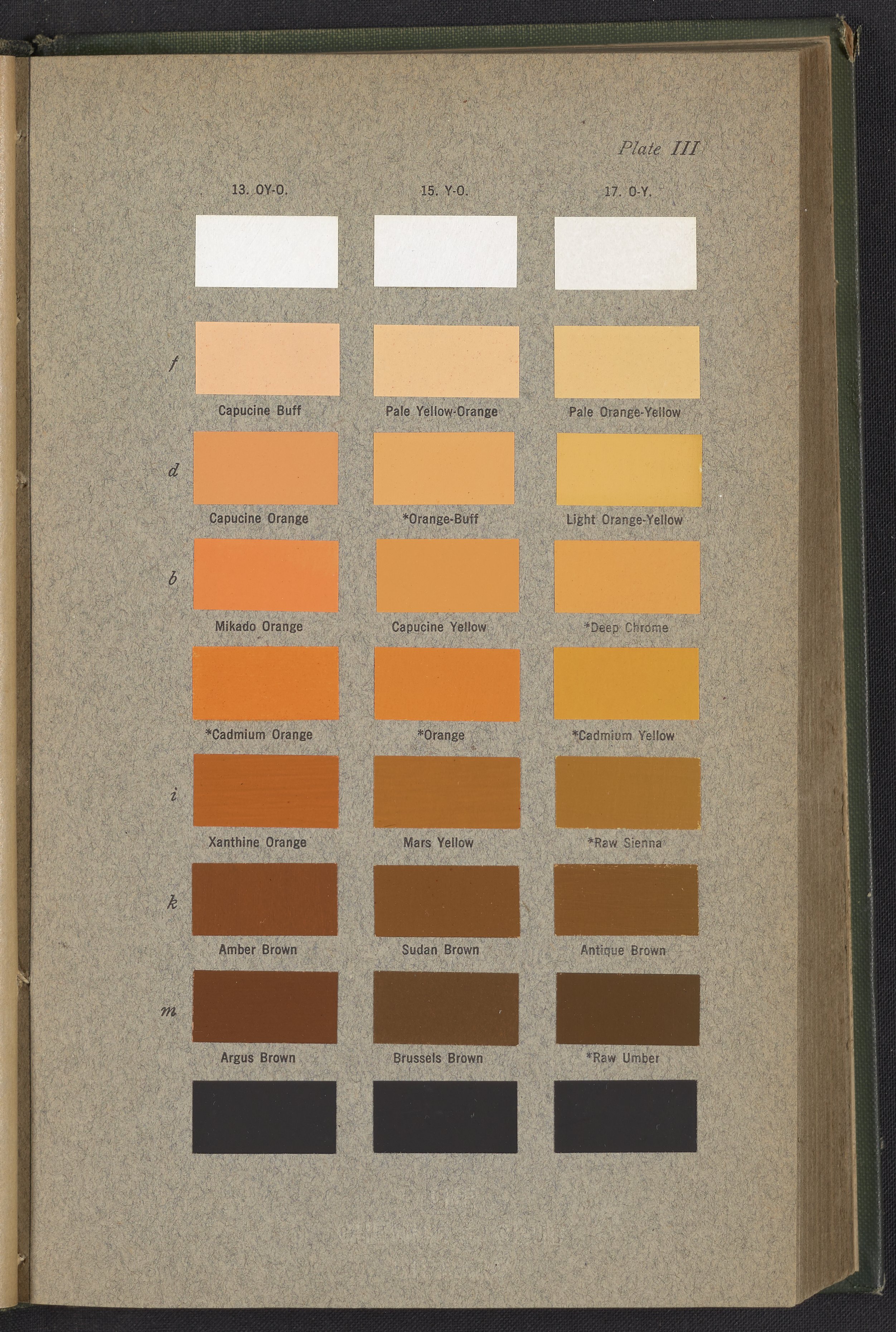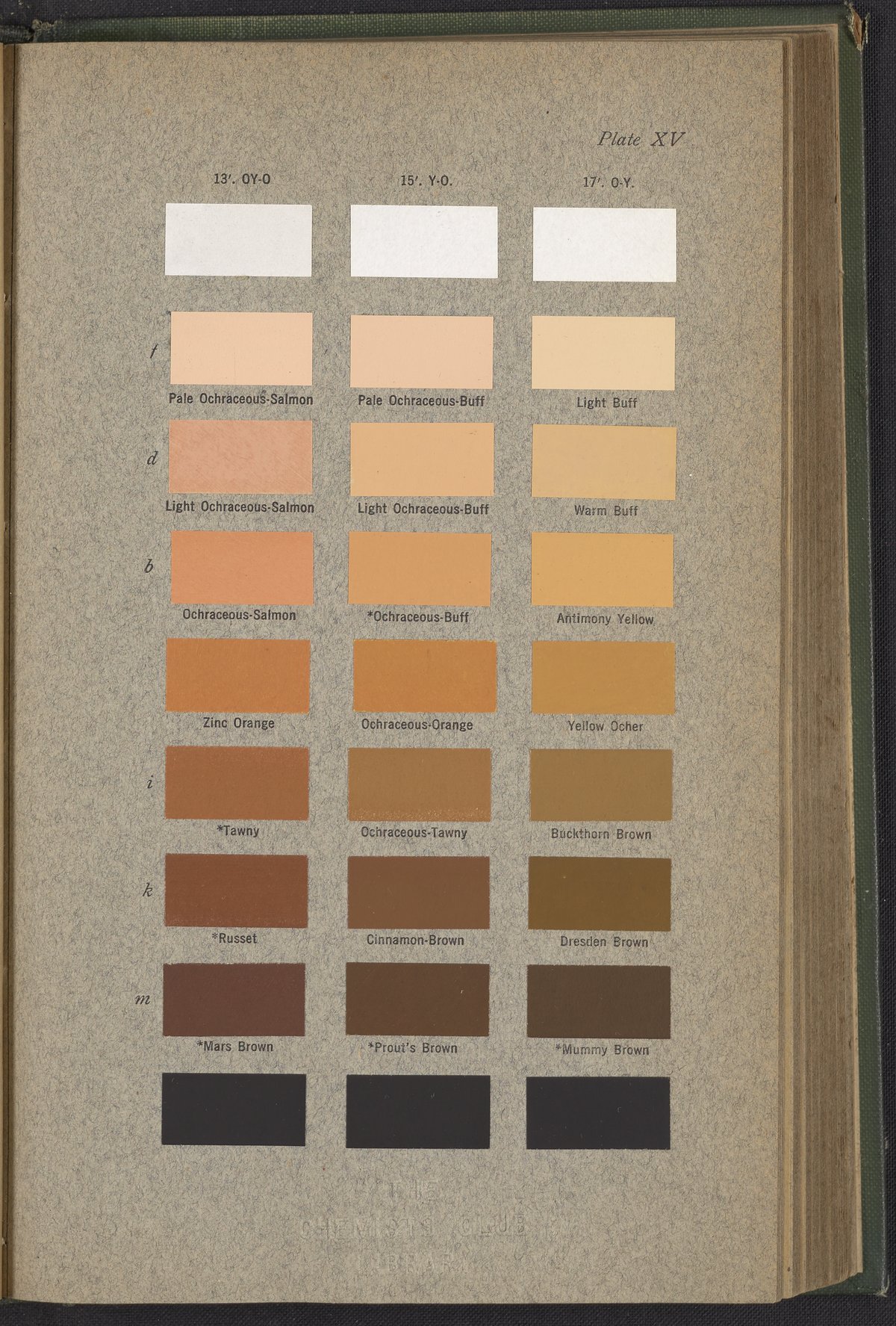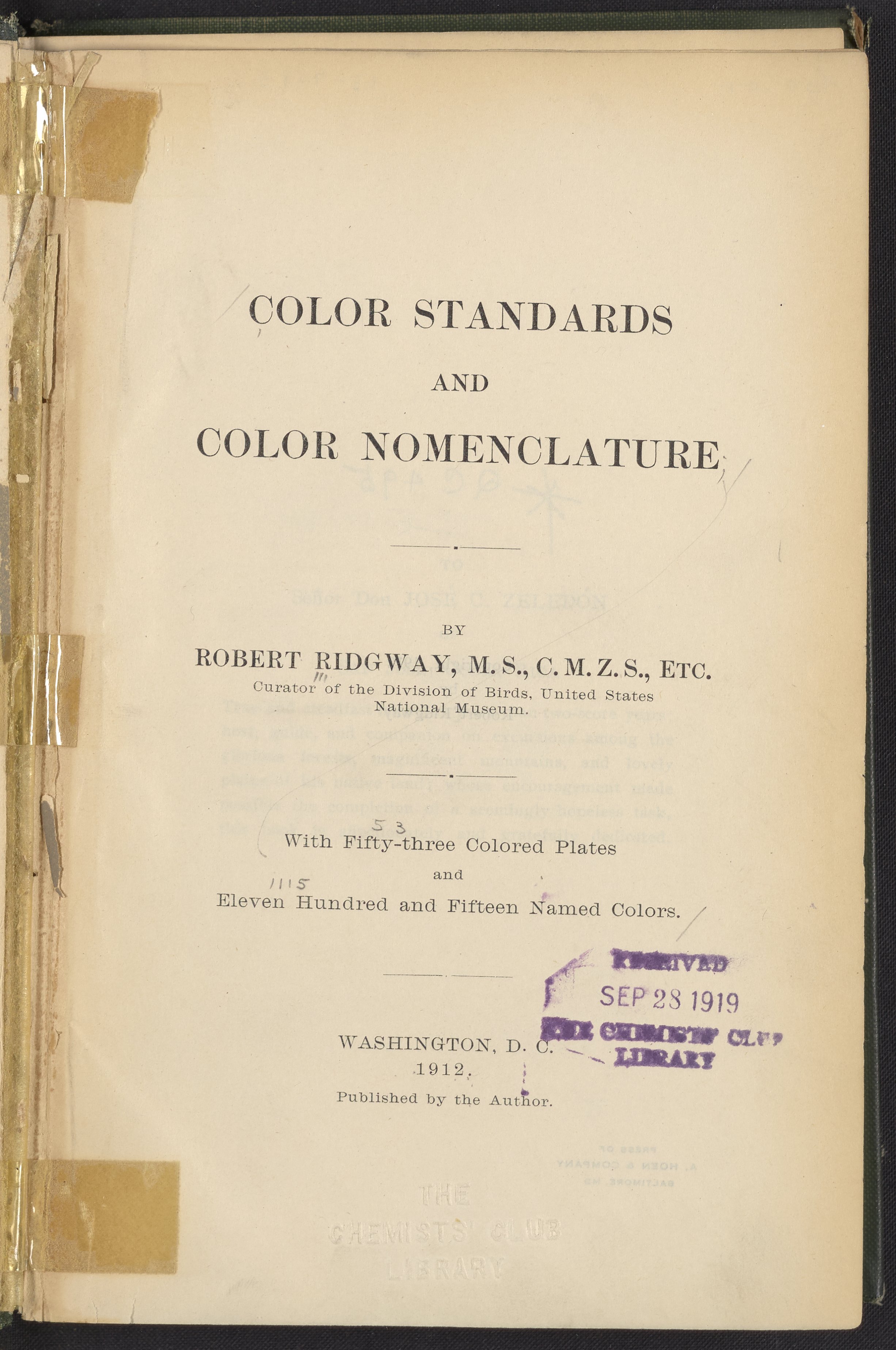 Ridgway, Robert. “Color Standards and Nomenclature.” Washington (D.C.): Robert Ridgway, 1912. QC495 .R53 1912. Science History Institute. Philadelphia. https://digital.sciencehistory.org/works/8mibc4w.