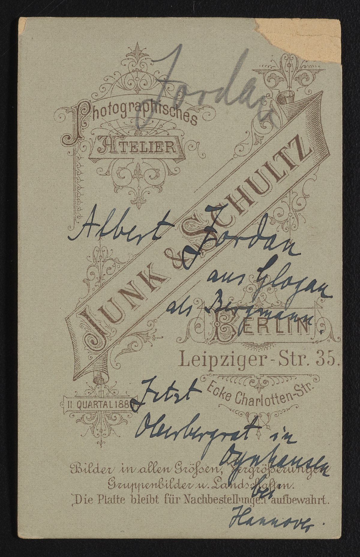 “Portrait of Albert Jordan,” circa 1889. Papers of Georg and Max Bredig, Box 21. Science History Institute. Philadelphia. https://digital.sciencehistory.org/works/8n73cq3.