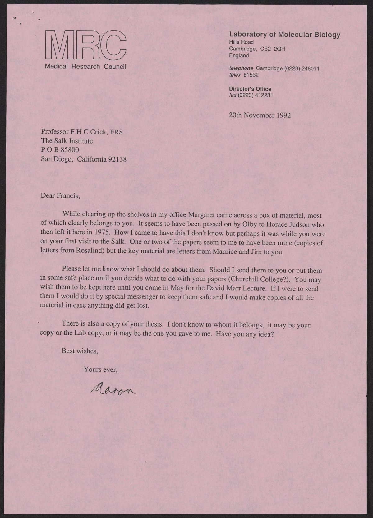 Klug, A. (Aaron), Sir. “Letter from Aaron Klug to Francis Crick, November 20, 1992,” November 20, 1992. History of Molecular Biology Collection, Box 20, Folder 5. Science History Institute. Philadelphia. https://digital.sciencehistory.org/works/8nitlw3.