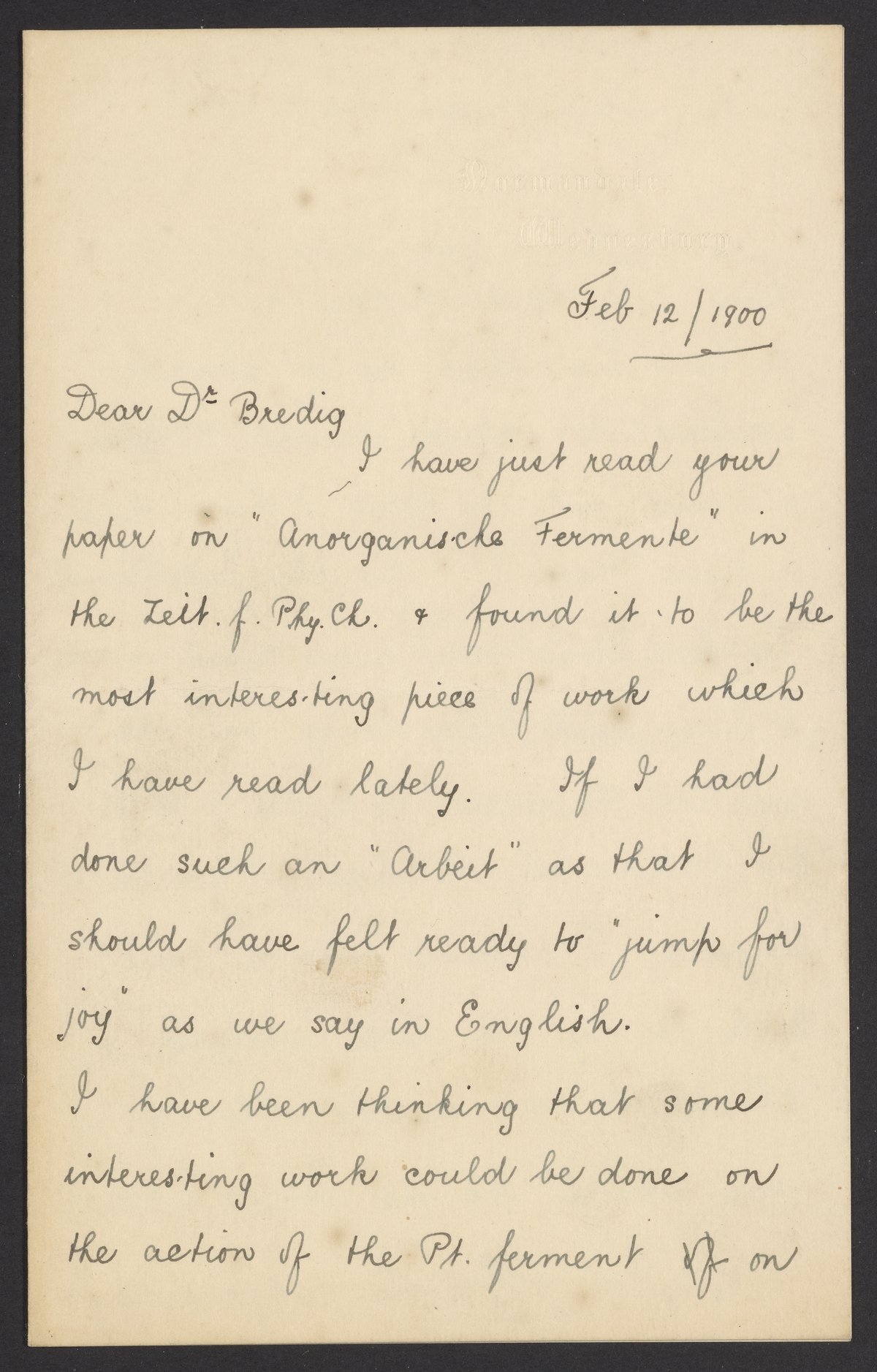 Slater Price, Thomas, 1875–1949. “Letter from Thomas Slater Price to Georg Bredig,” February 12, 1900. Papers of Georg and Max Bredig, Box 2, Folder 37. Science History Institute. Philadelphia. https://digital.sciencehistory.org/works/8olnqvb.