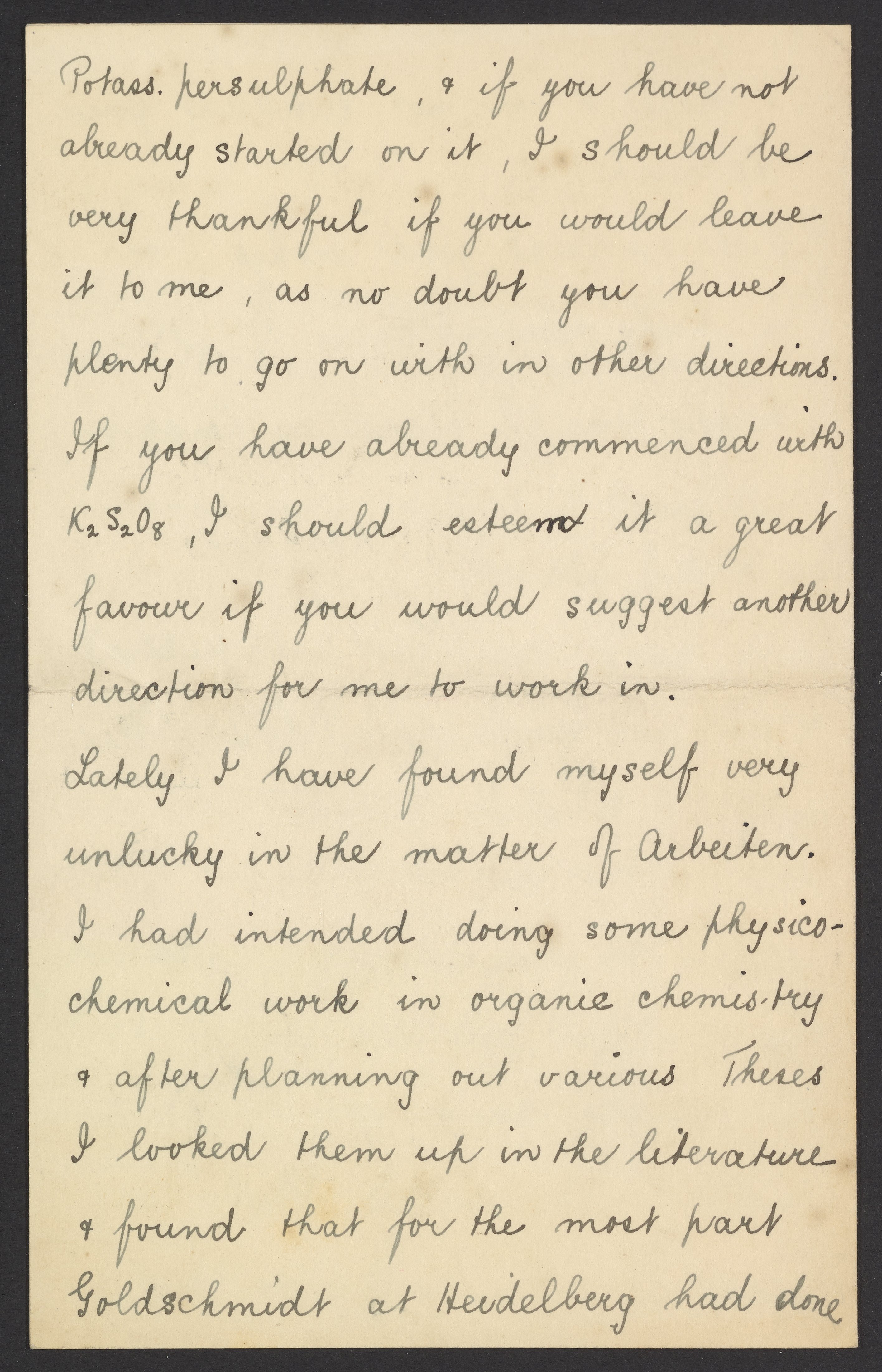 Small JPG1200 x 1877px — 252 KBFull-sized JPG2823 x 4416px — 1.3 MBOriginal fileTIFF — 2823 x 4416px — 35.7 MBLetter from Thomas Slater Price (1875-1949) to Georg Bredig (1868-1944). Price, a British chemist, expresses his interest in returning to work with catalysts and asks Bredig for advice.