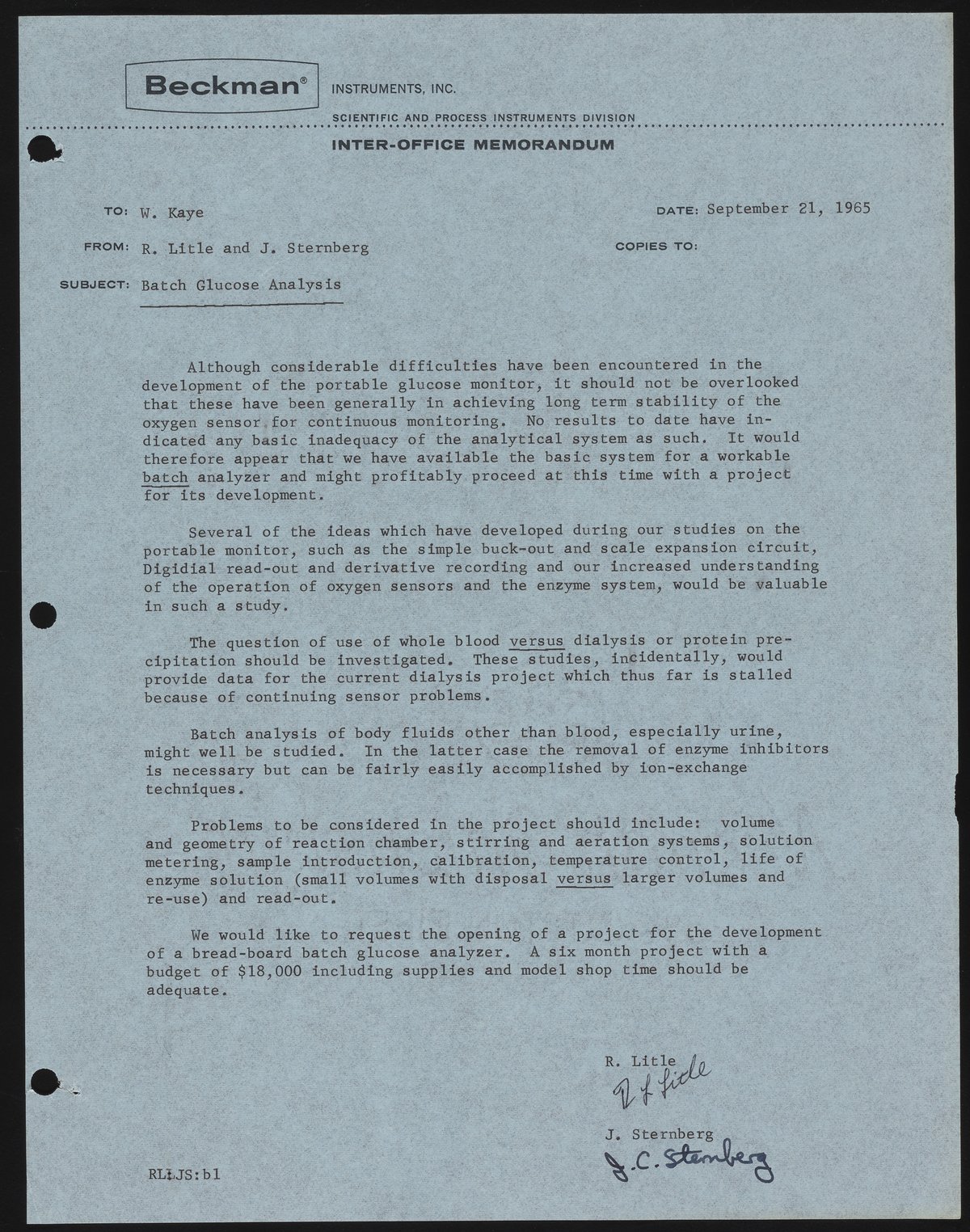 Sternberg, James C., and R. L. Little. “Memo from R. Little and J. Sternberg to Wilbur Kaye,” September 21, 1965. Beckman Historical Collection, Box 15, Folder 11. Science History Institute. Philadelphia. https://digital.sciencehistory.org/works/8p58pc973.