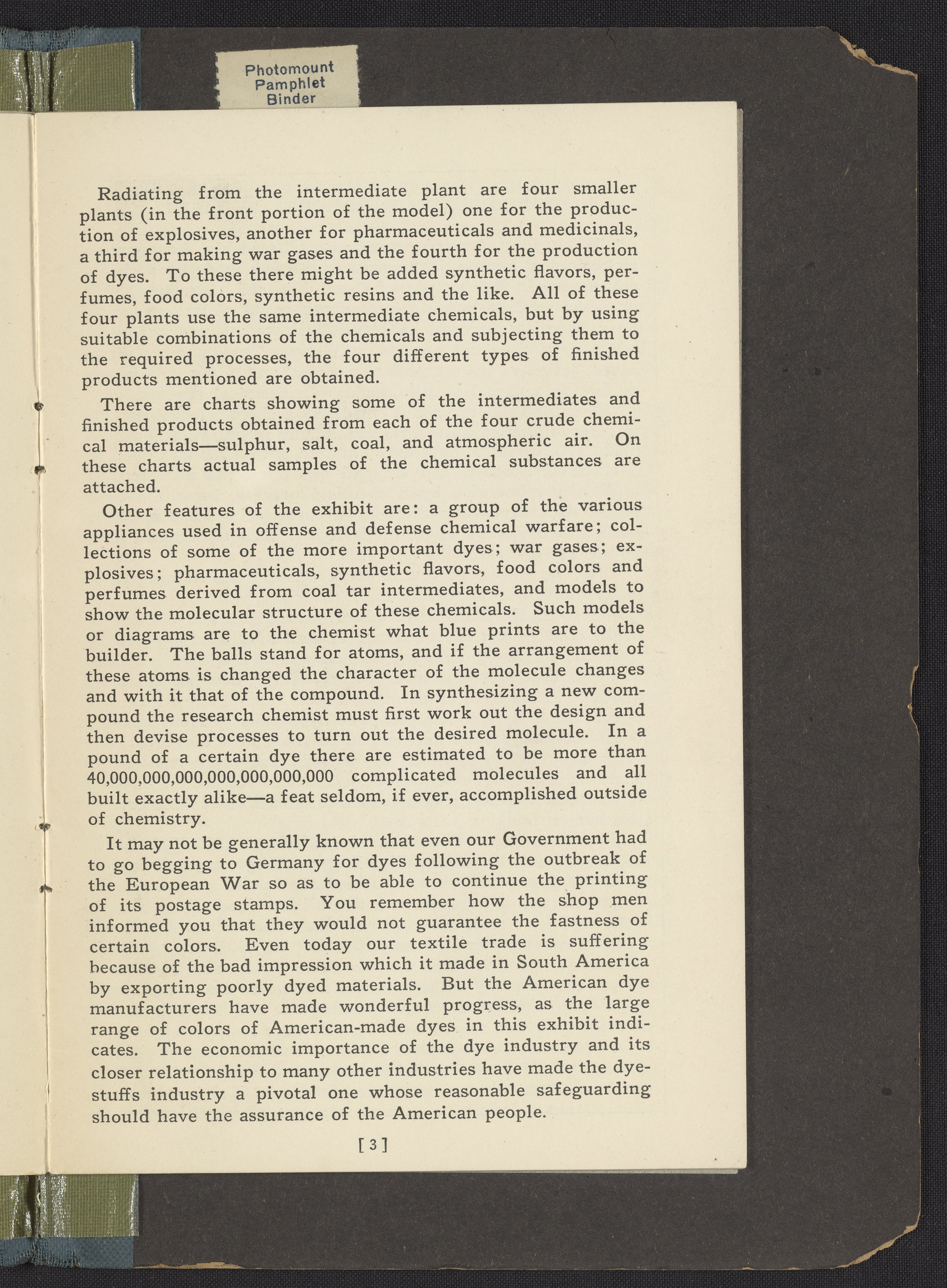 Small JPG1200 x 1631px — 442 KBLarge JPG2880 x 3916px — 2.7 MBFull-sized JPG4344 x 5906px — 5.7 MBOriginal fileTIFF — 4344 x 5906px — 73.5 MBExhibition program for "The Chemical Exhibit" installed at the Smithsonian Institute in Washington, D.C. circa 1921. The central feature of the exhibit is a topographical model showing coal tar and other chemical industries in the production of dyes, war gases, pharmaceuticals, and explosives. The program includes an overview of "Chemistry in National Welfare" by H. E. Howe, and discusses sulfur, coal, salt, and air products, as well as coal tar drugs and perfumes.