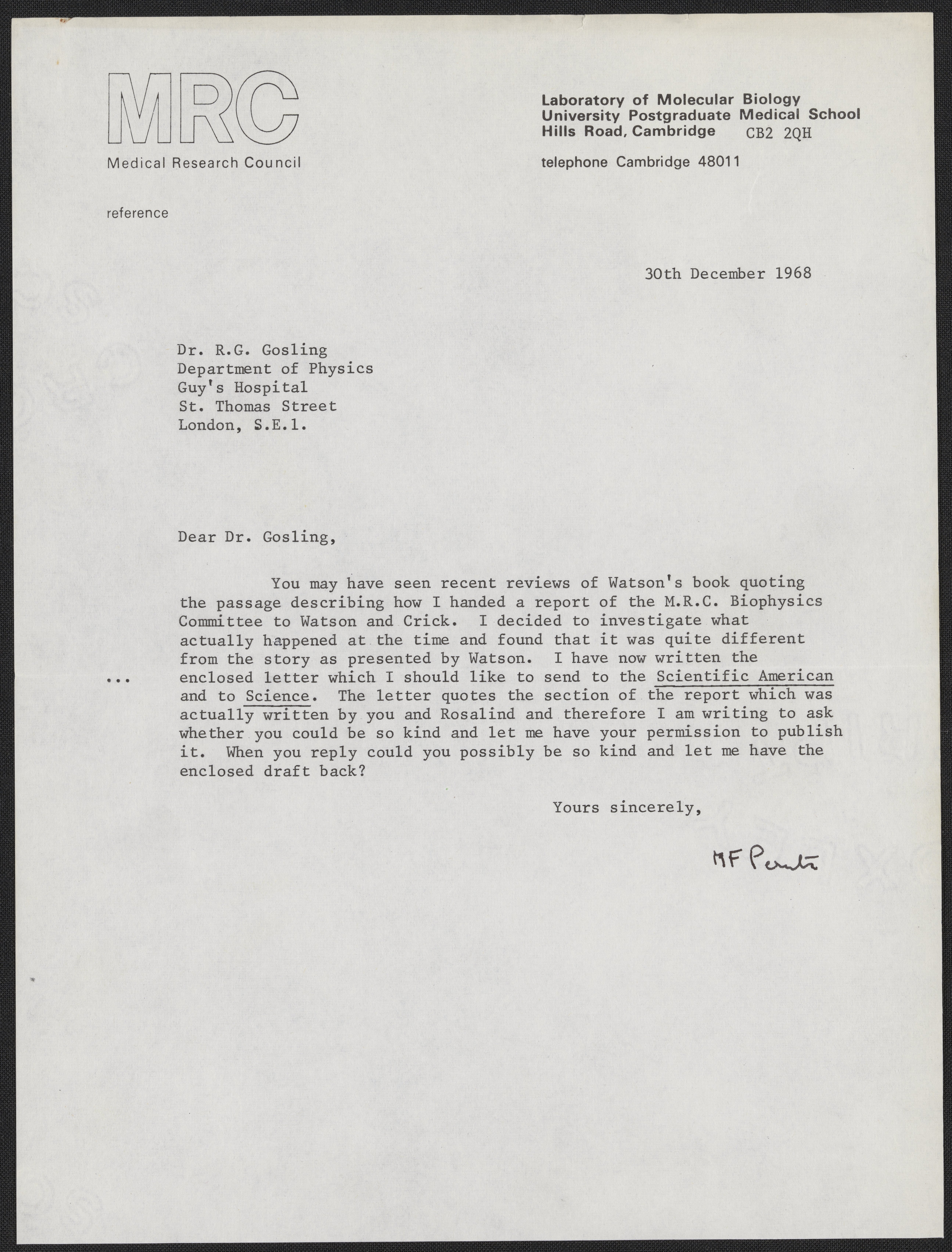 Perutz, Max F. “Letter from Max Perutz to Raymond Gosling, December 30, 1968,” December 30, 1968. History of Molecular Biology Collection, Box 13, Folder 26. Science History Institute. Philadelphia. https://digital.sciencehistory.org/works/8p8ke9q.
