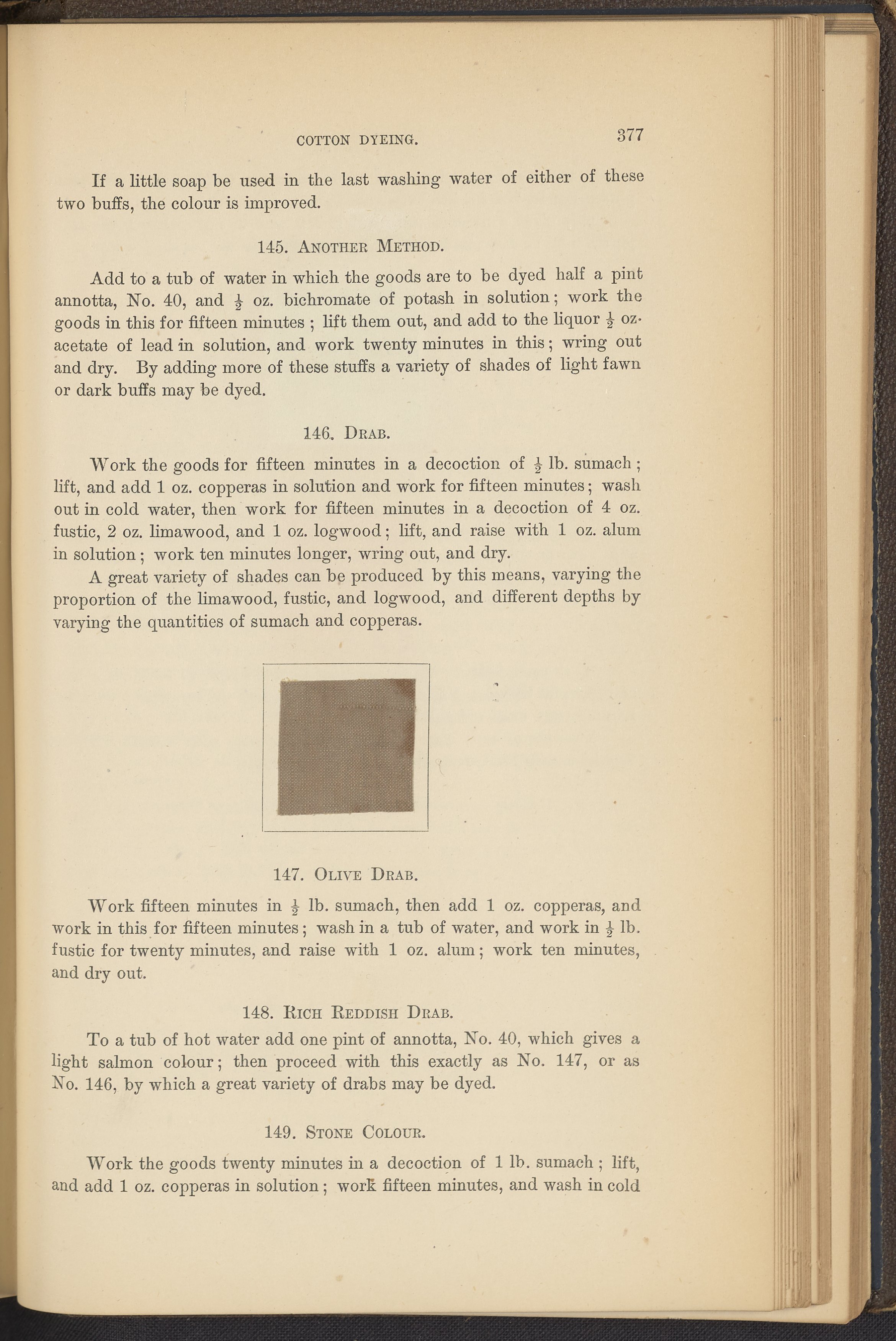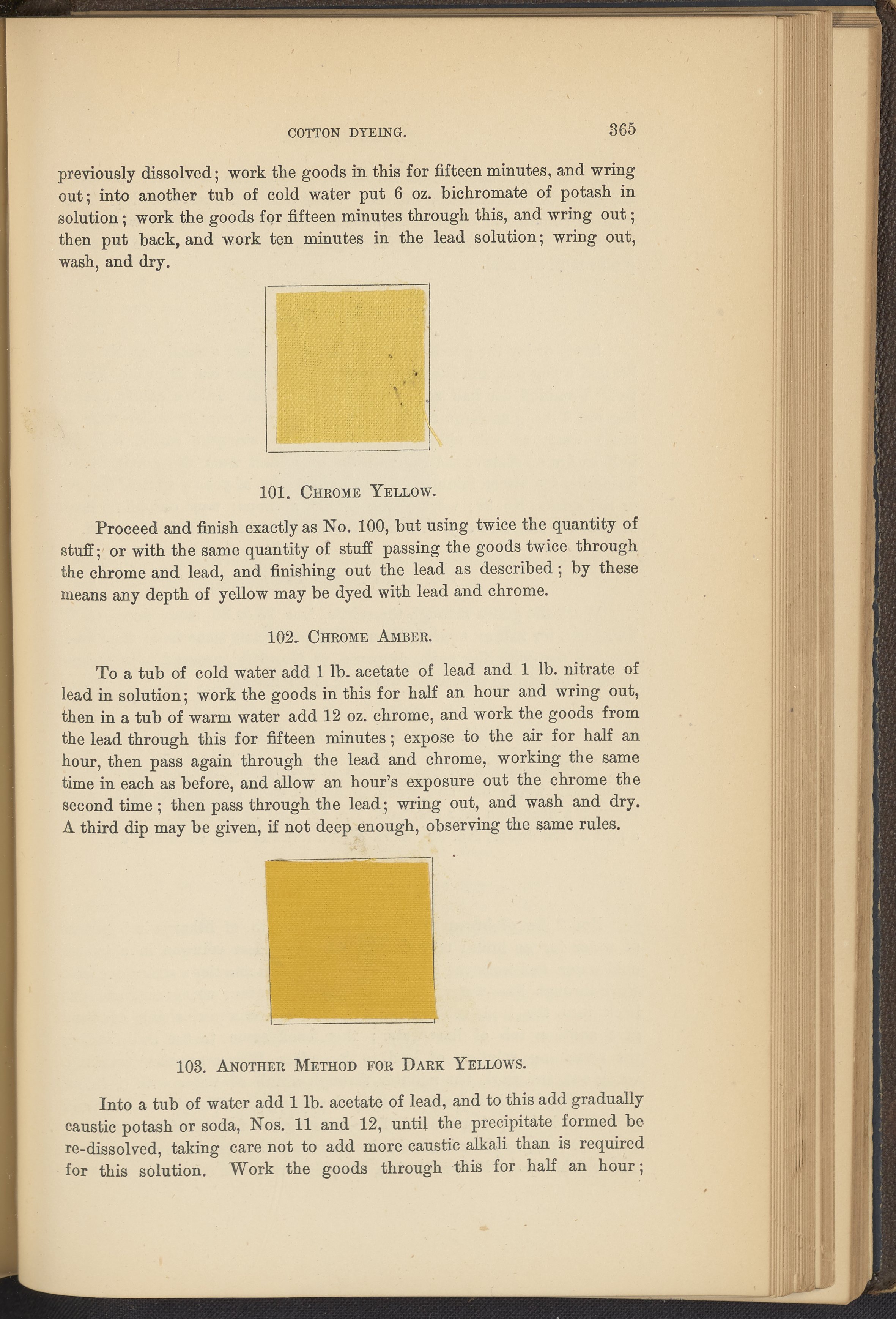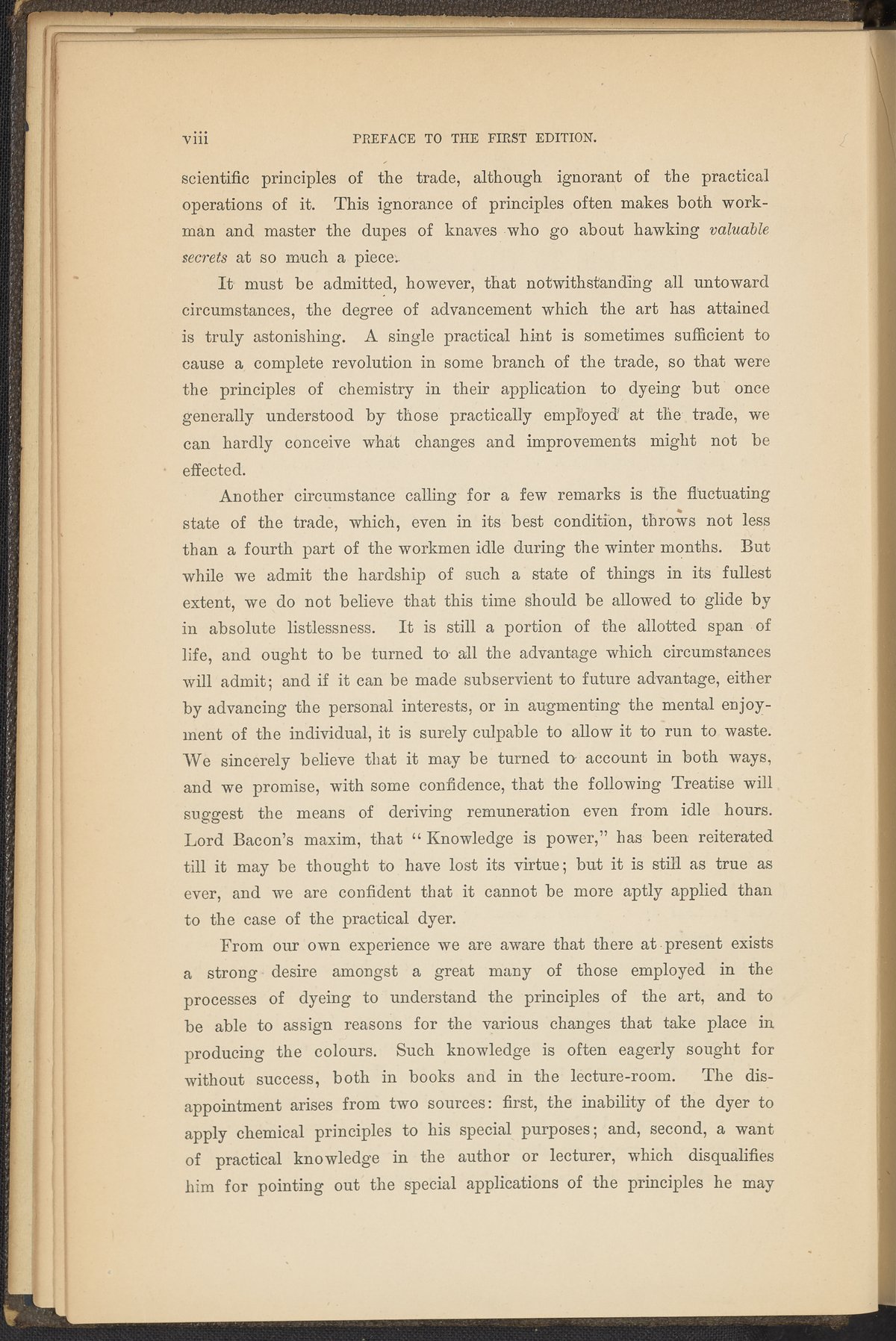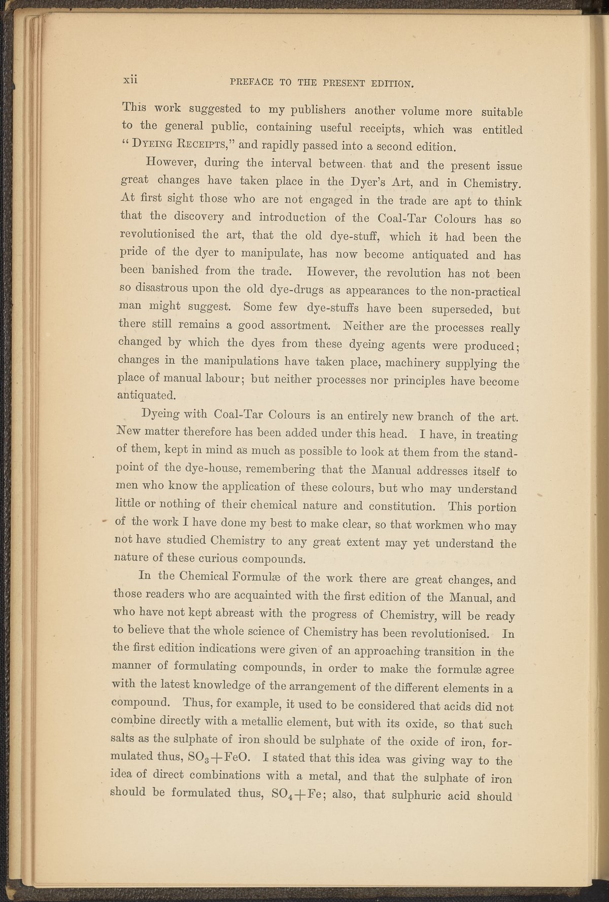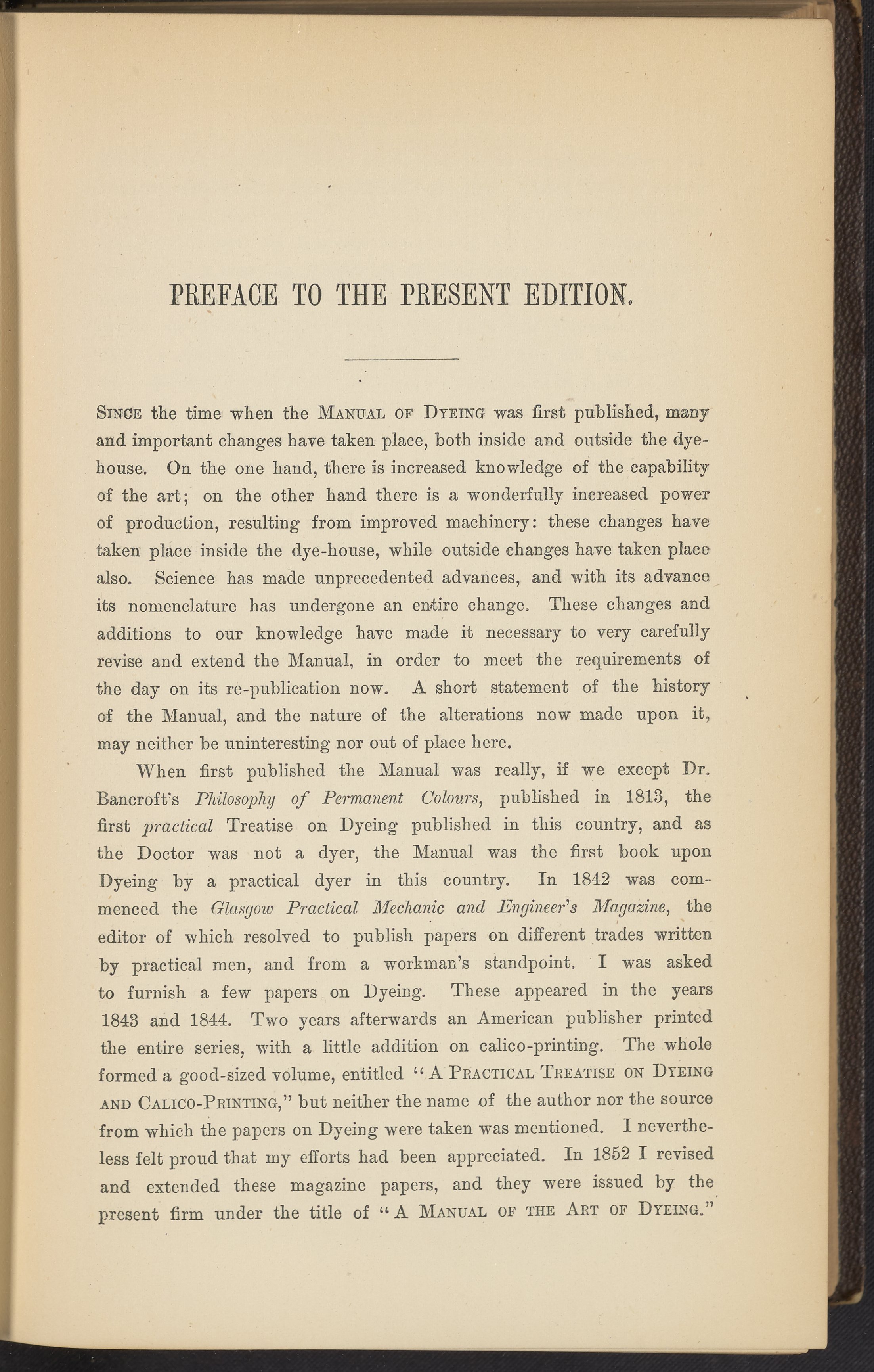 Small JPG1200 x 1694px — 624 KBFull-sized JPG2536 x 3579px — 2.3 MBOriginal fileTIFF — 2536 x 3579px — 26.0 MBThe third edition of a work, updated from the first to include an updated description of contemporary dyeing machinery, advances in science, and updated nomenclature and chemical formula. According to the author, the work is intended to aid the skilled workman, "not to teach practical dyeing, but to explain the scientific principles of the art." Includes numerous recipes for dyeing cotton, silk, and wool fabrics.