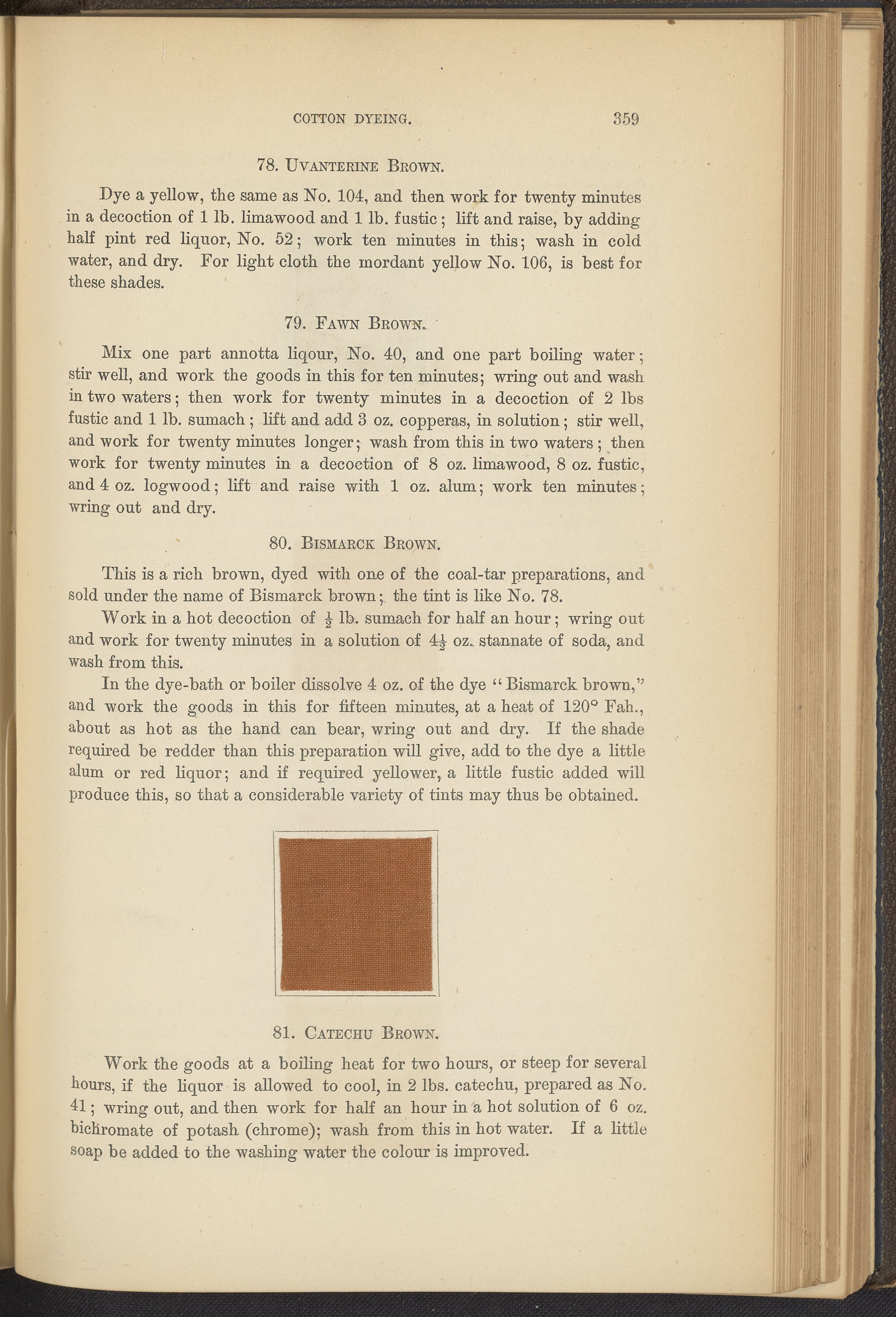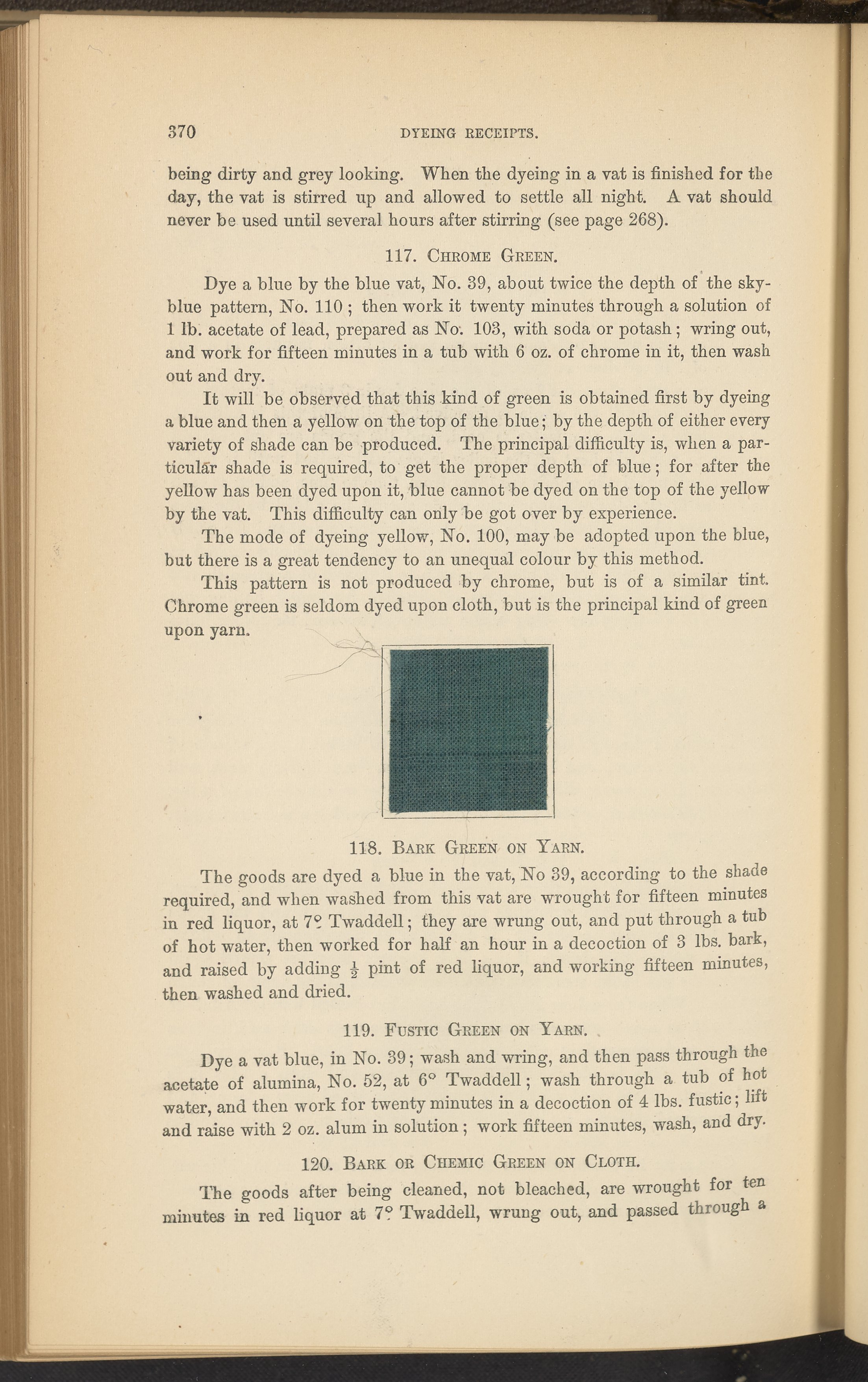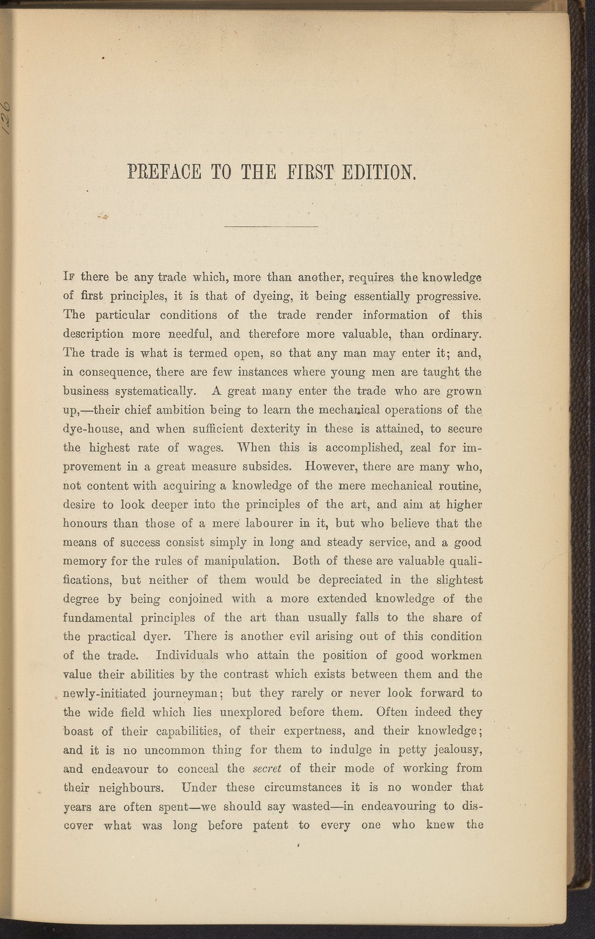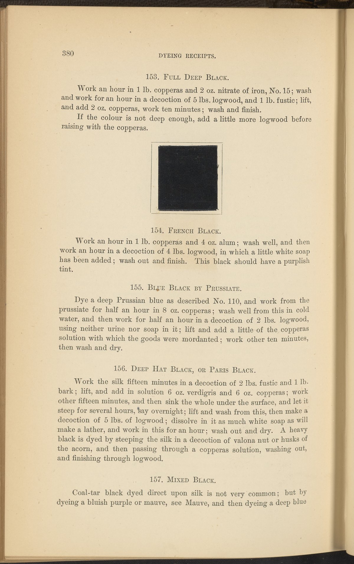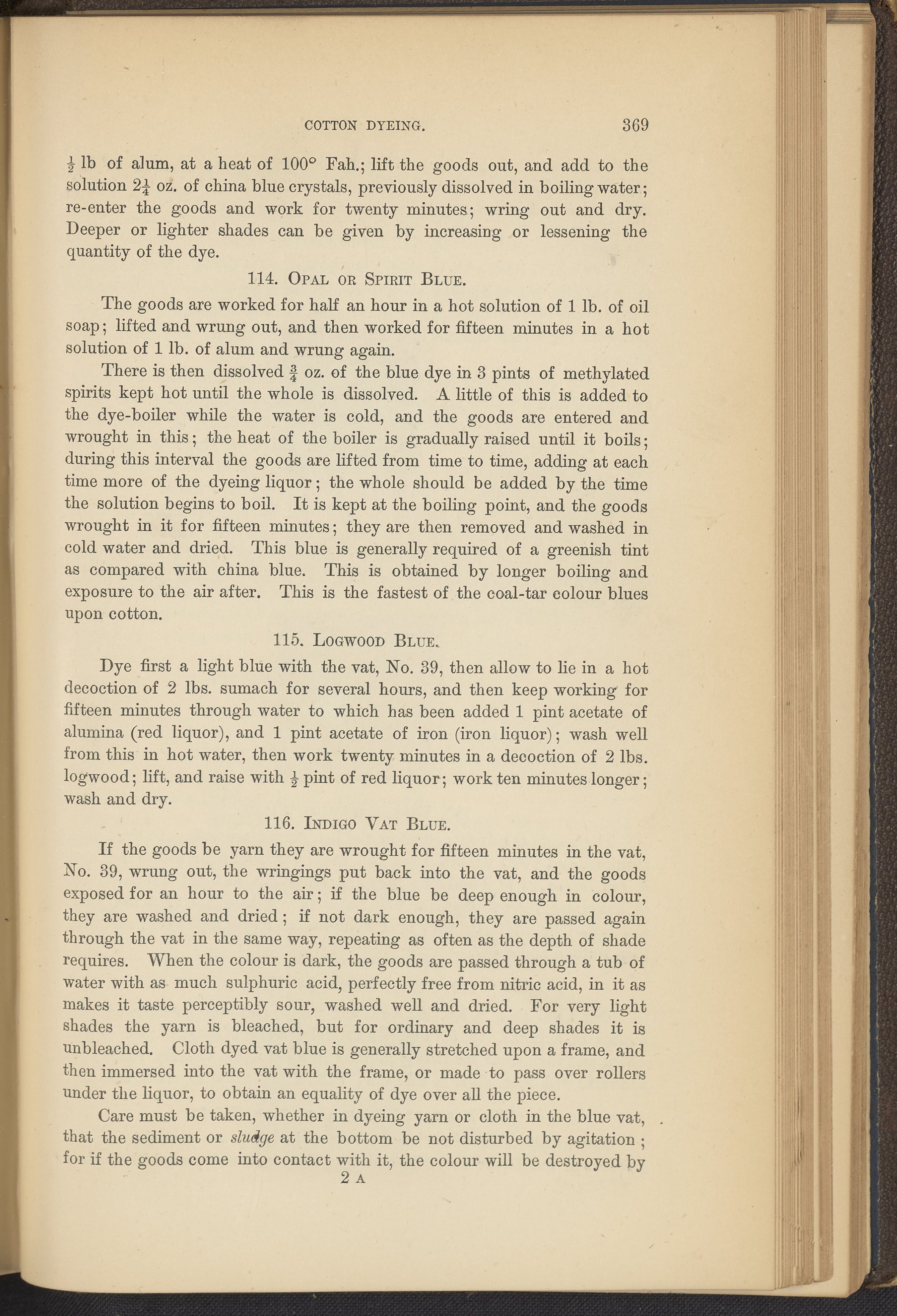 Small JPG1200 x 1694px — 624 KBFull-sized JPG2536 x 3579px — 2.3 MBOriginal fileTIFF — 2536 x 3579px — 26.0 MBThe third edition of a work, updated from the first to include an updated description of contemporary dyeing machinery, advances in science, and updated nomenclature and chemical formula. According to the author, the work is intended to aid the skilled workman, "not to teach practical dyeing, but to explain the scientific principles of the art." Includes numerous recipes for dyeing cotton, silk, and wool fabrics.