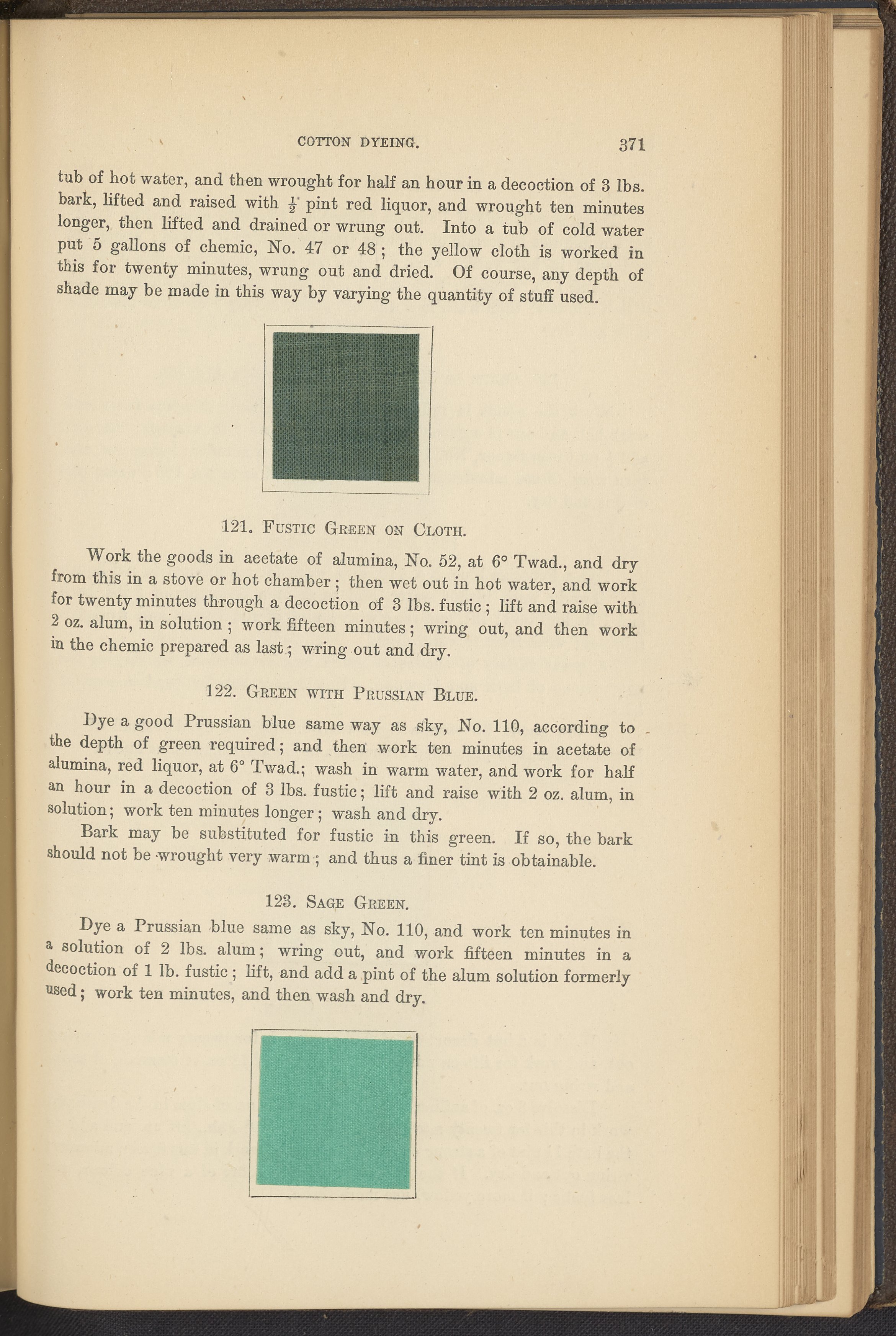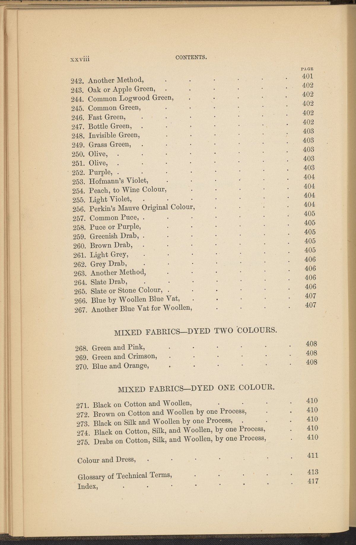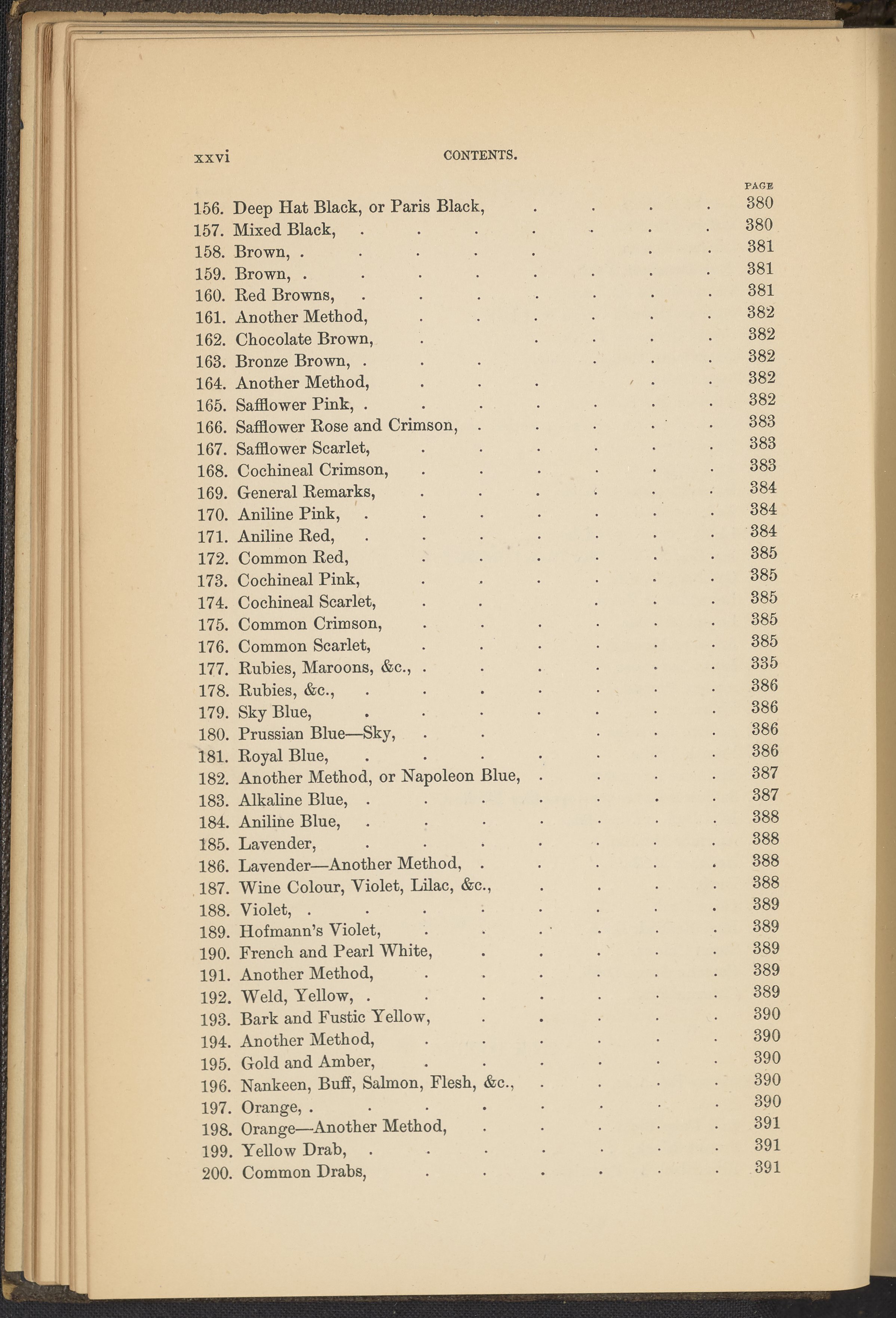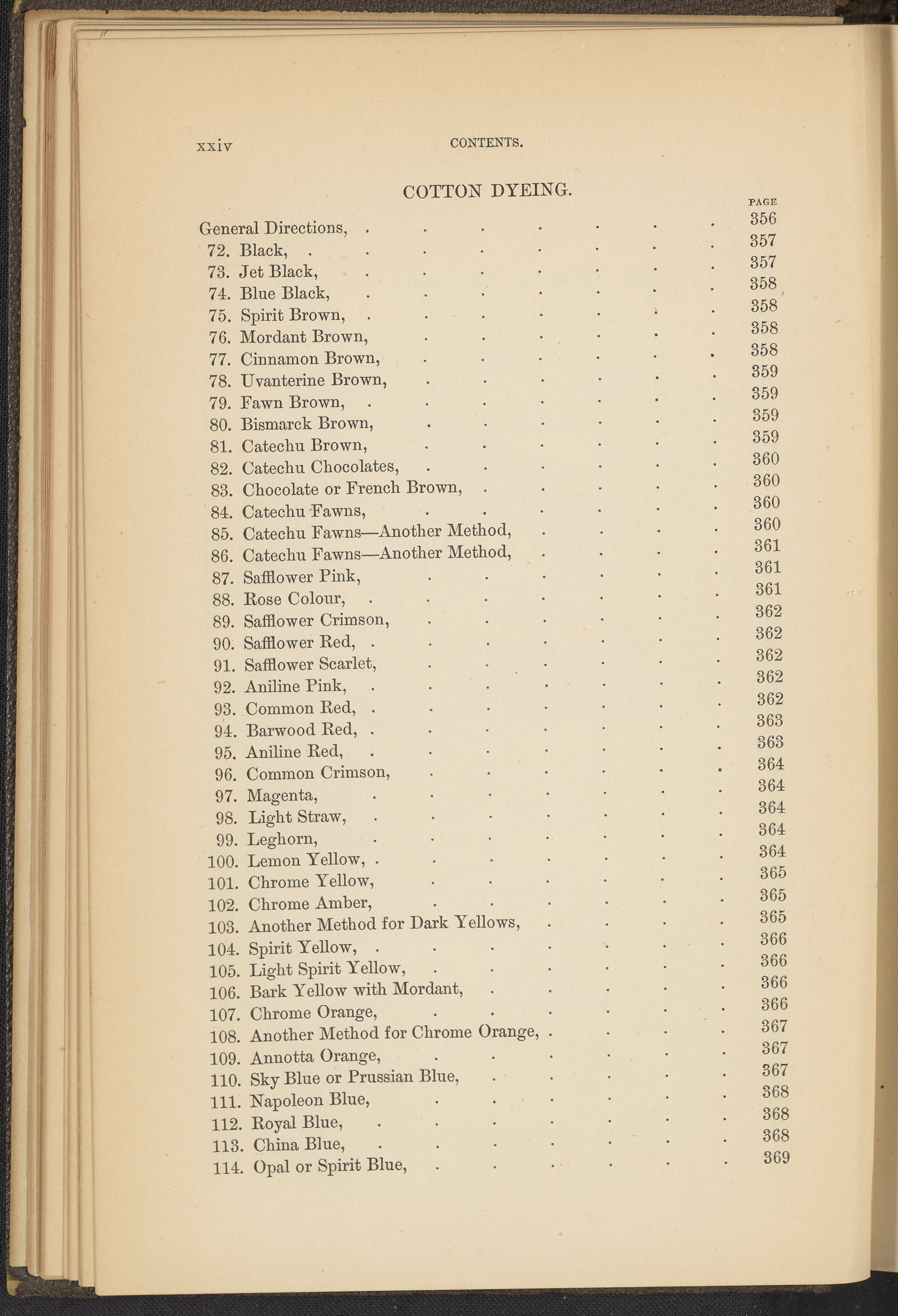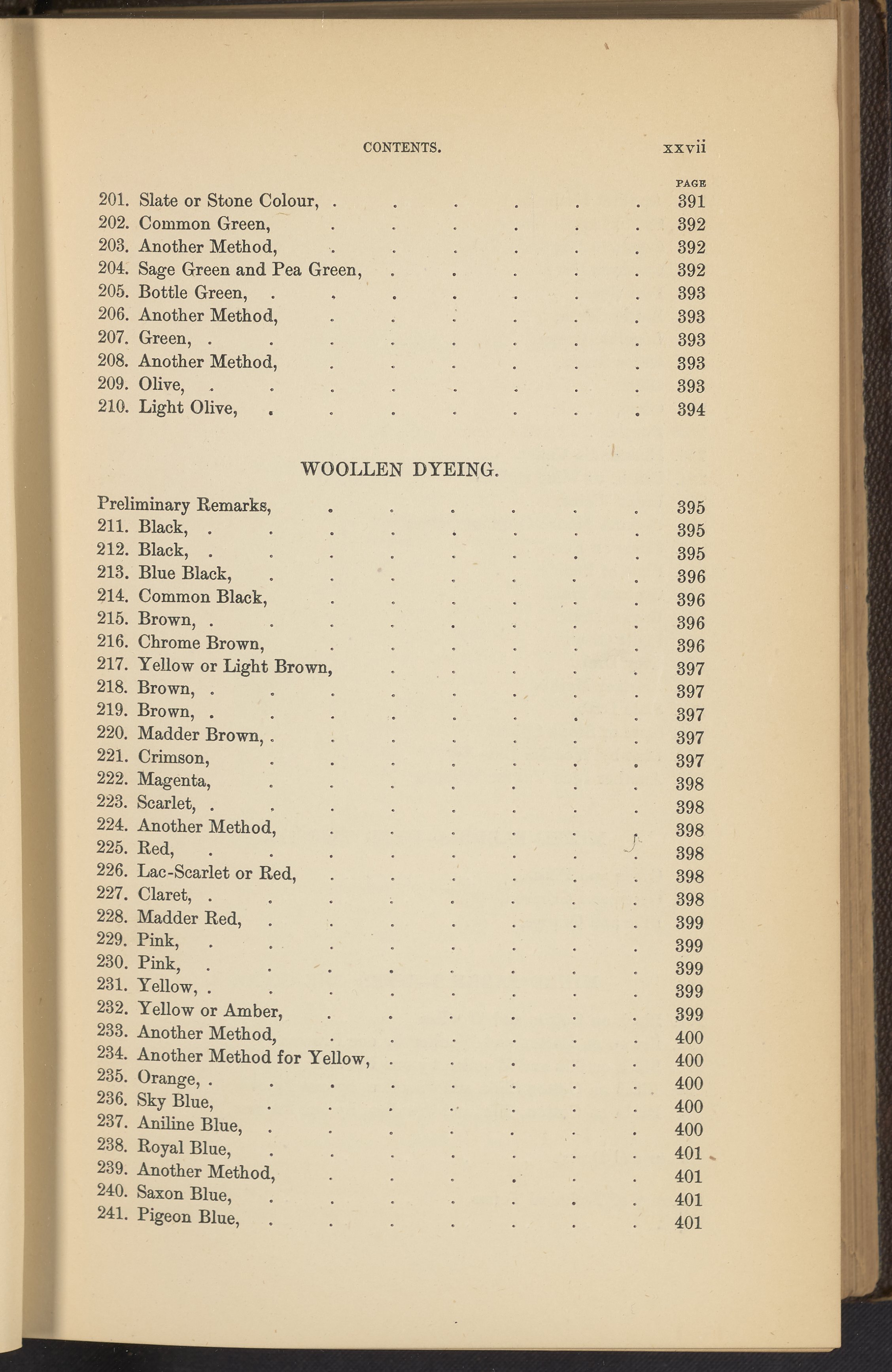 Digitization includes the work's front matter and pages 357-409 which contain pasted samples of dyed wool, silk, and cotton textiles.