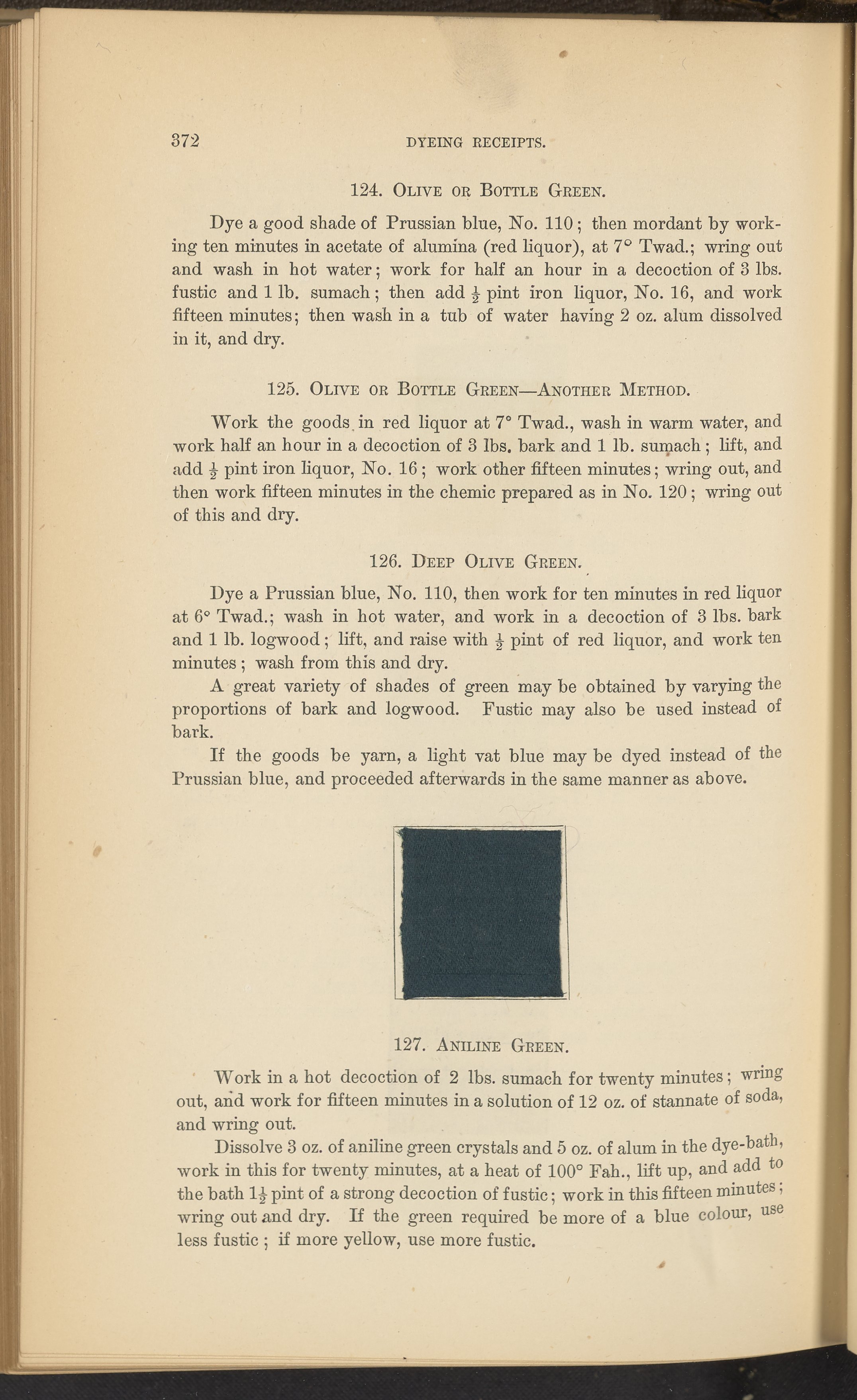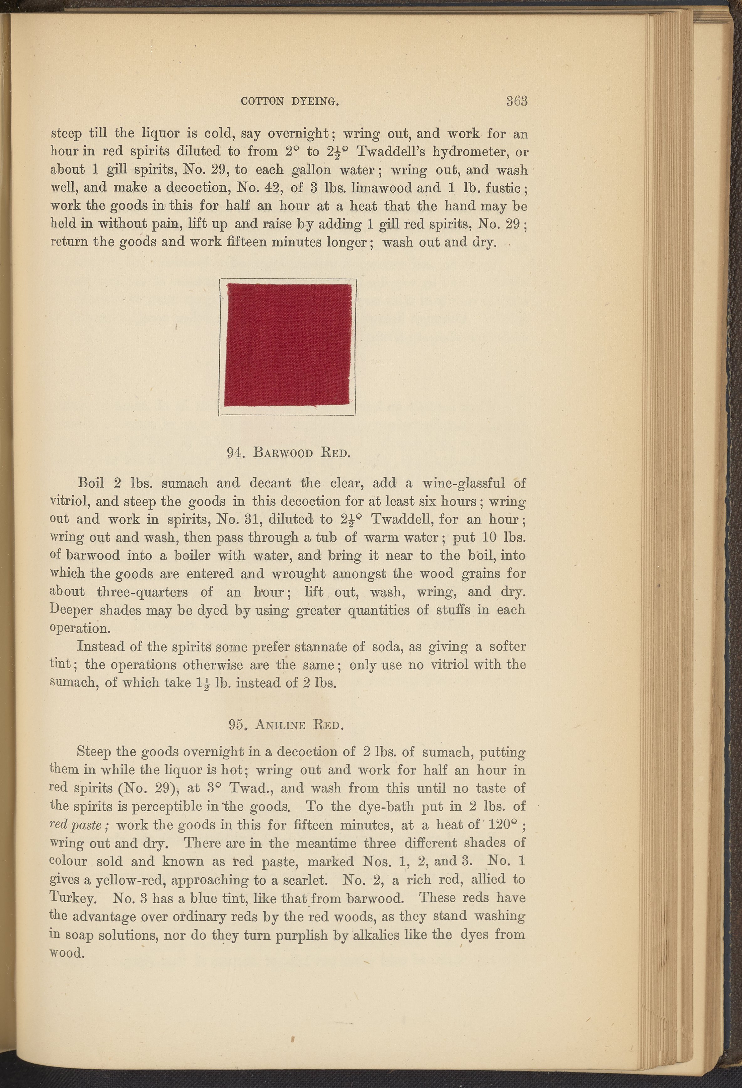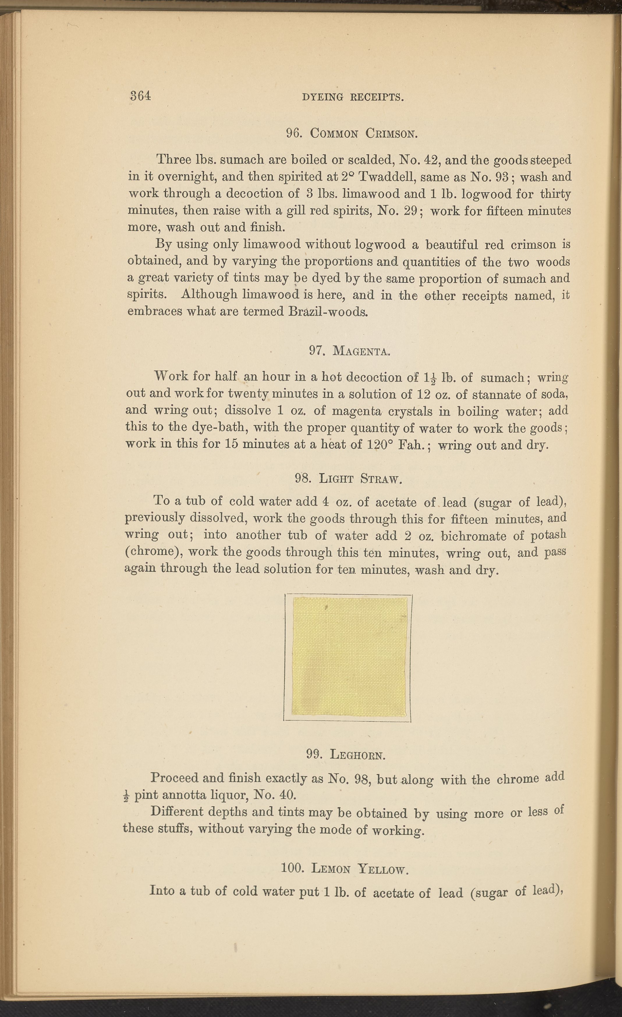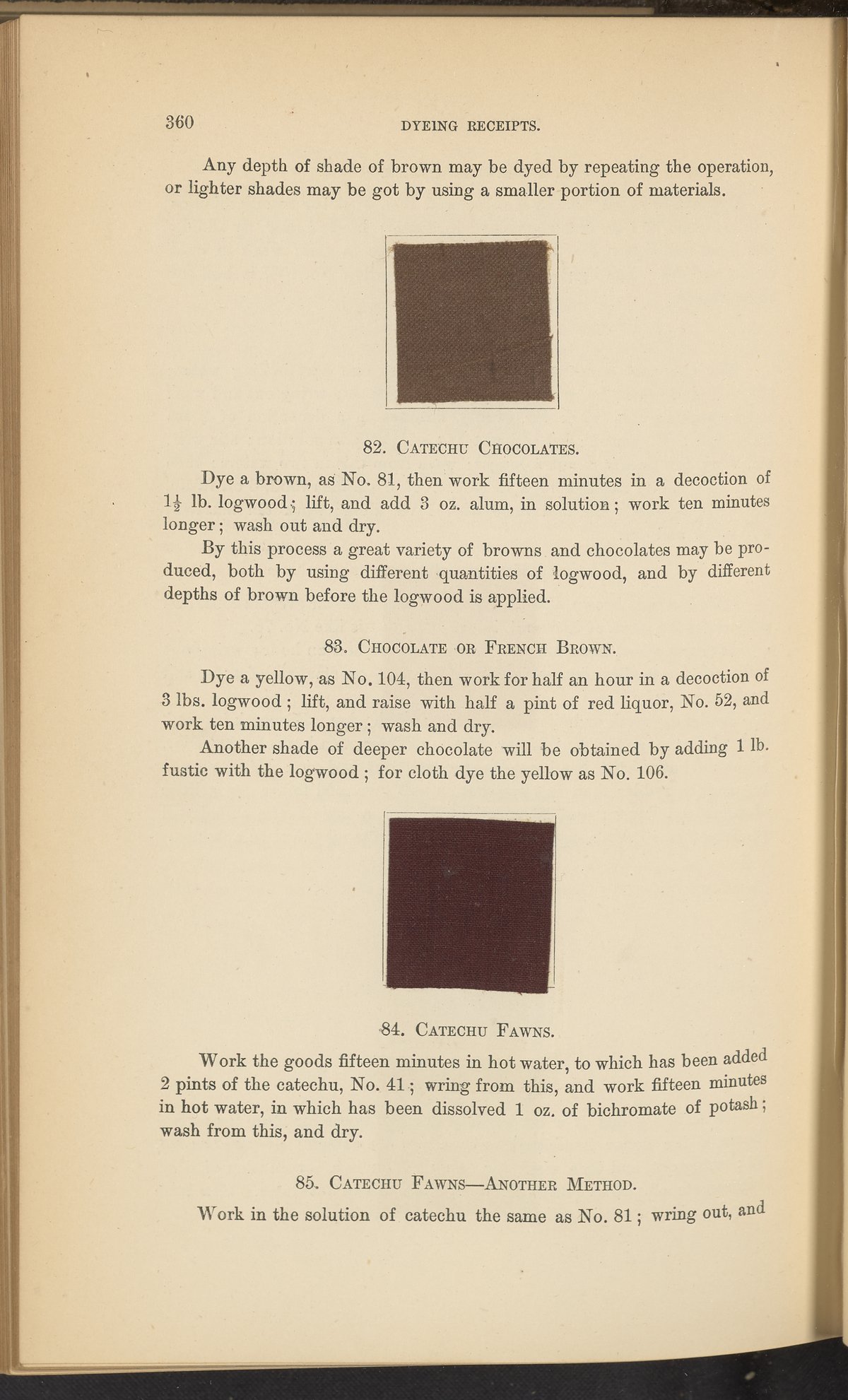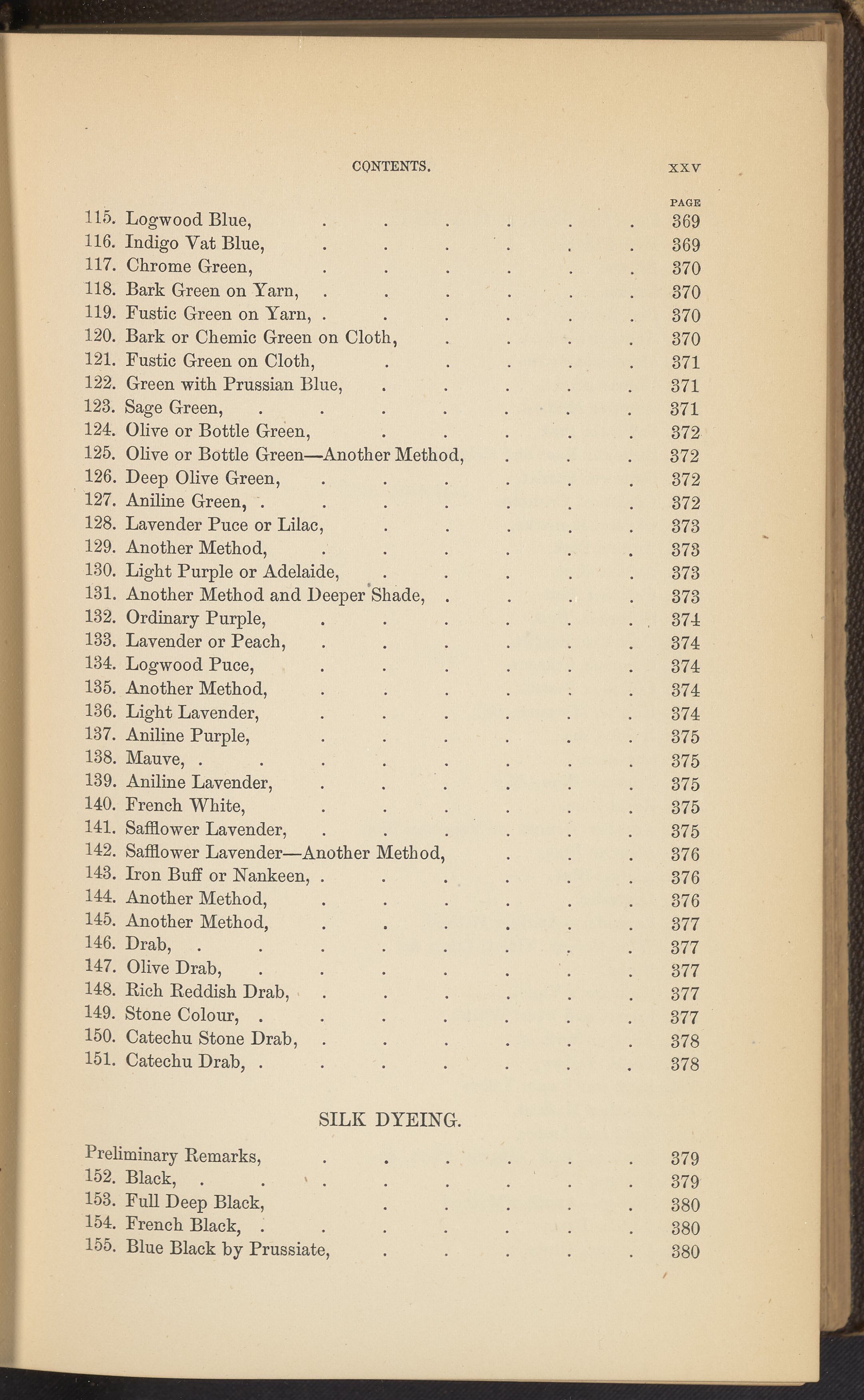 Digitization includes the work's front matter and pages 357-409 which contain pasted samples of dyed wool, silk, and cotton textiles.