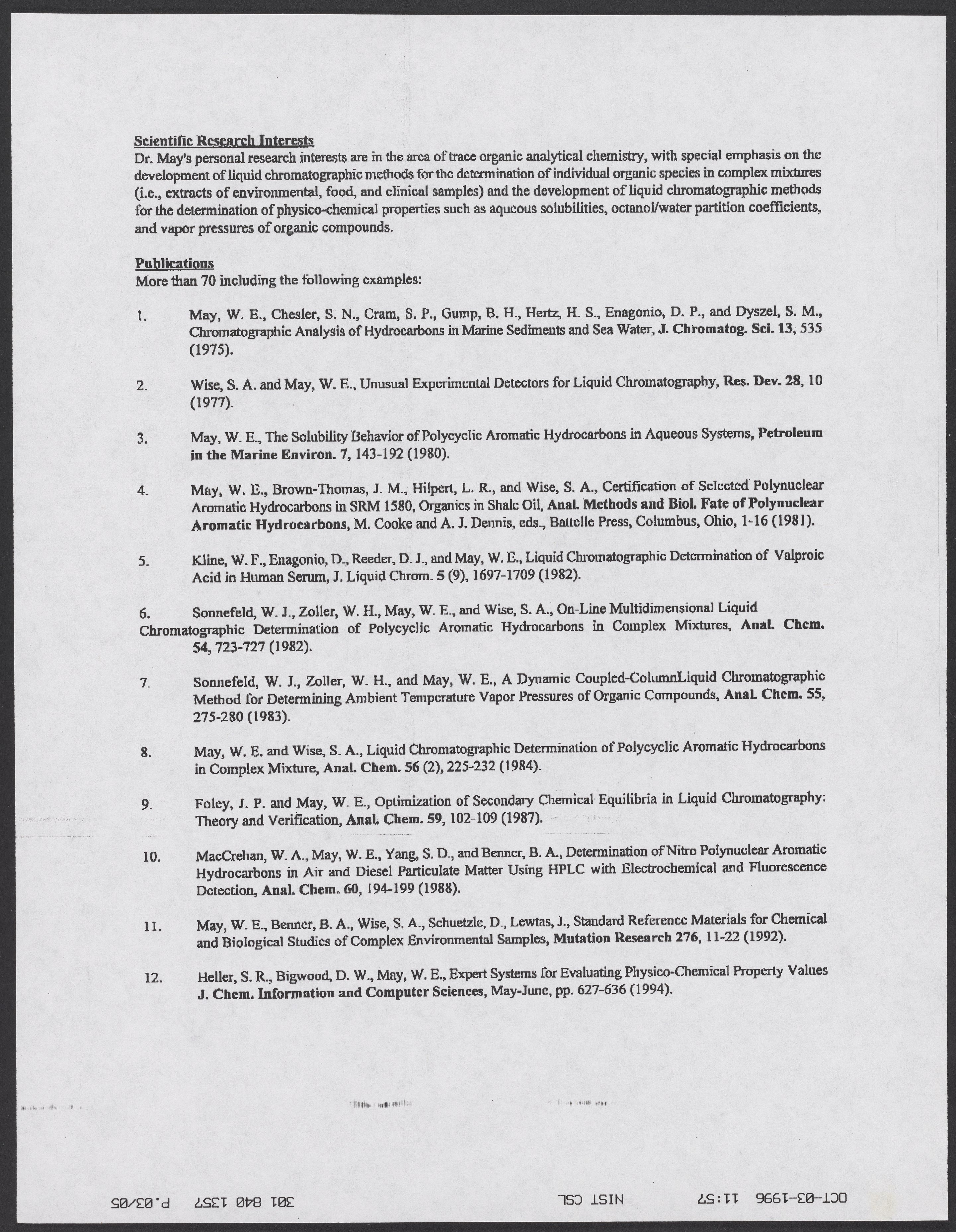May, Willie E. “Resume of Willie E. May,” October 3, 1996. William A. Lester, Jr. Papers, Box 26, Folder 6. Science History Institute. Philadelphia. https://digital.sciencehistory.org/works/8qlpn4c.