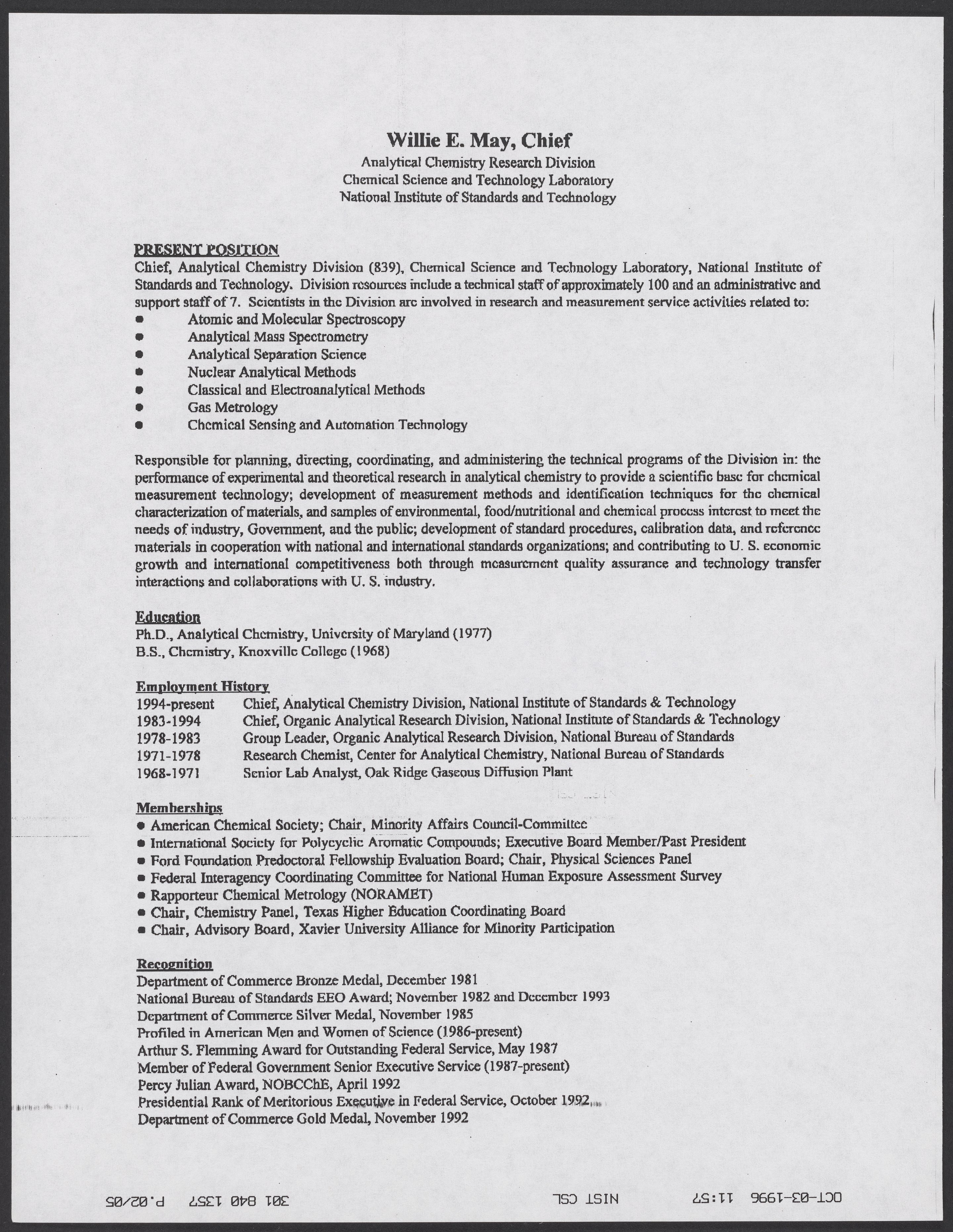 Small JPG1200 x 1551px — 348 KBLarge JPG2880 x 3723px — 1.8 MBFull-sized JPG5346 x 6910px — 6.0 MBOriginal fileTIFF — 5346 x 6910px — 106 MB1996 resume of Willie E. May. May is an African American analytical chemist who has been awarded numerous honors for his work in biological and chemical measurement science. May is the former director of the National Institute of Standards and Technology (NIST). In 2018, he became the Vice President for Research and Economic Development at Morgan State University.