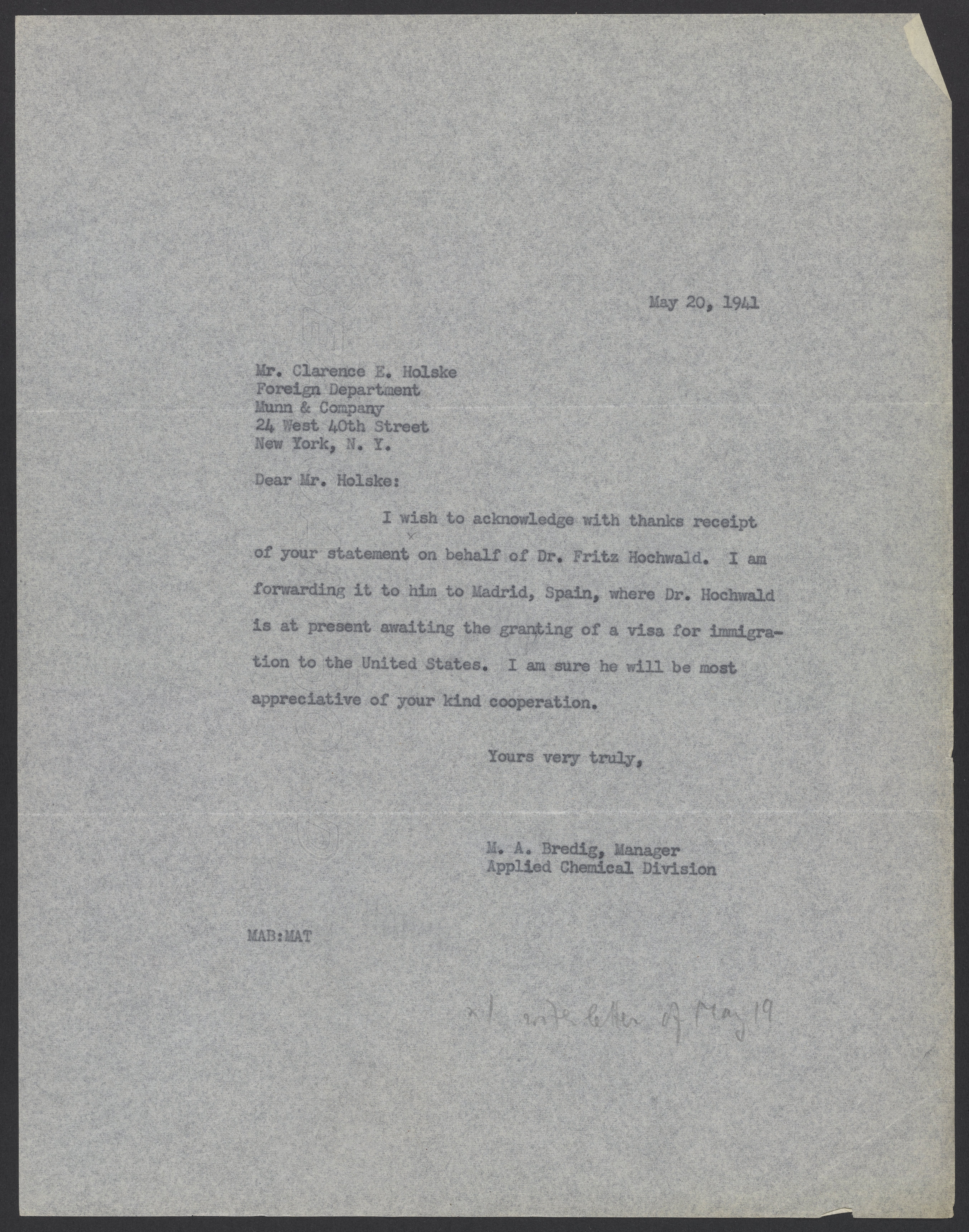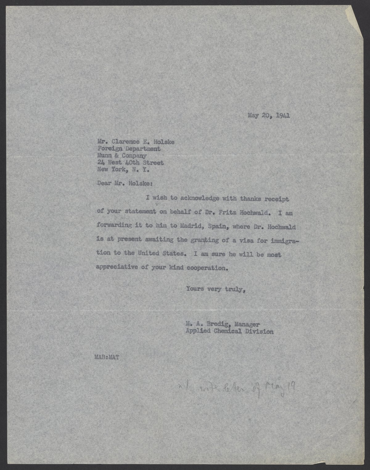 Max Bredig (1902-1977) thanks Clarence. E. Holske of Munn, Liddy, Glaccum, and Kane, a New York-based law firm, for their supporting statement of Bredig's friend and colleague, Fritz Hochwald (1897-1968). This statement will assist Hochwald's immigration visa application to the United States.