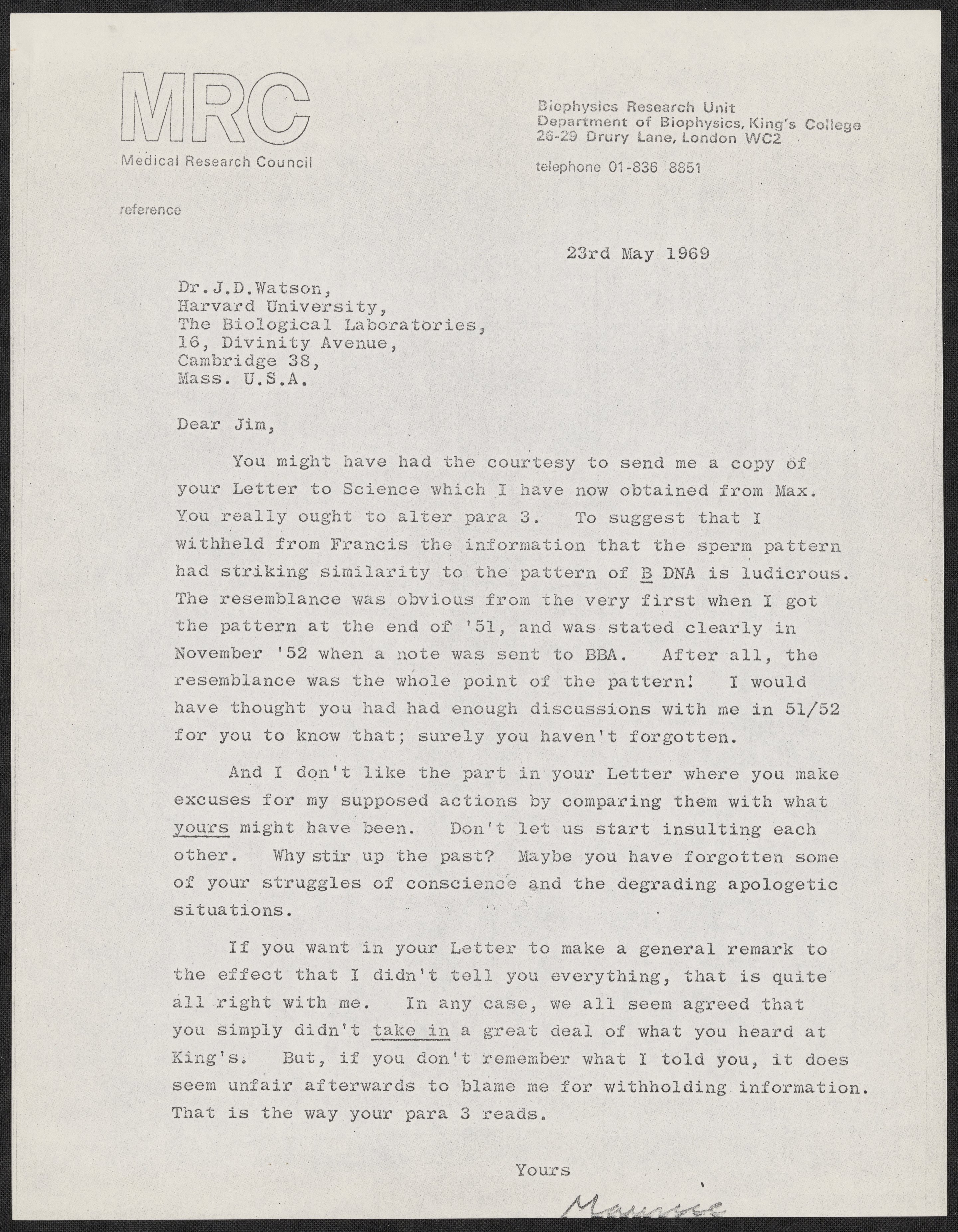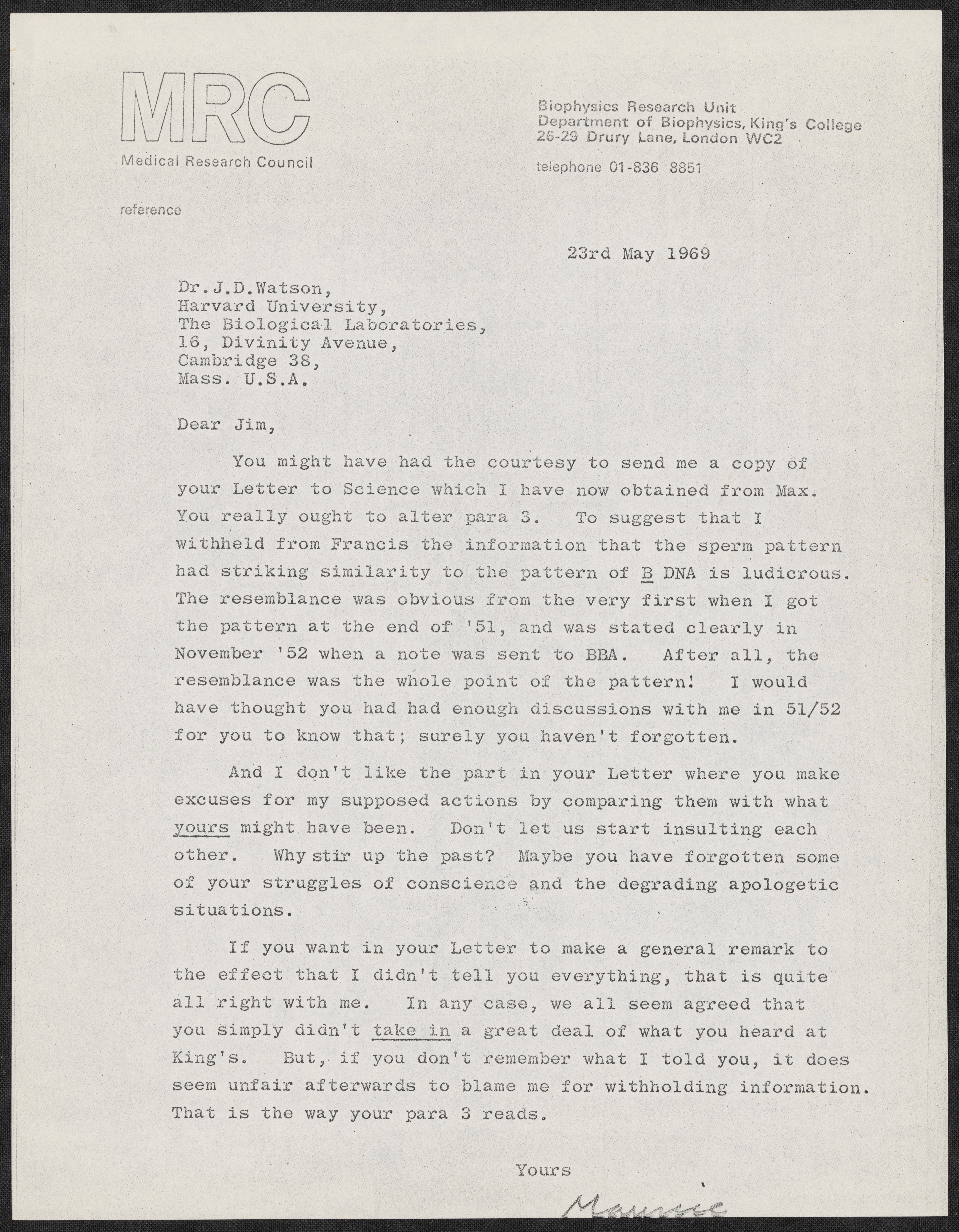 Watson, James D. “Letter from James D. Watson to Max Perutz, May 27, 1969,” May 27, 1969. History of Molecular Biology Collection, Box 88, Folder 3. Science History Institute. Philadelphia. https://digital.sciencehistory.org/works/8smrd02.