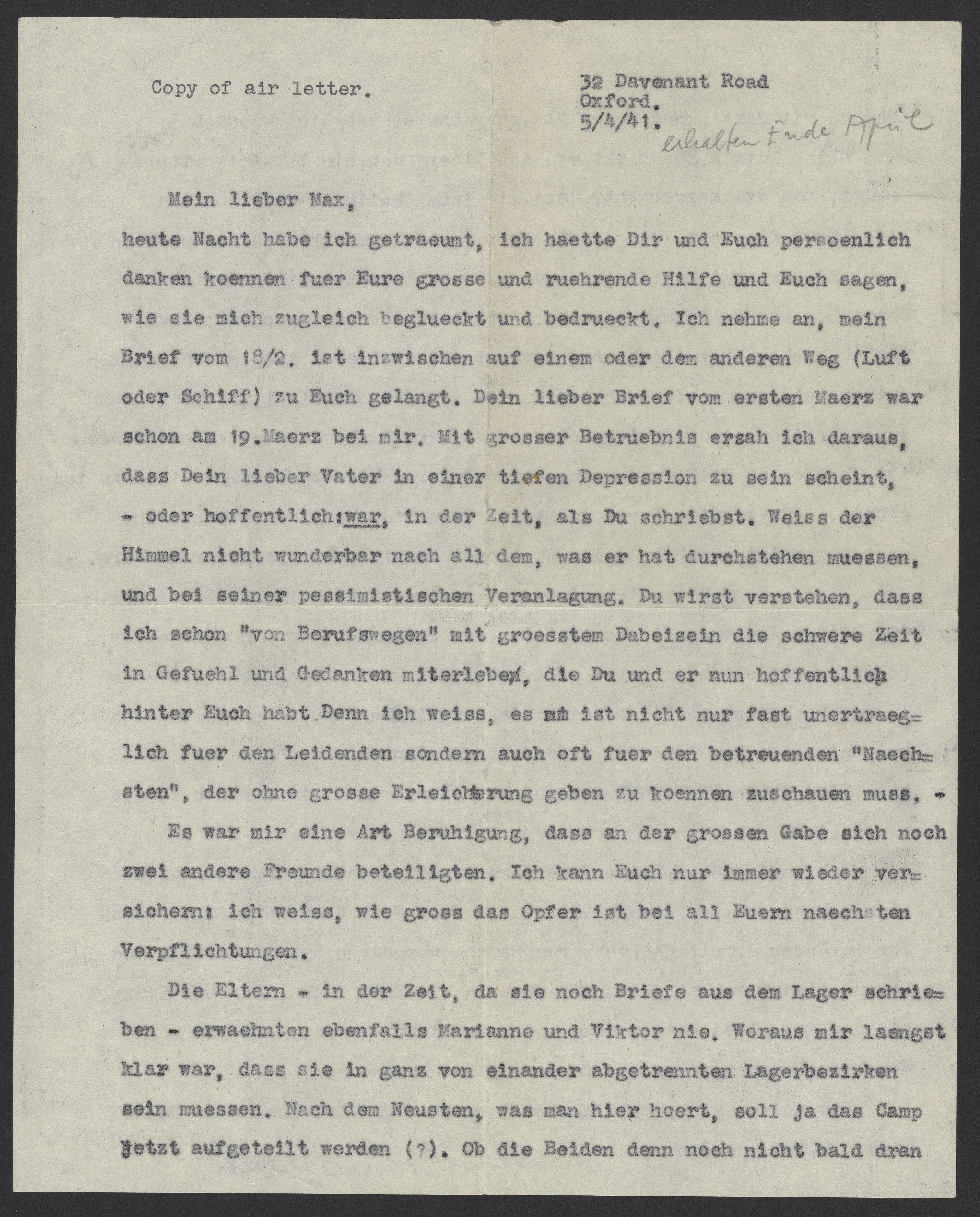 Tonight, I dreamt that I could have thanked you all personally for your immense, gracious help and told you how it concurrently gladdens and afflicts me. I assume that my letter from February 18th has reached you in the meantime one way or another (by air or ship). Your kind letter from March 1st arrived here on March 19th. I was saddened to hear that your dear father appears to be in a state of deep depression, or was, when you wrote. With his pessimistic disposition, heaven must not know what he had to endure. You will understand that even though I am pursuing a career, I am also experiencing the challenges of these difficult times, which you and your father hopefully have behind you now. I realize that this time is unbearable for the victims, but also the caretakers who must observe without being able to provide much solace.