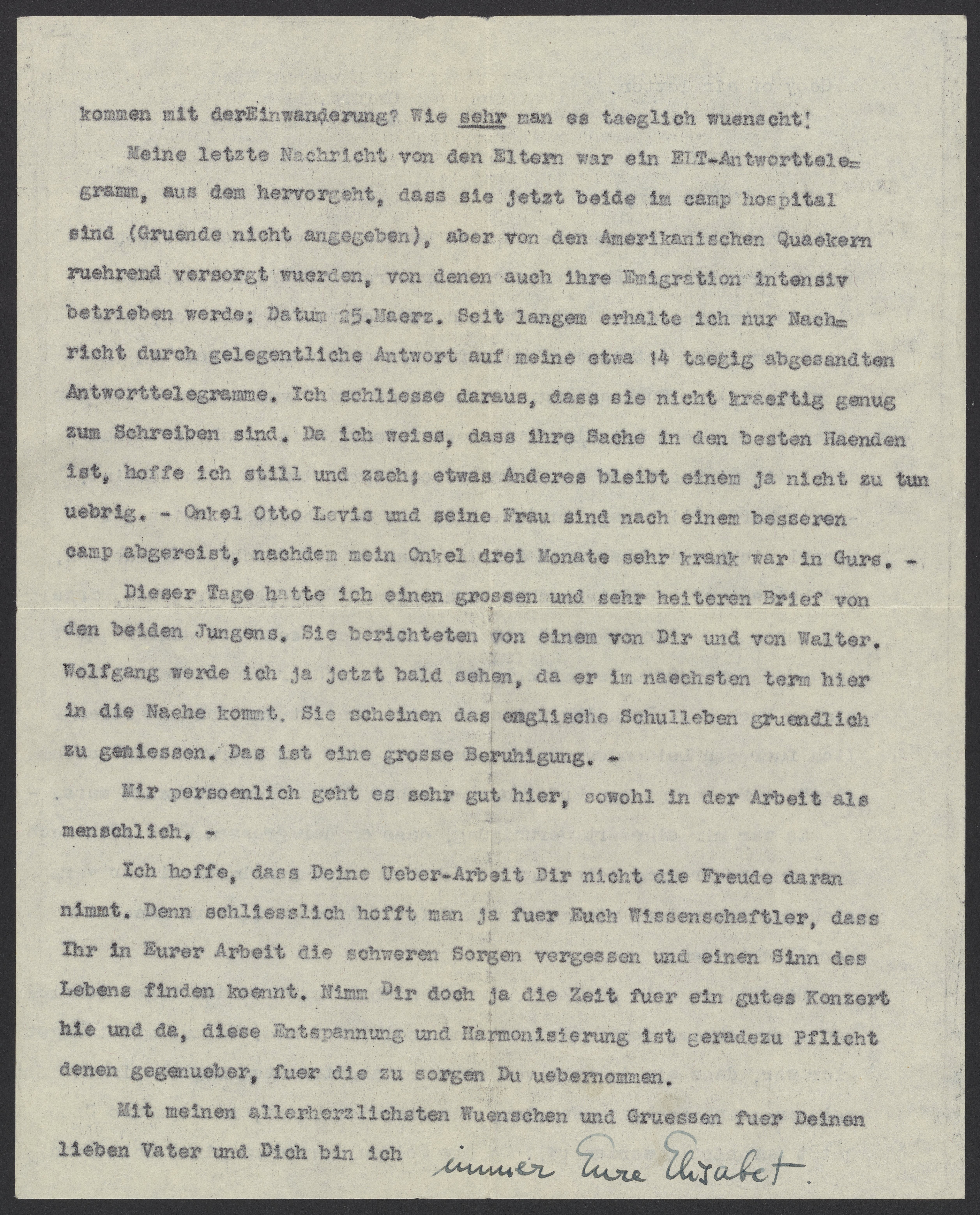 Meine letzte Nachricht von den Eltern war ein ELT-Antworttelegramm, aus dem hervorgeht, dass sie jetzt beide im camp hospital sind (Gruende nicht angegeben), aber von den Amerikanischen Quakern ruehrend versorgt wuerden, von denen auch ihre Emigration intensiv betrieben werde: Datum 25. Maerz. Seit langem erhalte ich nur Nachricht durch gelegentliche Antwort auf meine etwa 14 taegig abgesandten Antworttelegramme. Ich schliesse daraus, dass sie nicht kraeftig genug zum Schreiben sind. Da ich weiss, dass ihre Sache in den besten Haenden ist, hoffe ich still und zaeh; etwas Anderes bleibt einem ja nicht zu tun uebrig. – Onkel Otto Levis und seine Frau sind nach einem besseren camp abgereist, nachdem mein drei Monate sehr krank war in Gurs.