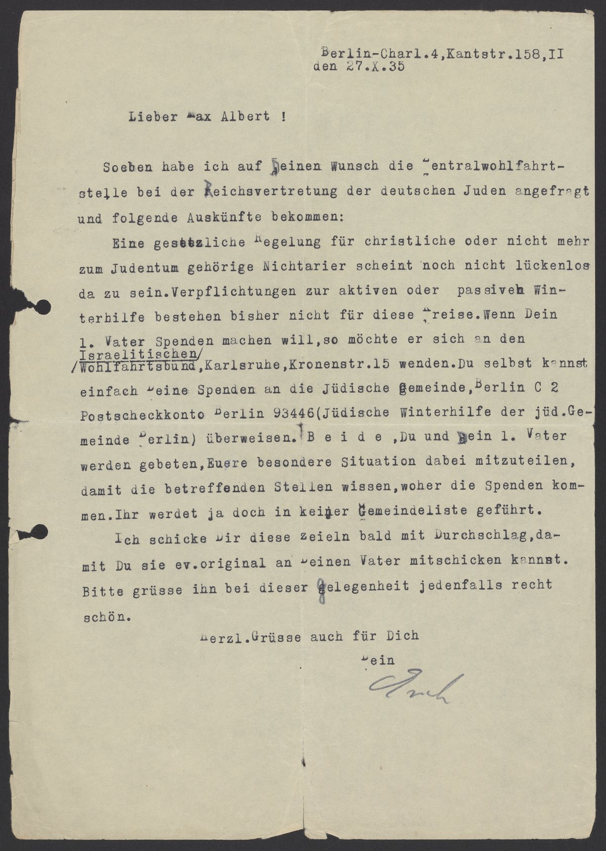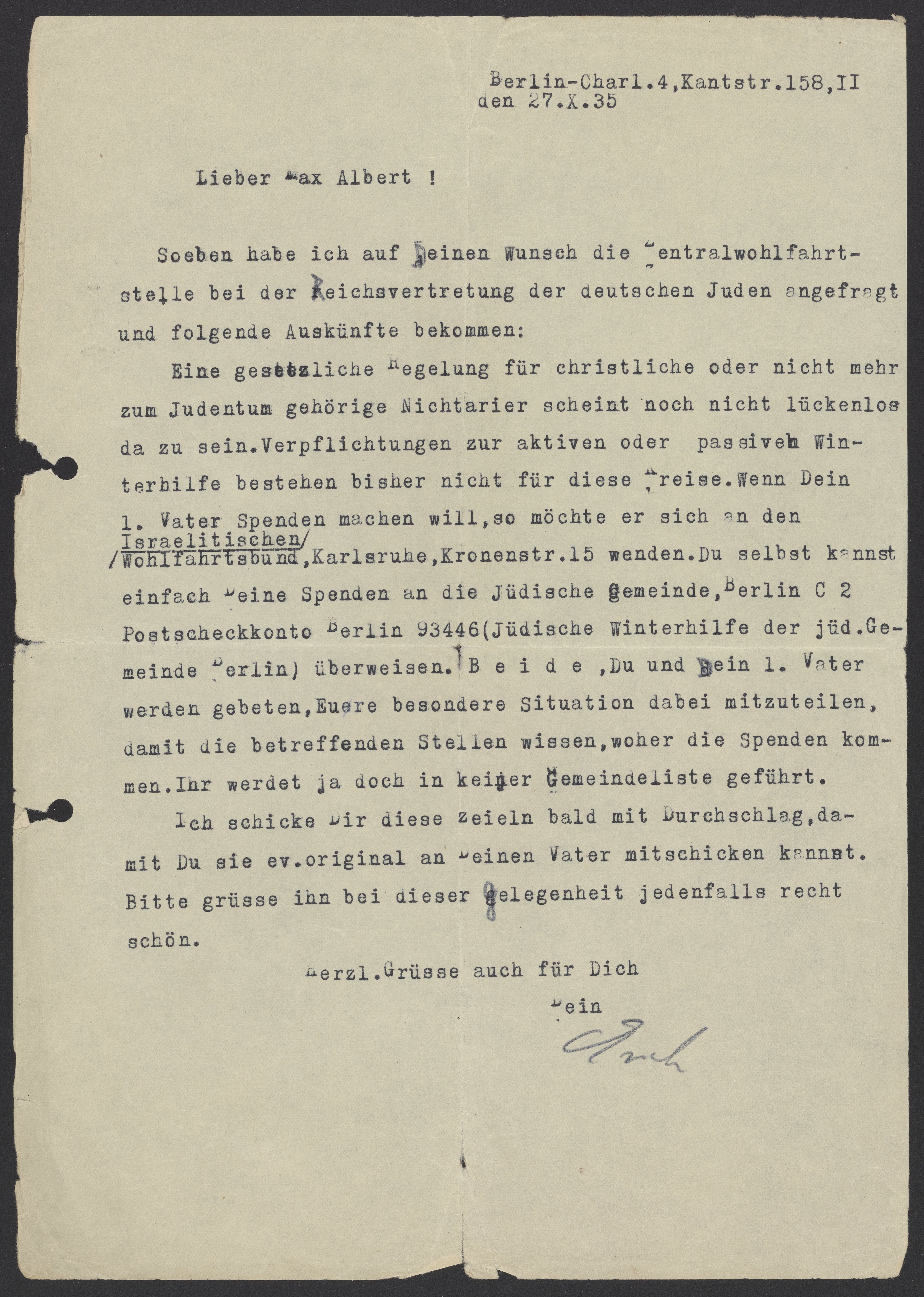 Eine gesetzliche Regelung für christliche oder nicht mehr zum Judentum gehörige Nichtarier scheint noch nicht lückenlos da zu sein. Verpflichtungen zur aktiven oder passiven Winterhilfe bestehen bisher nicht für diese Kreise. Wenn Dein 1. Vater Spenden machen will, so möchte er sich an den Israelitischen Wohlfahrtsbund, Karlsruhe, Kronenstr.15 wenden. Du selbst kannst einfach Deine Spenden an die Jüdische Gemeinde, Berlin C2 Postscheckkonto Berlin 93446 (Jüdische Winterhilfe der jüd. Gemeinde Berlin) überweisen. Beide, due und Dein 1. Vater werden gebeten, Euere besondere Situation dabei mitzuteilen, damit die betreffenden Stellen wissen. Ihr werdet ja doch in keiner Gemeindeliste geführt.
