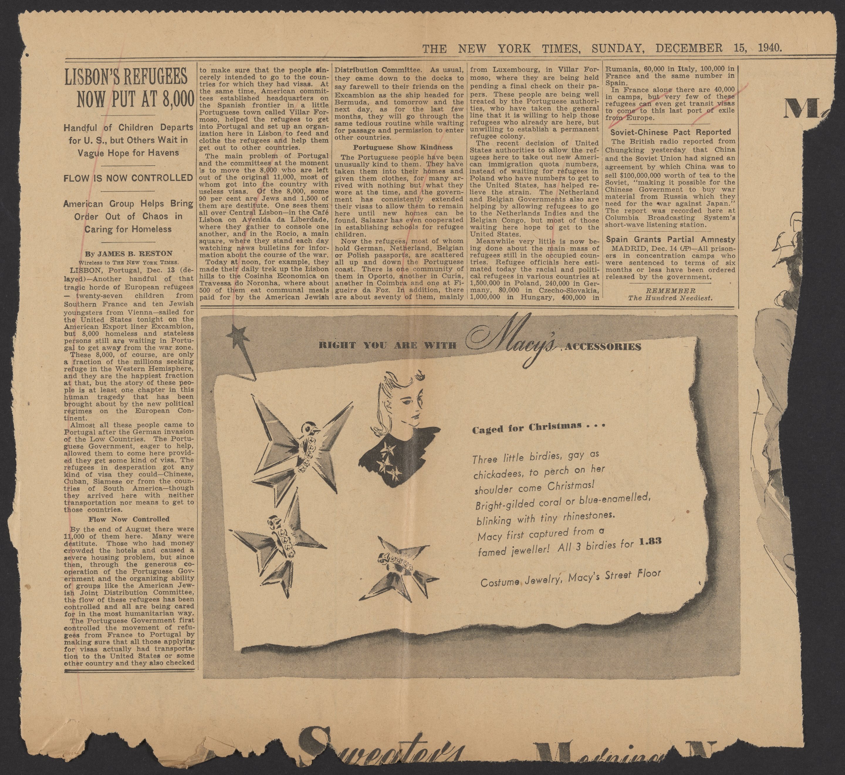 Reston, James. “Lisbon's Refugees Now Put At 8,000.” New York times, December 15, 1940. Papers of Max Bredig, Box 8, Folder 8. Science History Institute. Philadelphia. https://digital.sciencehistory.org/works/8tn4gwm.