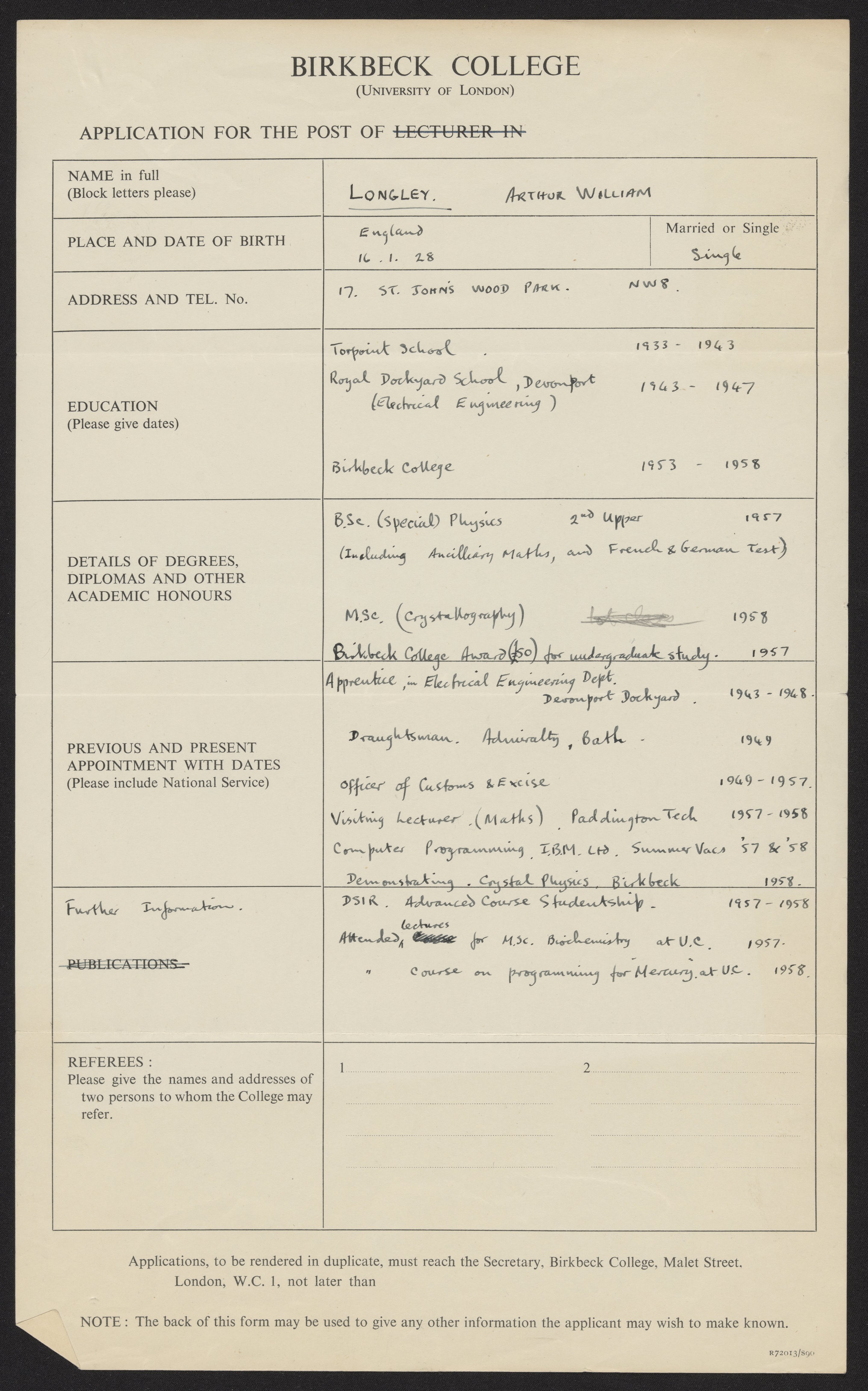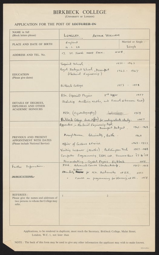 Arthur William Longley's application to Birkbeck College