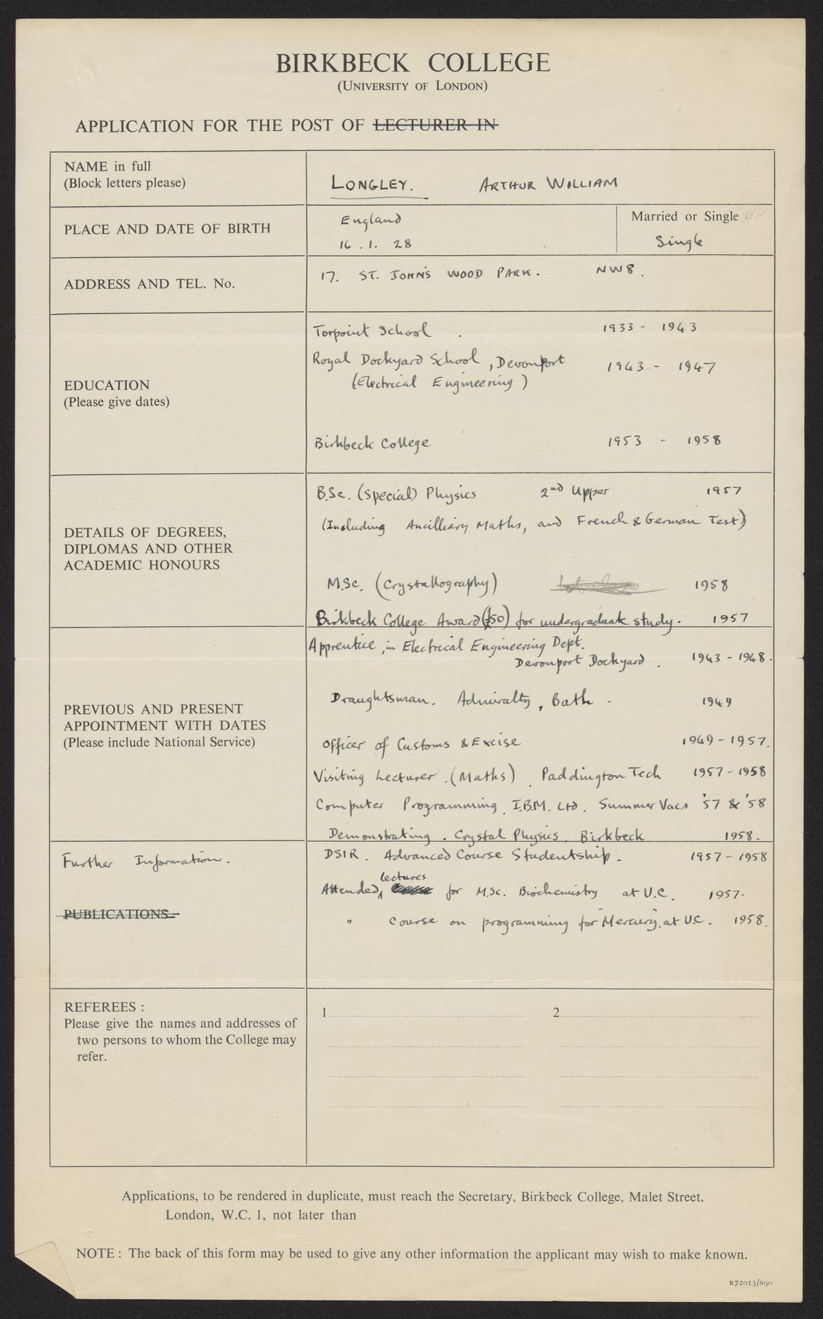 Arthur William Longley's application to Birkbeck College