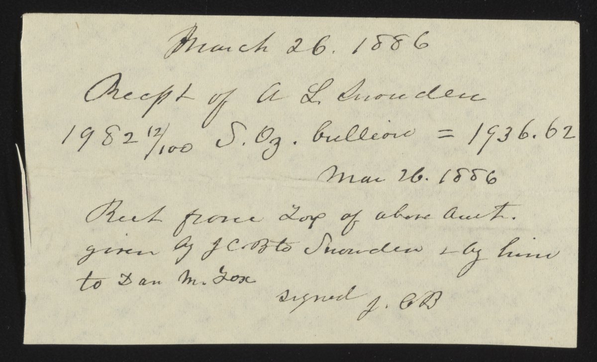 Booth, James Curtis. “Receipt for Bullion Received by A.L. Snowden from James C. Booth,” March 26, 1886. Papers of James Curtis Booth, Box 7, Folder 12. Science History Institute. Philadelphia. https://digital.sciencehistory.org/works/8w32r6159.