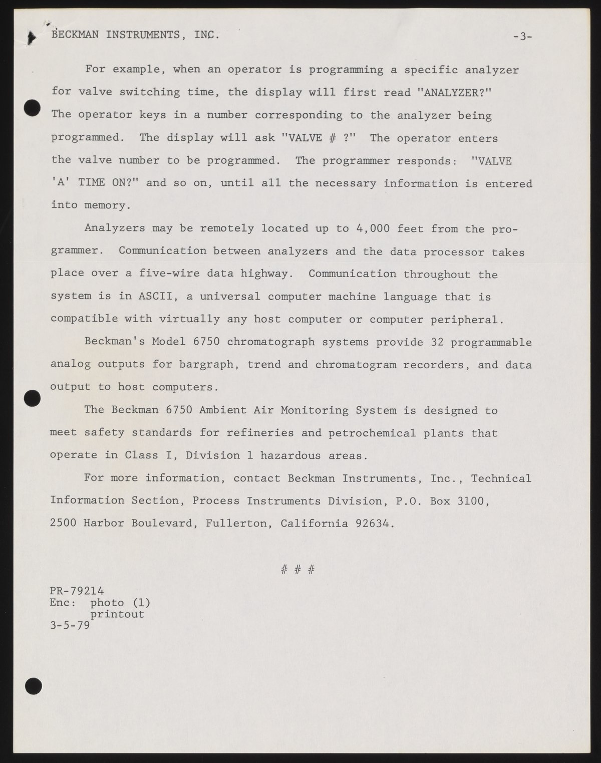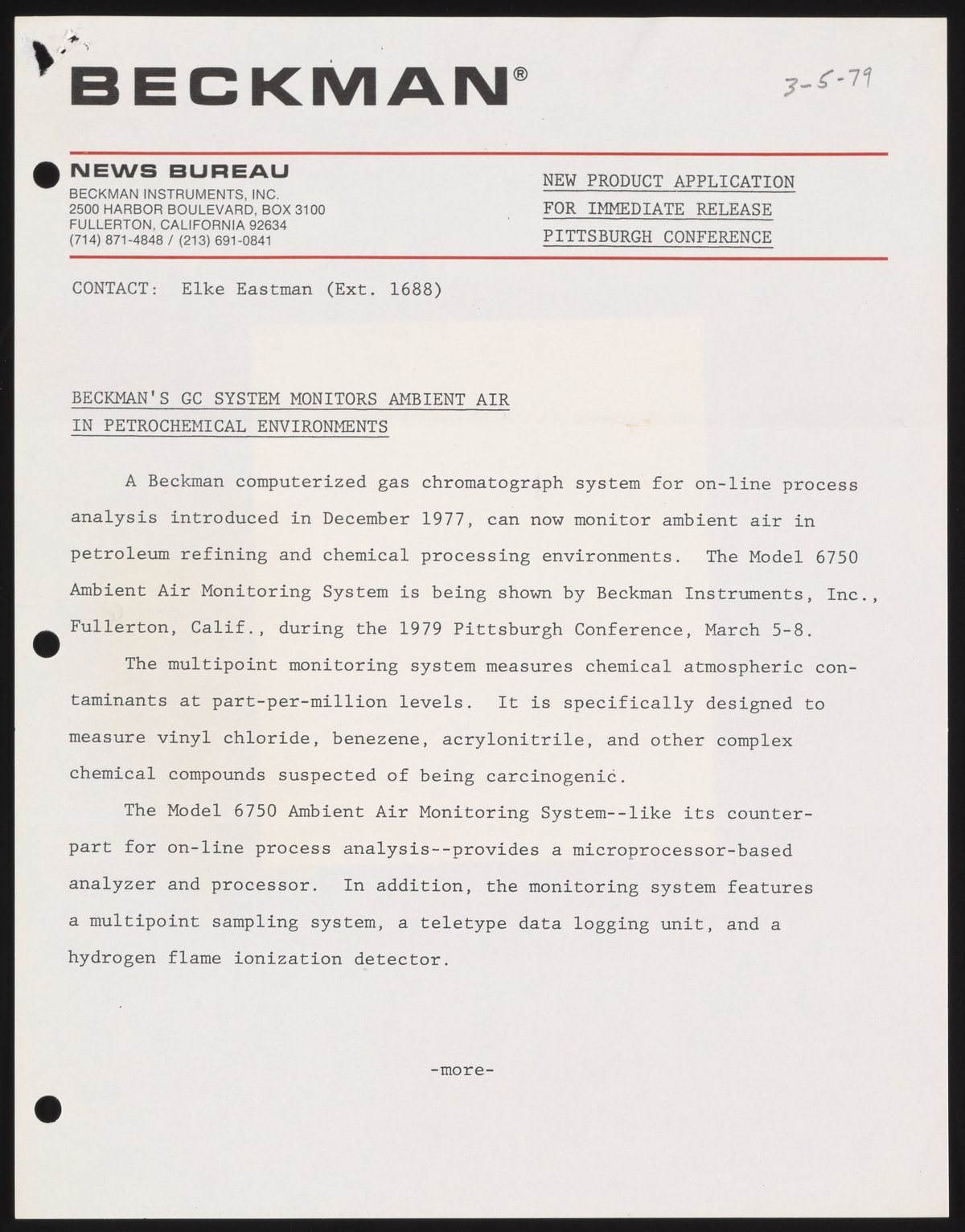 Eastman, Elke. “Beckman's GC System Monitors Ambient Air in Petrochemical Environments,” March 5, 1979. Beckman Historical Collection, Box 58, Folder 68. Science History Institute. Philadelphia. https://digital.sciencehistory.org/works/8w32r628c.