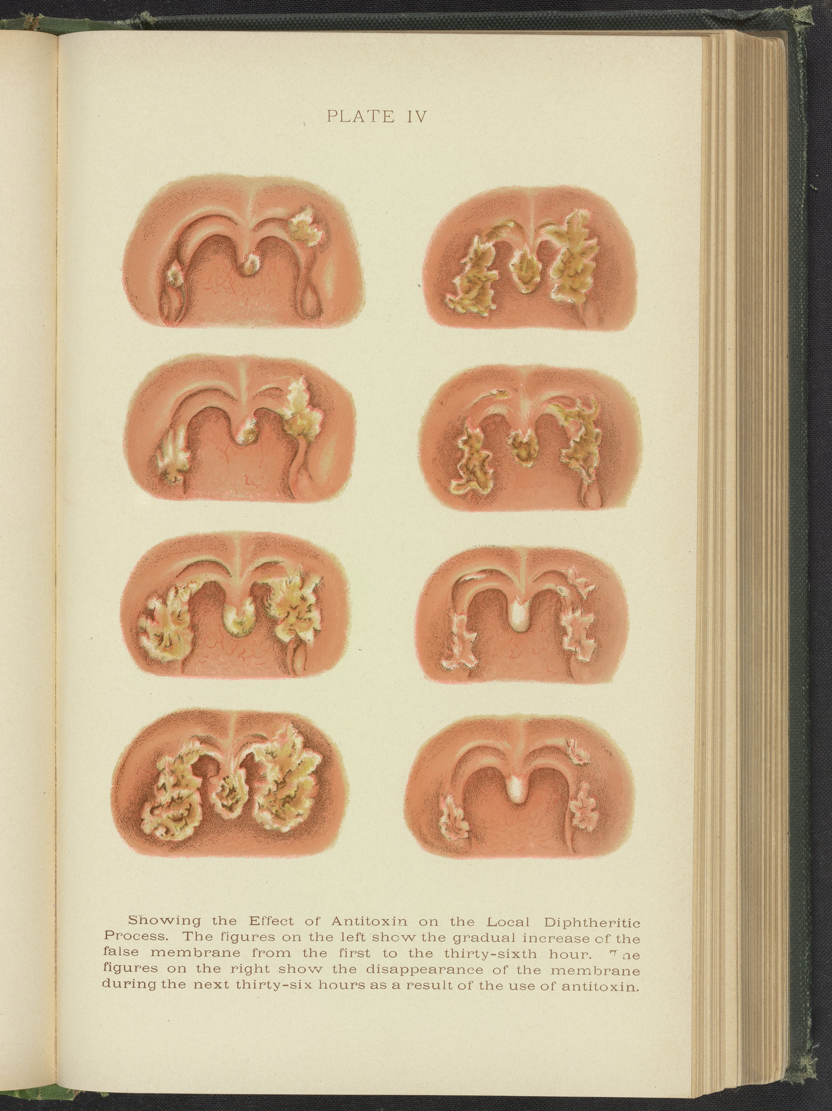 Hare, H.A. (Hobart Armory). “Plate IV: Showing the Effect of Antitoxin on the Local Diphtheritic Process.” A Text-Book of Practical Therapeutics, with Especial Reference to the Application of Remedial Measures to Disease and Their Employment upon a Rational Basis, 1909. https://digital.sciencehistory.org/works/8w32r668b.