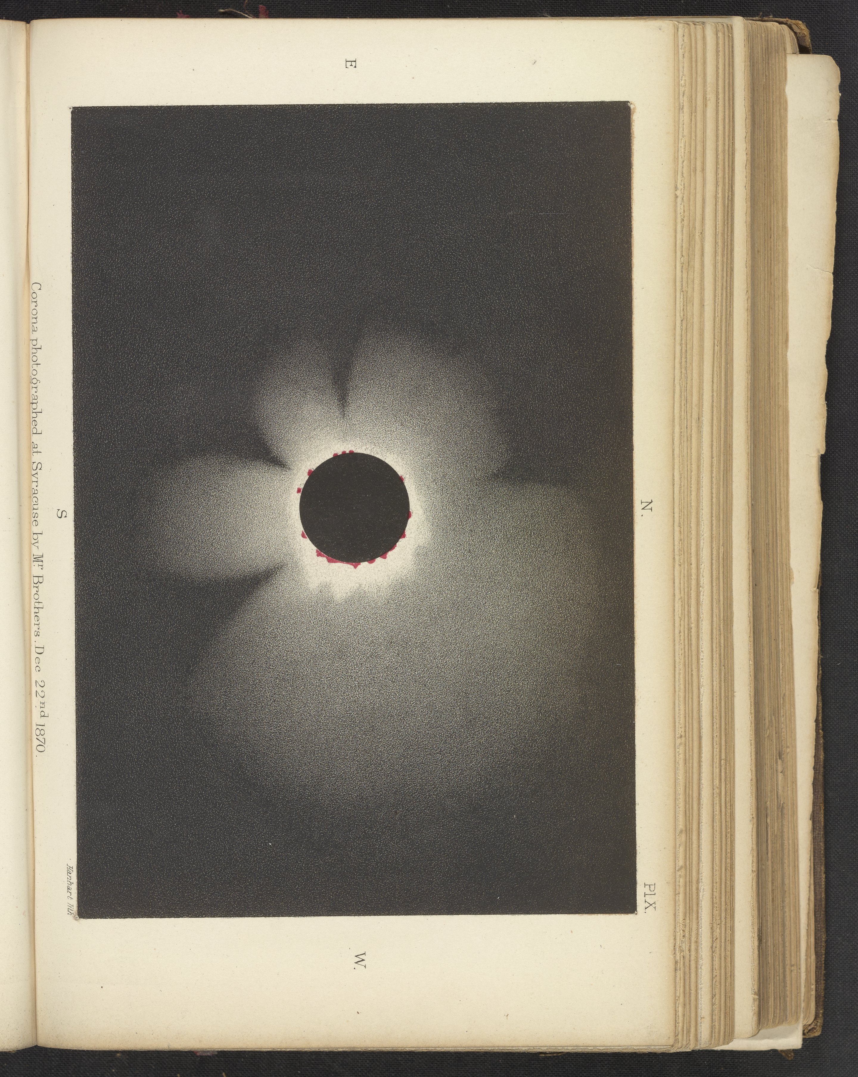 Schellen, Heinrich. “Corona Photographed at Syracuse by Mr. Brothers, Dec 22nd, 1870.” Spectrum Analysis in Its Application to Terrestrial Substances, and the Physical Constitution of the Heavenly Bodies. London, England: M. & N. Hanhart (Printers), 1872. https://digital.sciencehistory.org/works/8w32r687j.