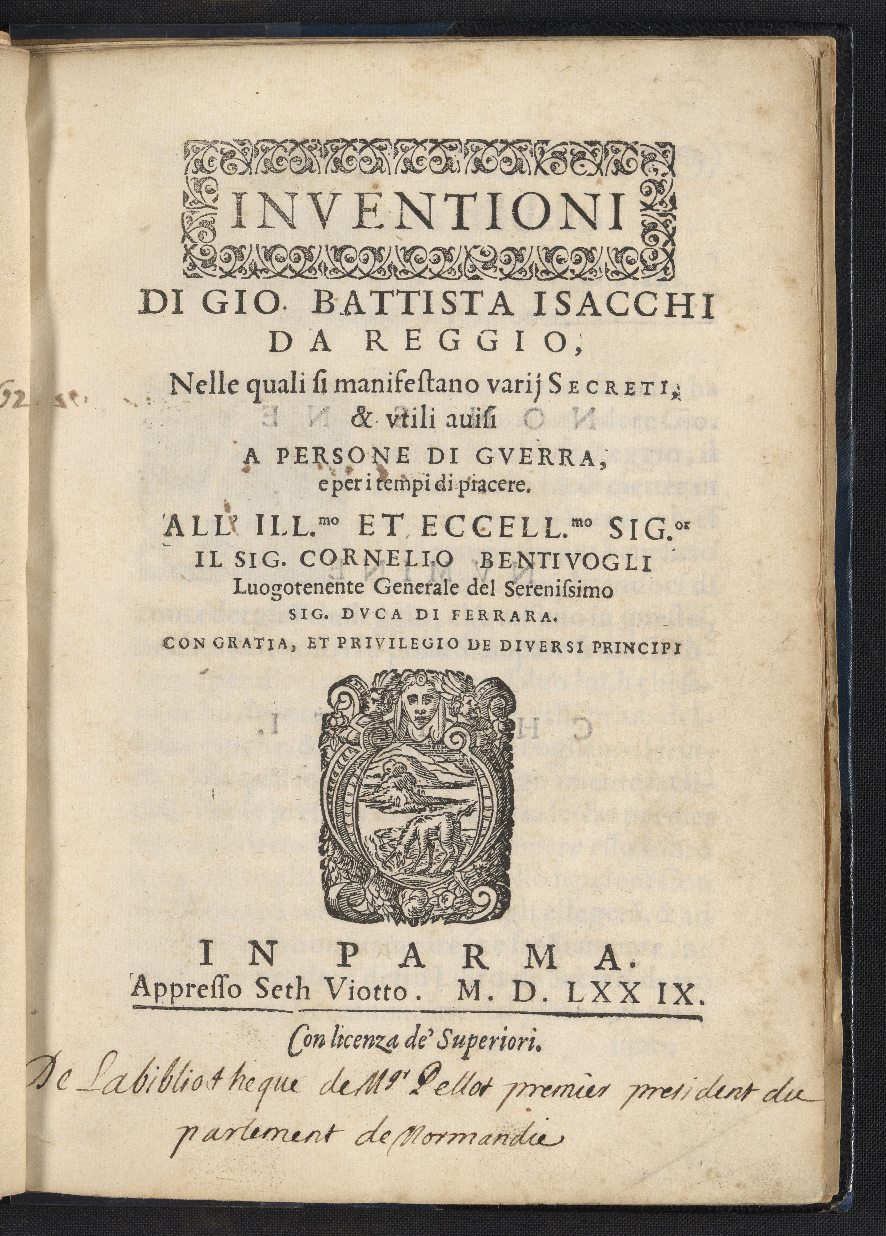 Isacchi, Giovanni Battista. Inventioni, Nelle Quali Si Manifestano Varij Secret, e Utili Avisi a Persone Di Guerra, e per i Tempi Di Piacere, 1579. https://digital.sciencehistory.org/works/8zryxyr.