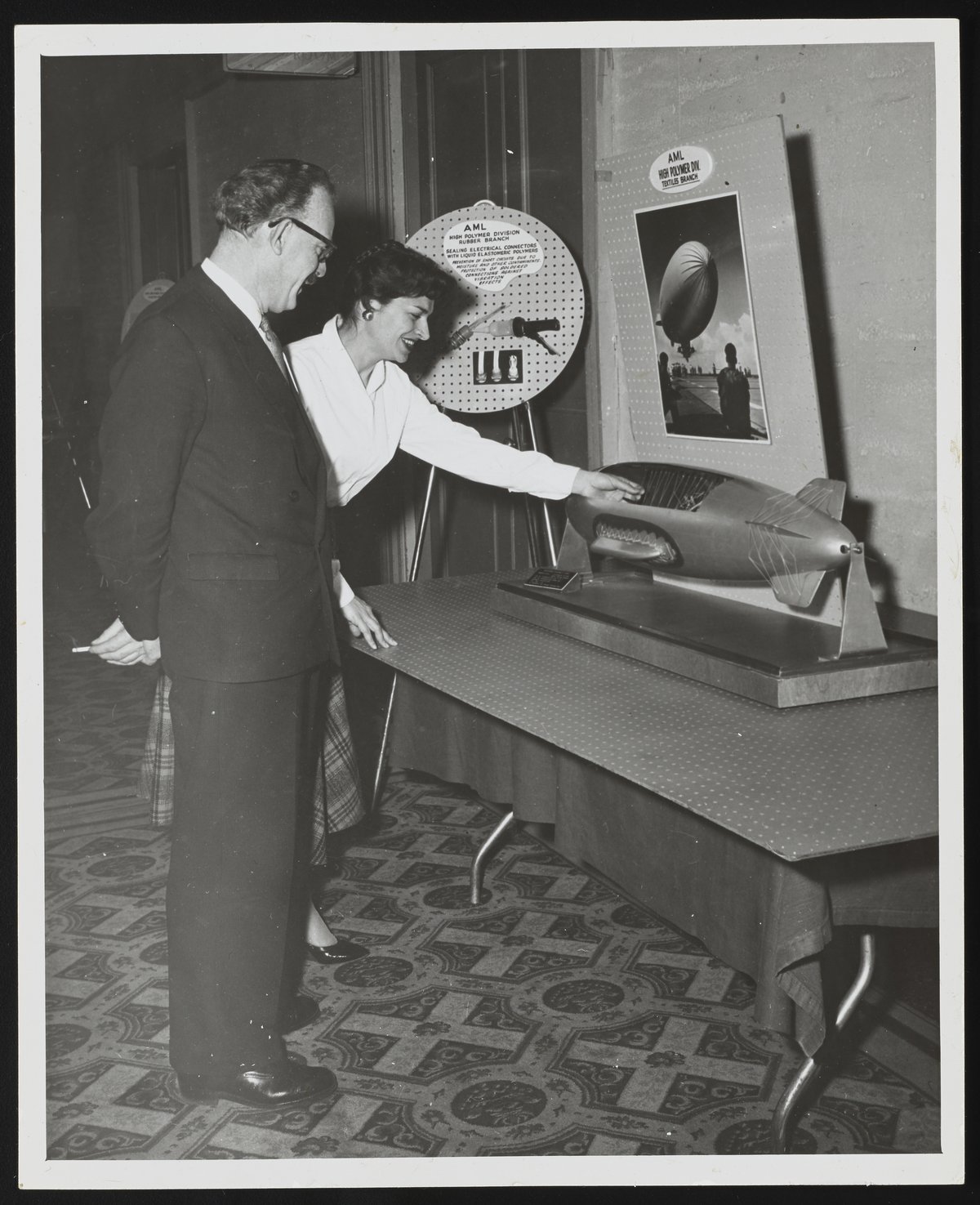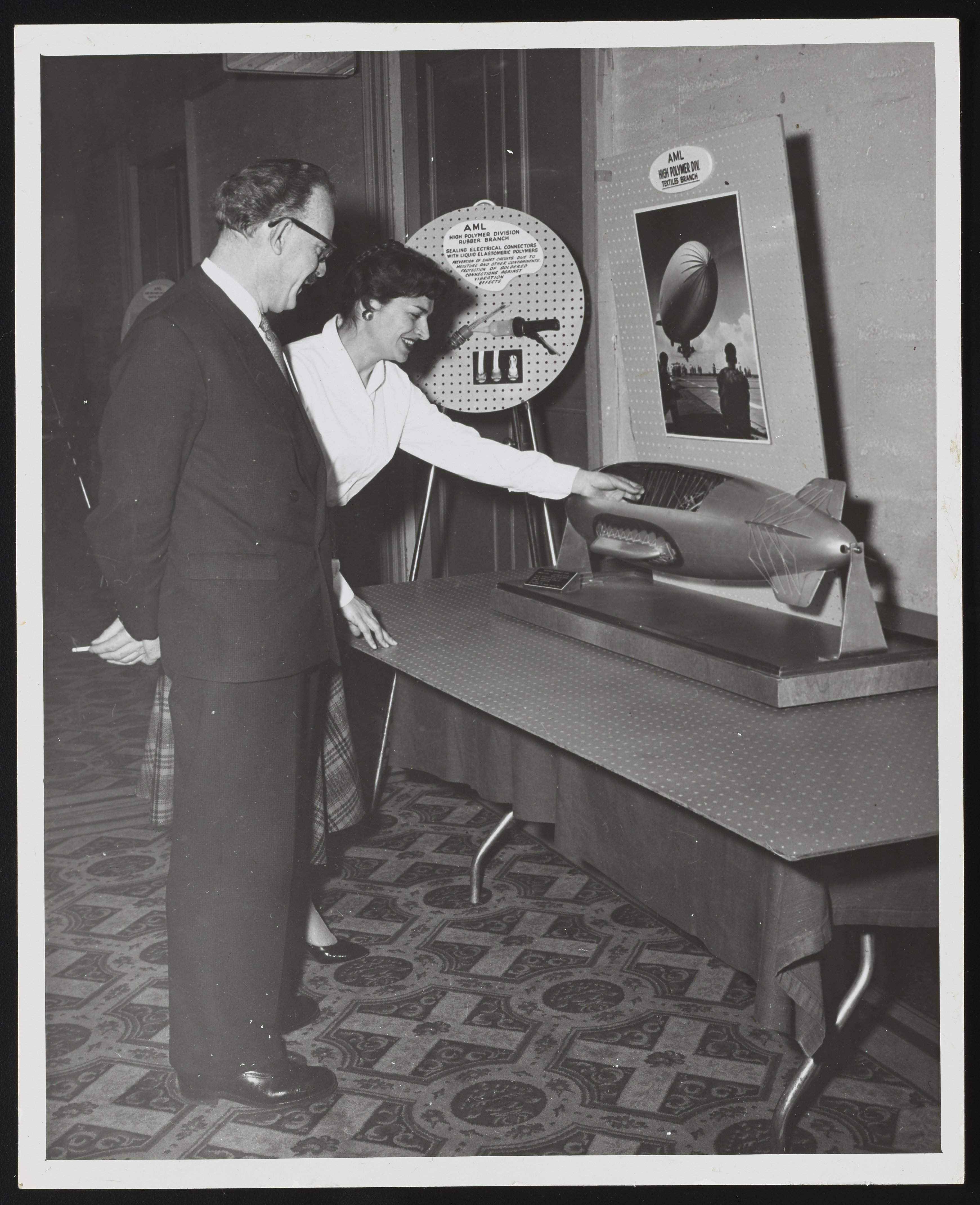 Eleanor Vadala, chemist, and Dr. Earl Hayes, U.S. Defense Department, examining a display of airship fabric produced at the Naval Air Material Center. Ms. Vadala demonstrates the threads on an airship model while Dr. Hayes looks on. Several wall displays highlighting the rubber and textile branches of the Aeronautical Materials Laboratory's High Polymer Division are also visible.