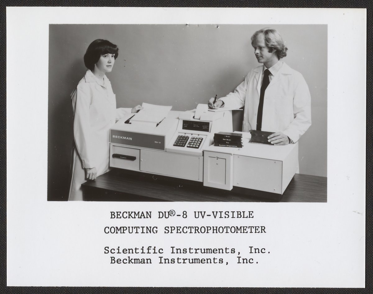 “Man and Woman with Beckman DU-8 UV-Visible Computing Spectrophotometer,” circa 1980. Beckman Historical Collection, Box 84. Science History Institute. Philadelphia. https://digital.sciencehistory.org/works/9019s270q.