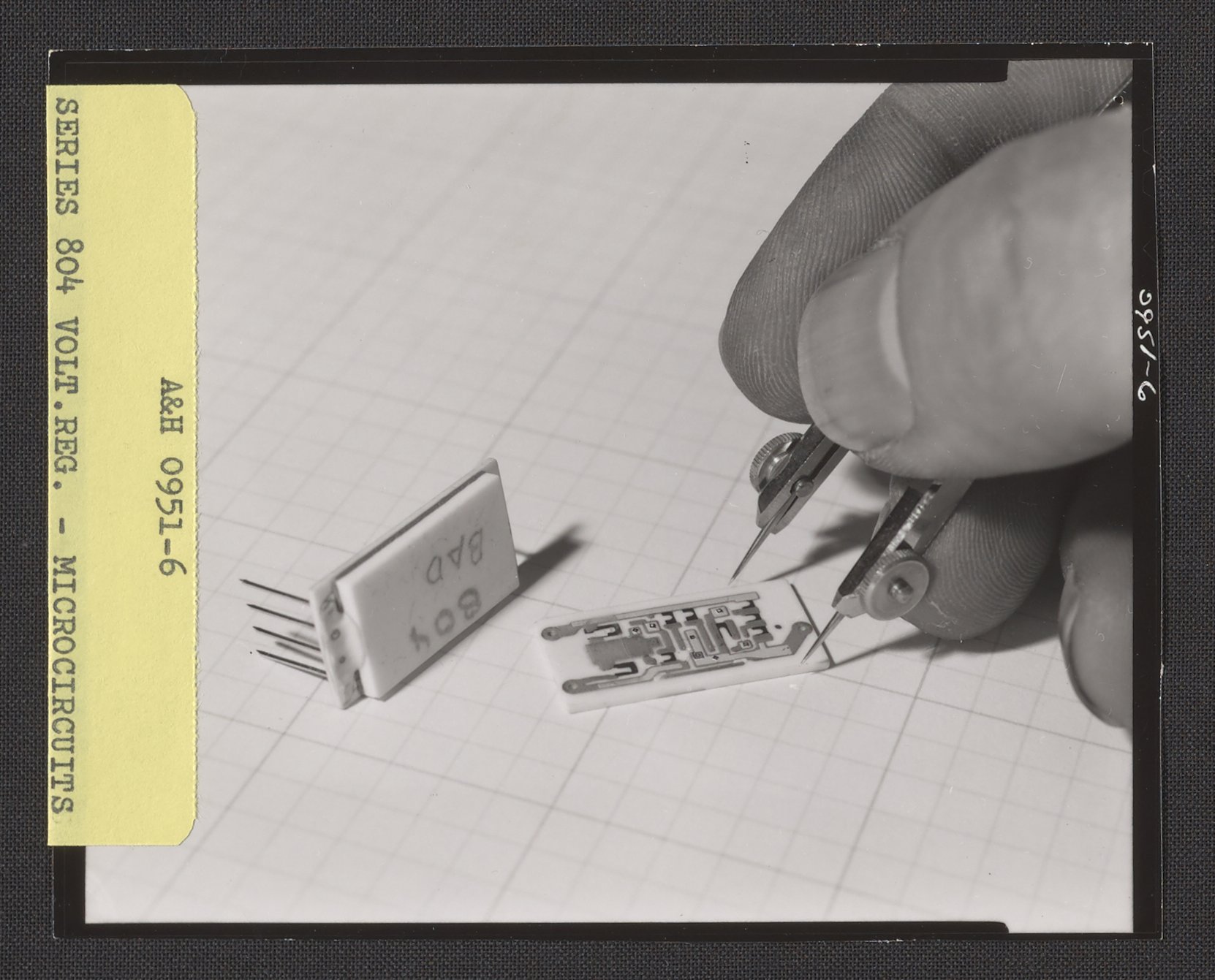 Voltage regulators maintain a constant voltage level in electrical devices. This photograph is part of a series of marketing images used to demonstrate the small size of Helipot products.