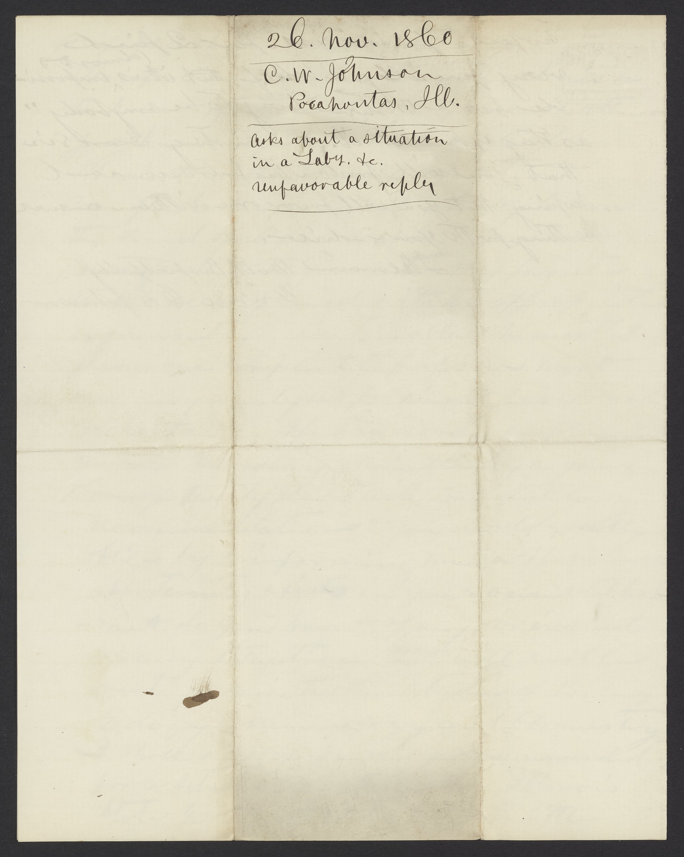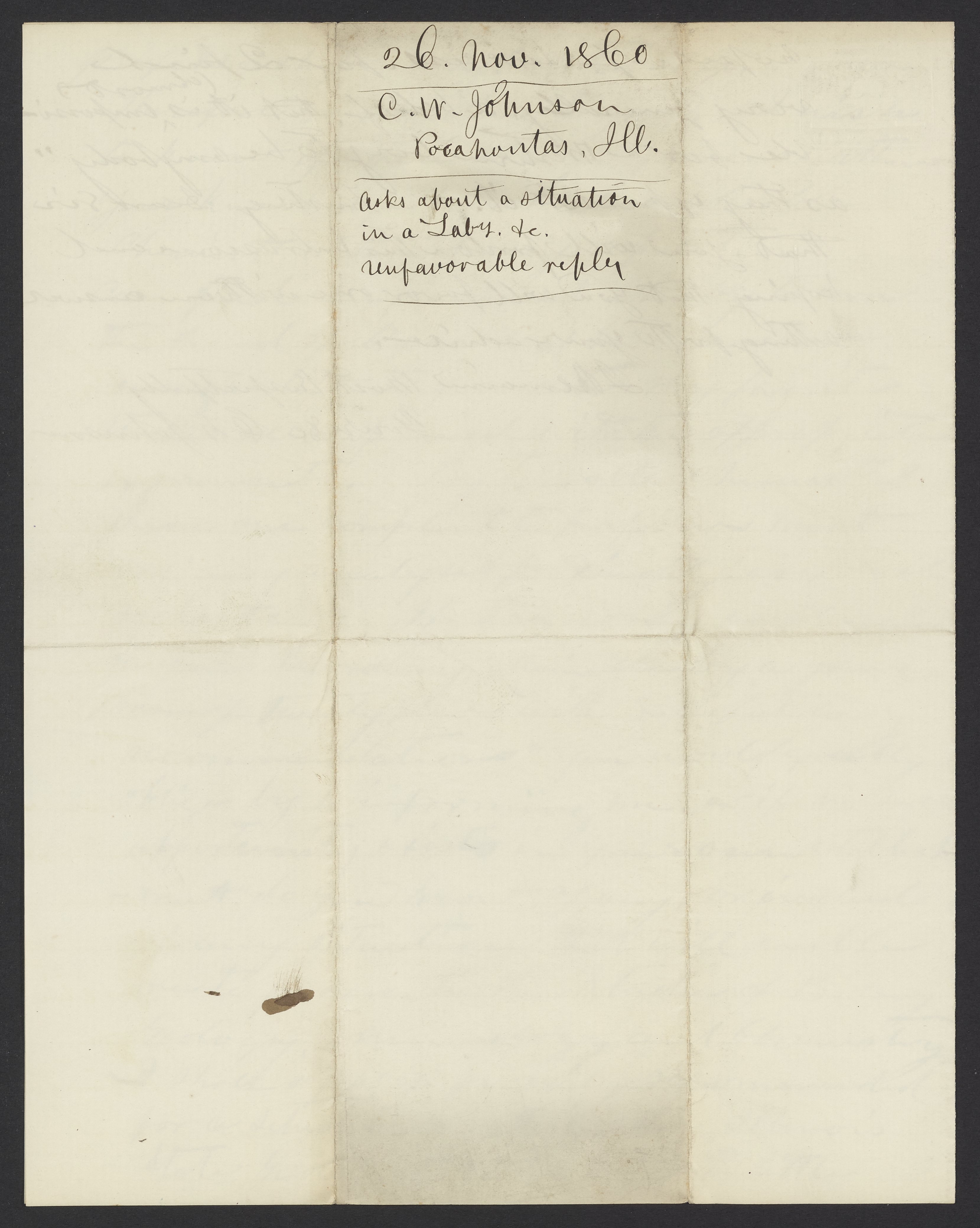 Small JPG1200 x 1508px — 254 KBLarge JPG2880 x 3620px — 1.1 MBFull-sized JPG3318 x 4170px — 1.4 MBOriginal fileTIFF — 3318 x 4170px — 39.6 MBC. W. Johnson, seeking employment, writes to James Curtis Booth (1810-1888) to see if there is any "employment in your laboratory attainable by a young man of twenty-five 'with satisfactory recommendation'."