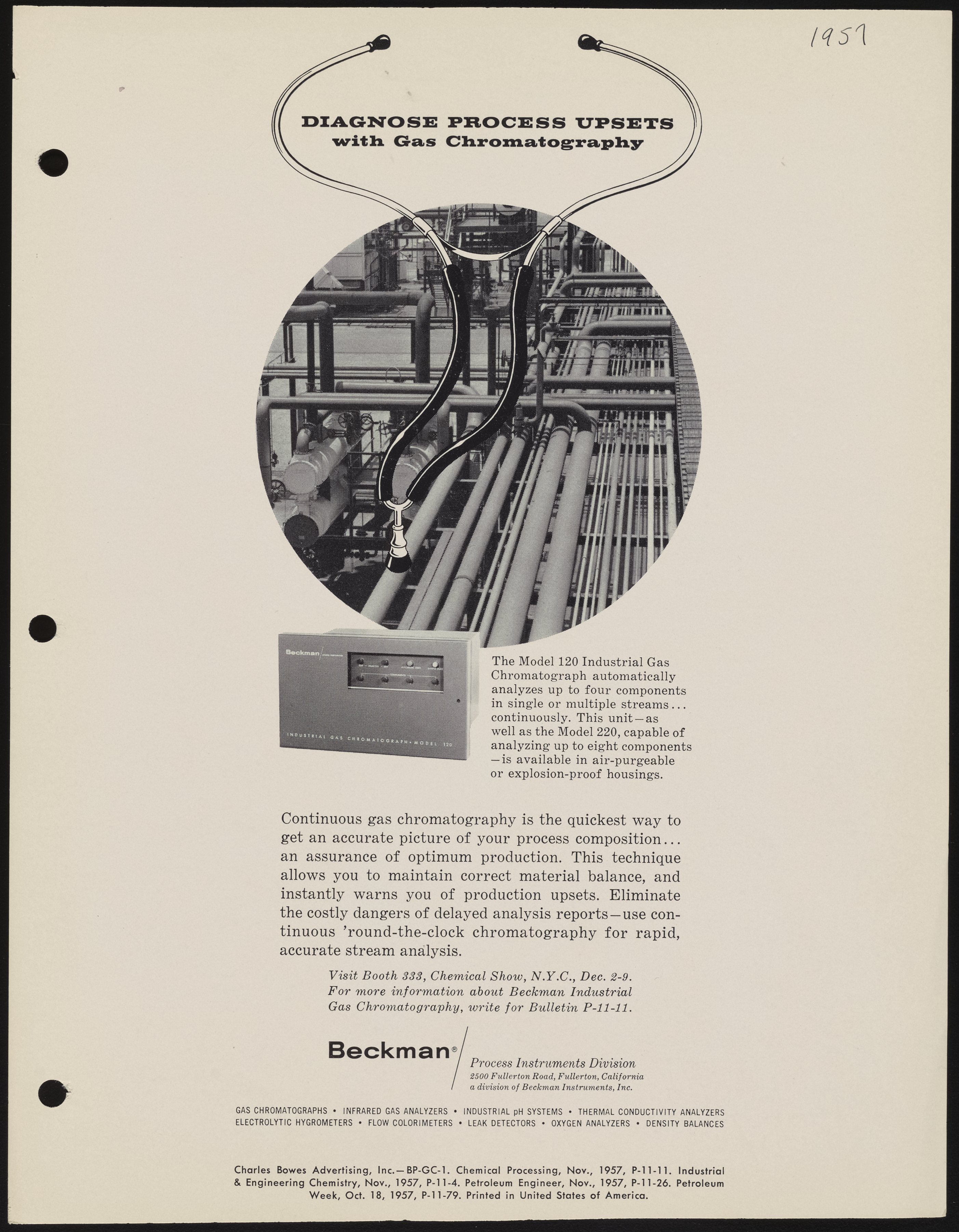 Beckman Instruments, Inc., and Charles Bowes Advertising. “Diagnose Process Upsets with Gas Chromatography,” 1957. Beckman Historical Collection, Box 49, Folder 14. Science History Institute. Philadelphia. https://digital.sciencehistory.org/works/9306sz292.