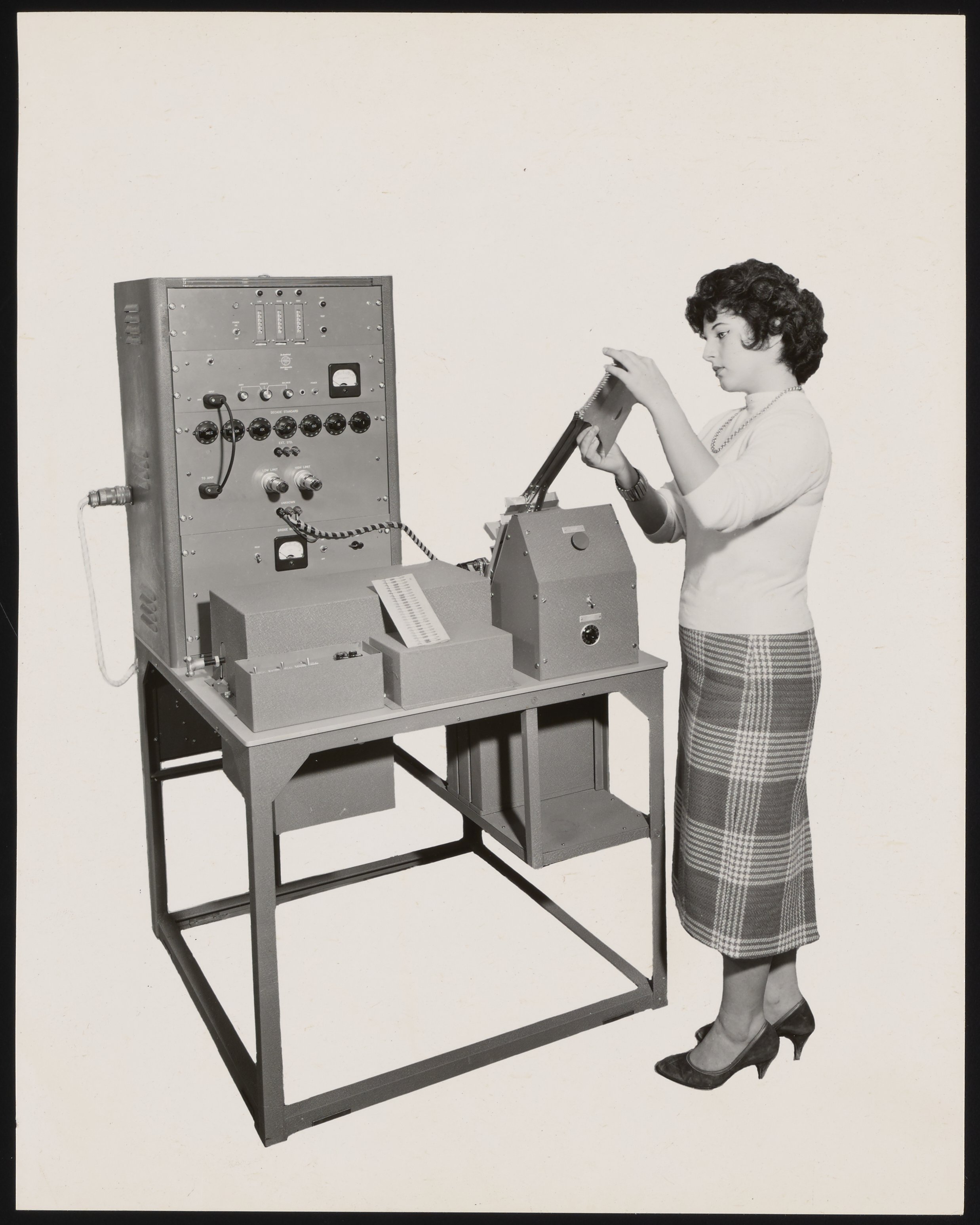 Woman using a Beckman Model AB-4-5 Sorting Bridge