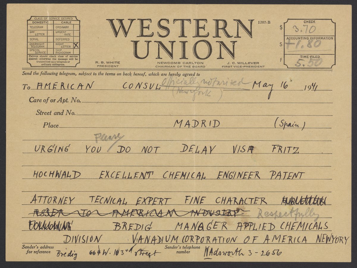 Max Bredig (1902-1977) asks the American Consul in Madrid, Spain to give Fritz Hochwald (1897-1968) an American visa. In the telegram he praises Hochwald, calling him an excellent chemical engineer.