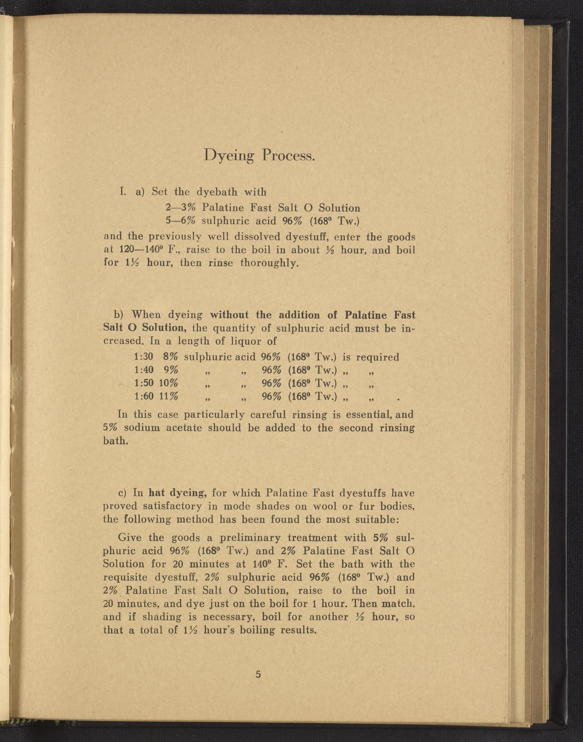 Small JPG1200 x 1564px — 285 KBLarge JPG2880 x 3754px — 1.7 MBFull-sized JPG4055 x 5285px — 3.3 MBOriginal fileTIFF — 4055 x 5285px — 61.3 MBSample book for Palatine fast dyes, a trade name for metal-complex dyes where chromium is incorporated into the dyestuffs molecule by the manufacturer. The process for Palatine fast dyes was achieved around 1915 by I.G. Farben Industries AG, and the dyes were widely used for wool in "suitings and better dress goods," as well as "knitting, weaving, and carpet yarns." The text describes the dyeing process and contains mounted yarn samples with dye concentrations and information on color fastness to various effects, such as washing, milling, and perspiration.