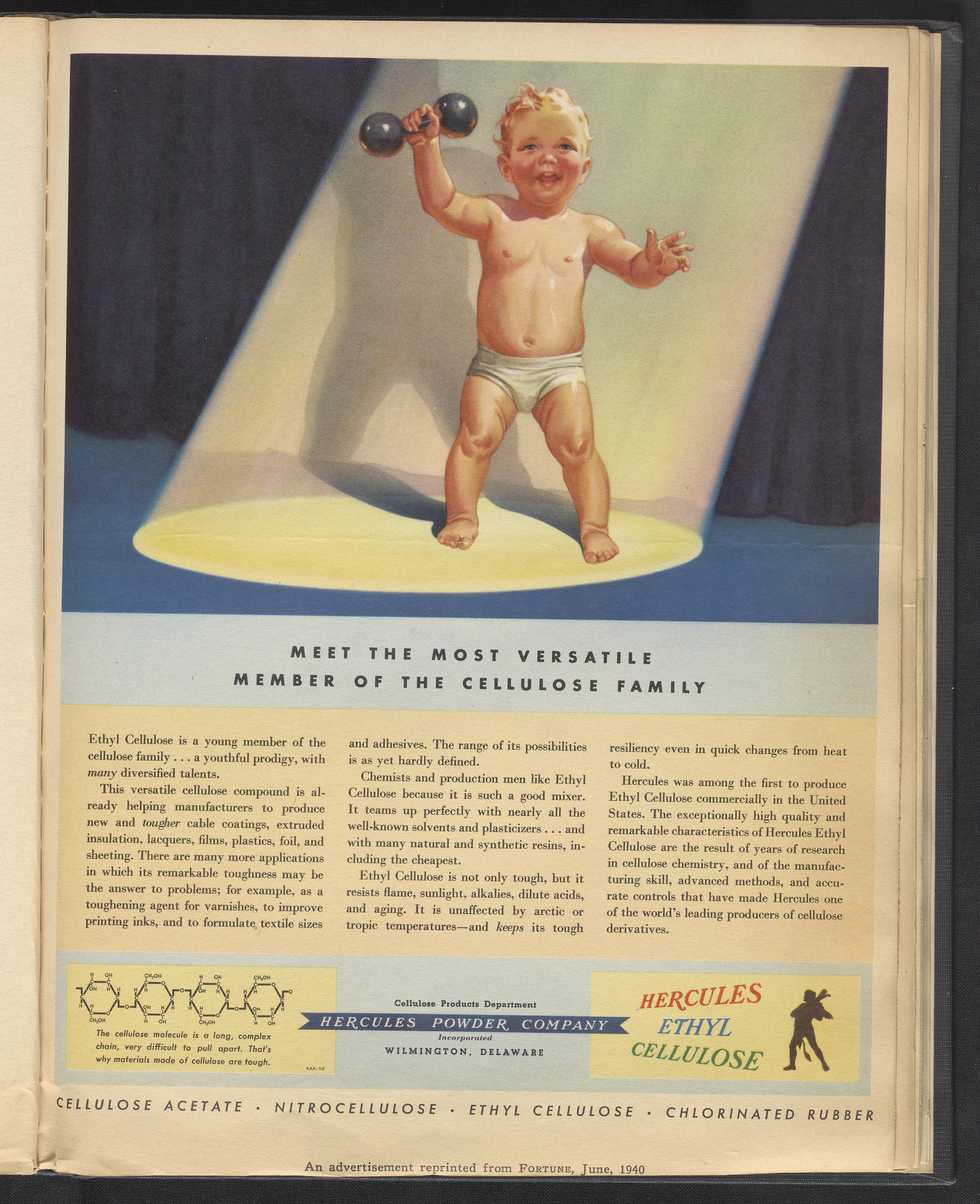 Advertisement for Ethyl Cellulose manufactured and sold by the Hercules Powder Company for use as a toughening agent in cable coatings, lacquers, films, plastics, and varnishes, among other applications. The advertisement features a baby standing in a spotlight holding a dumbbell, an image intended to underscore the toughness and resiliency of Hercules Ethyl Cellulose relative to its newness. This advertisement appeared in the June 1940 edition of Fortune magazine.