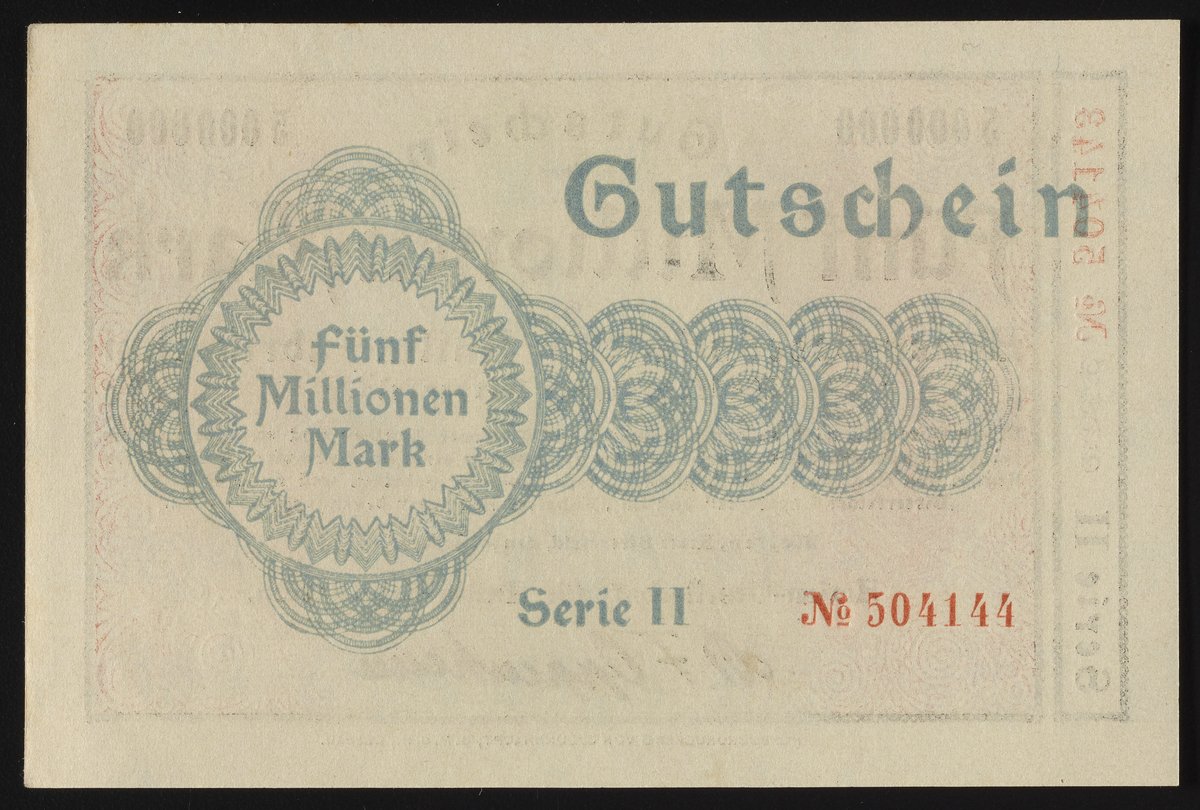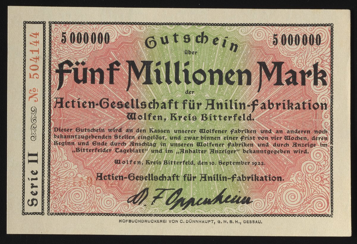 Small JPG1200 x 821px — 296 KBLarge JPG2880 x 1969px — 1.4 MBFull-sized JPG3492 x 2388px — 1.9 MBOriginal fileTIFF — 3492 x 2388px — 23.9 MBThis Fünf Millionen Mark Gutschein, or five million Mark voucher, was issued by Aktiengesellschaft für Anilinfabrikation for their manufacturing facility in Wolfen, Kreis Bitterfeld, Germany. The frontside includes the terms of the voucher. Watermark design consists of a repeated pattern of the company name Agfa.